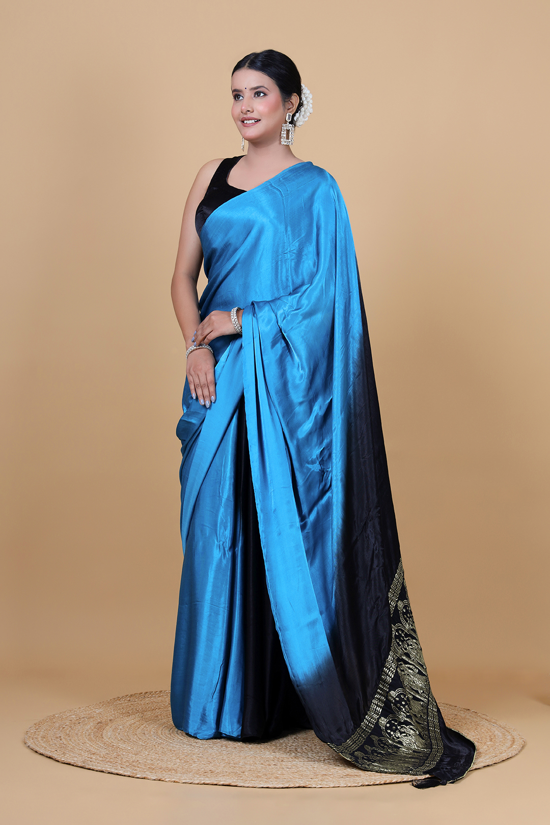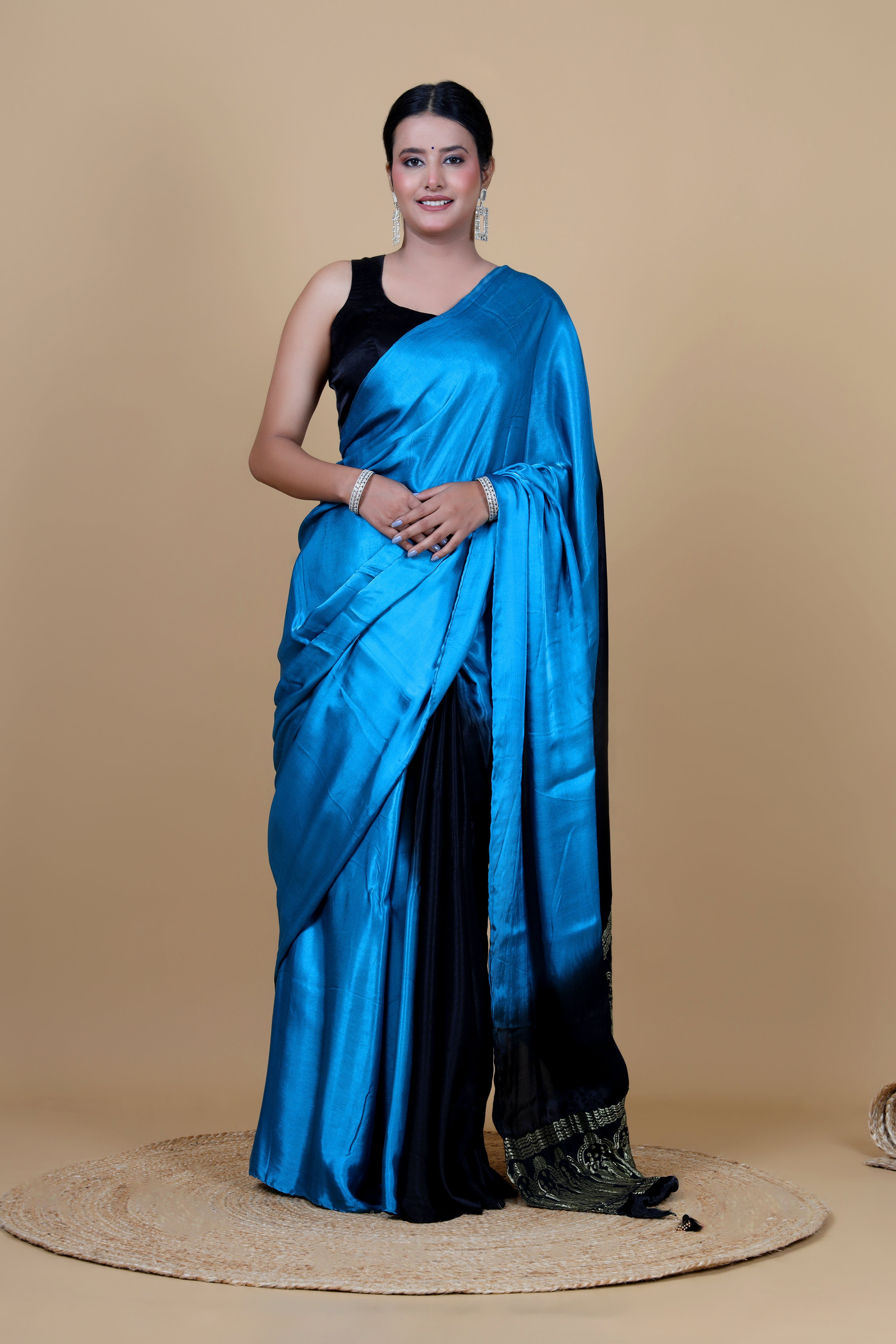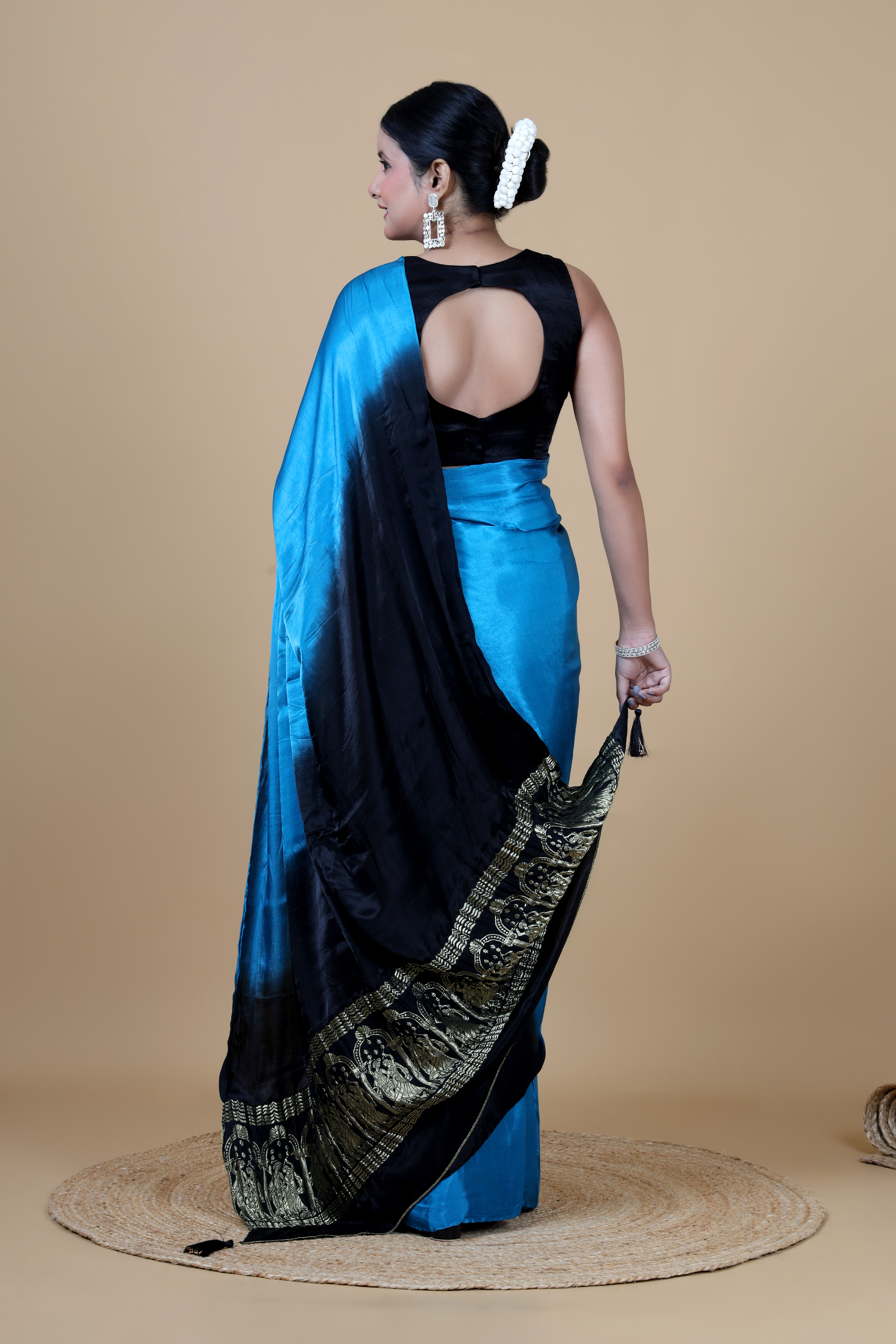Experience the royal charm of traditional elegance with this stunning Firoji Blue and Black Gajji Silk Saree. Crafted from premium-quality Gajji silk, it offers a luxurious drape and natural sheen that enhances your festive or wedding look. The contrasting hues of firoji blue and black make it a timeless statement piece for any special occasion.