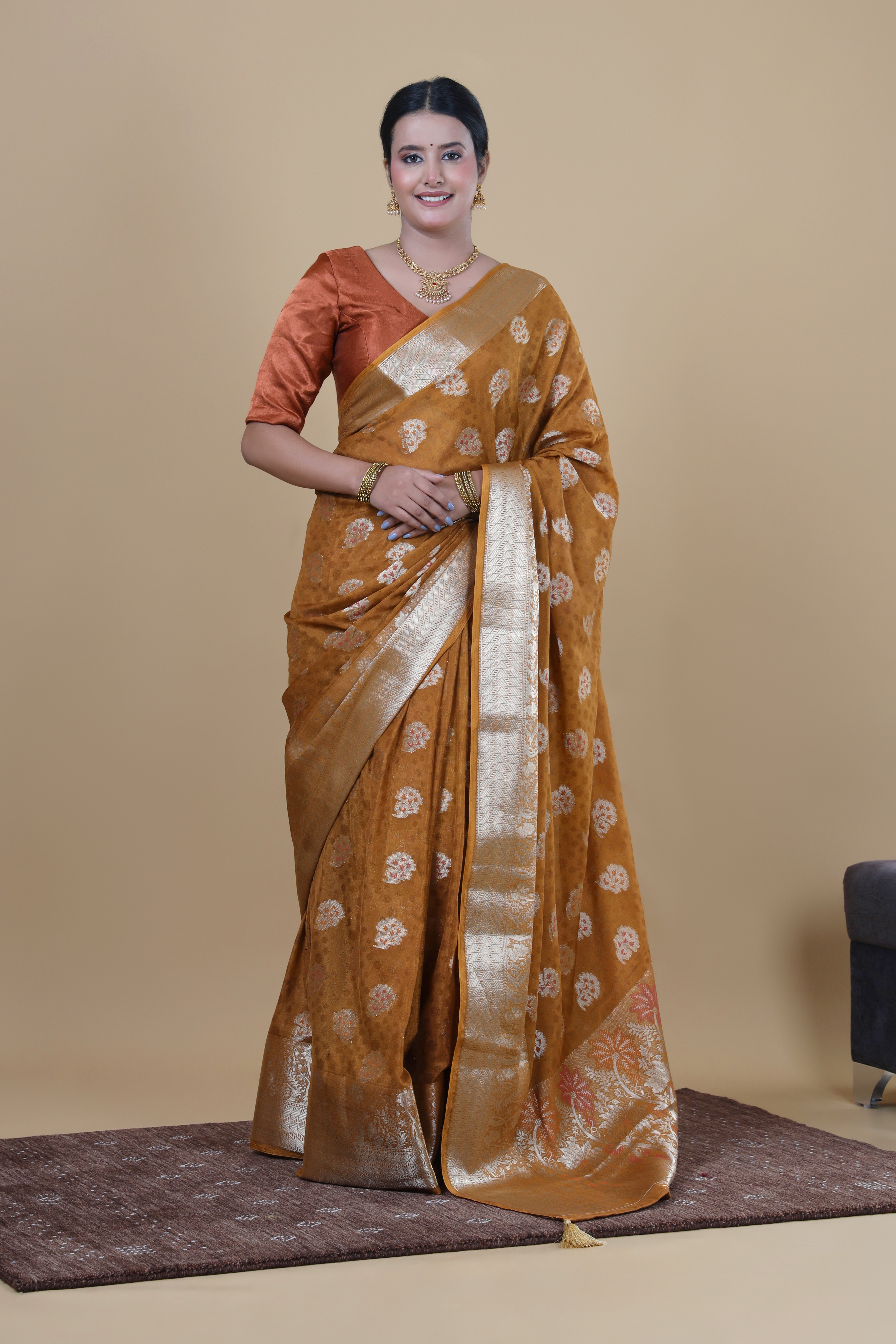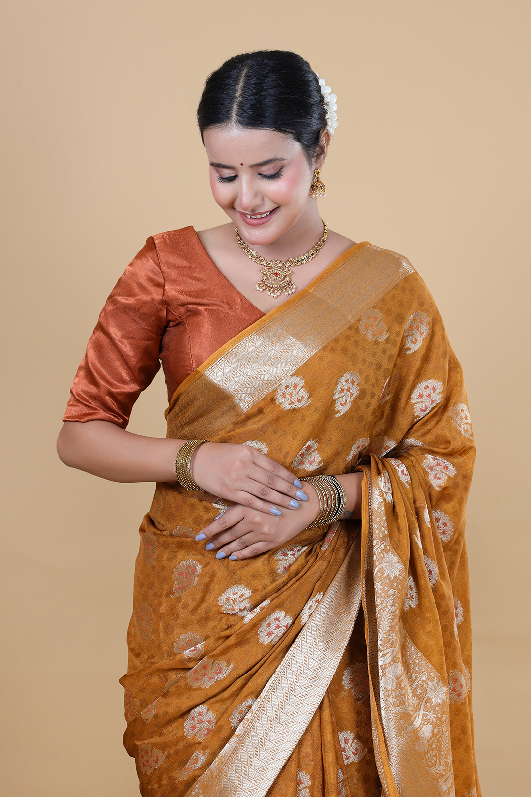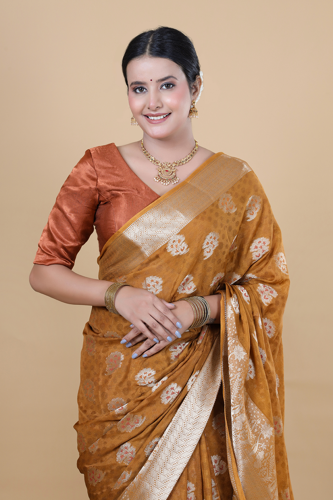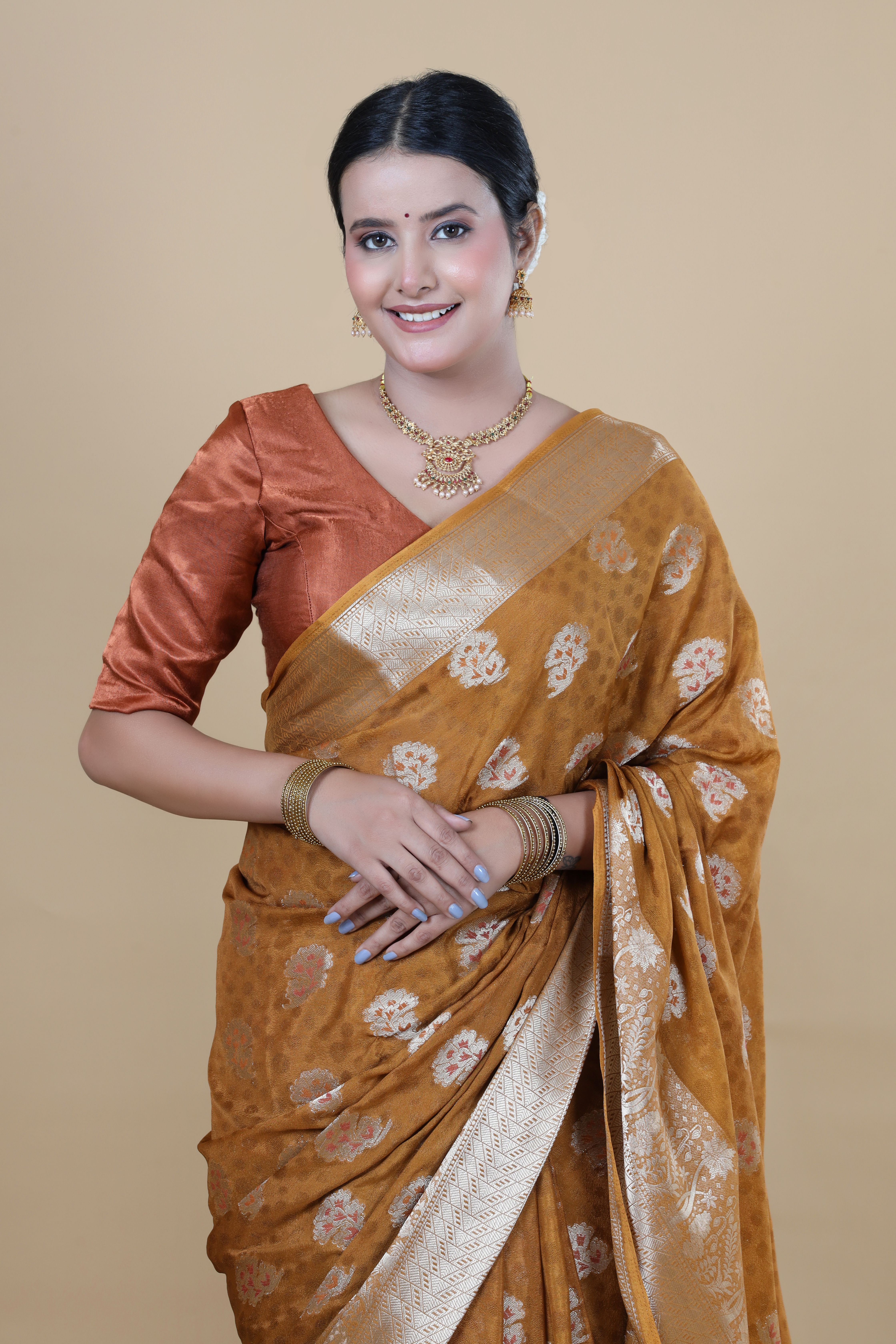 rape yourself in timeless elegance with this Golden Pure Georgette Saree featuring a beautiful zari border pallavi design. Crafted from soft and lightweight pure georgette fabric, it offers a graceful fall and effortless comfort, making it perfect for festive occasions, parties, and traditional gatherings.