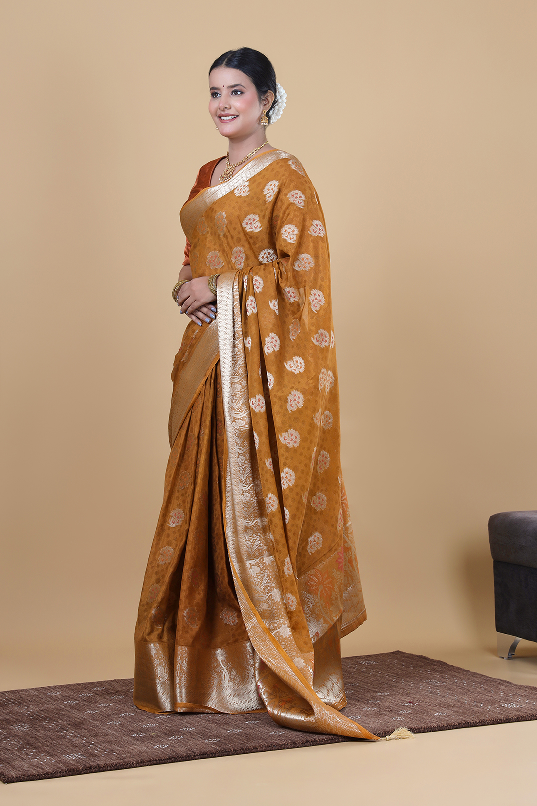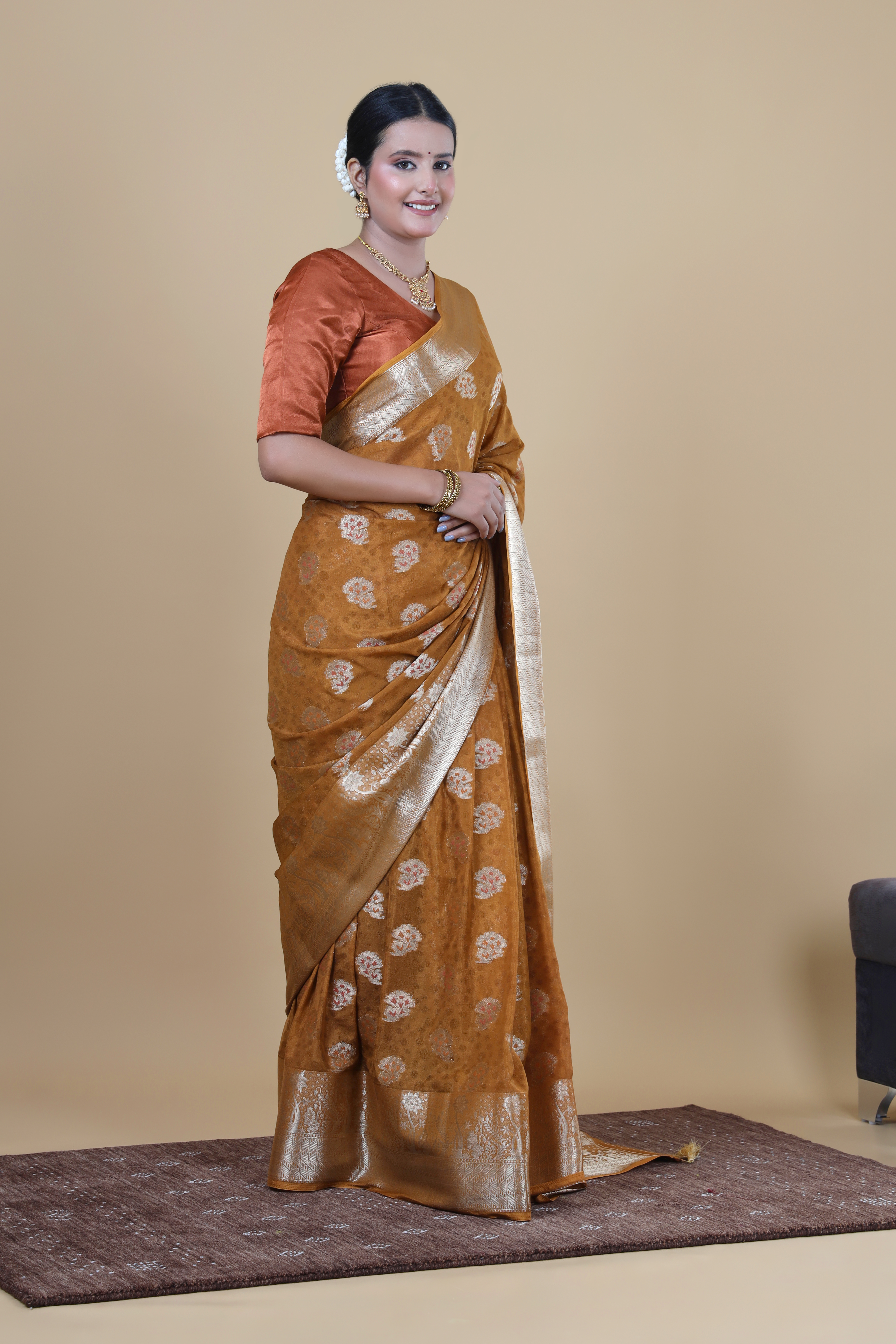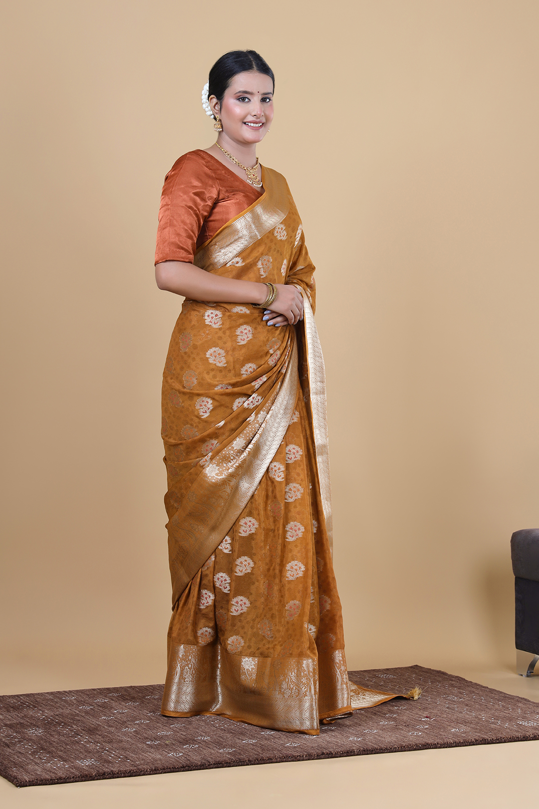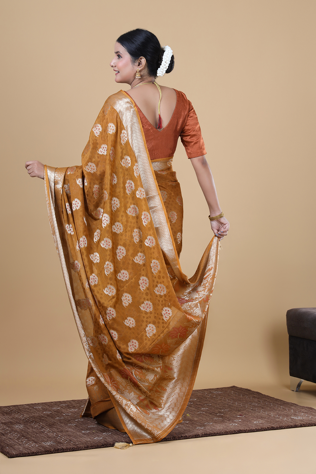 The subtle golden hue adds a touch of sophistication, while the zari detailing enhances its luxurious appeal. This 6.5-meter saree comes with an unstitched blouse piece, allowing you to style it to suit your personal taste.