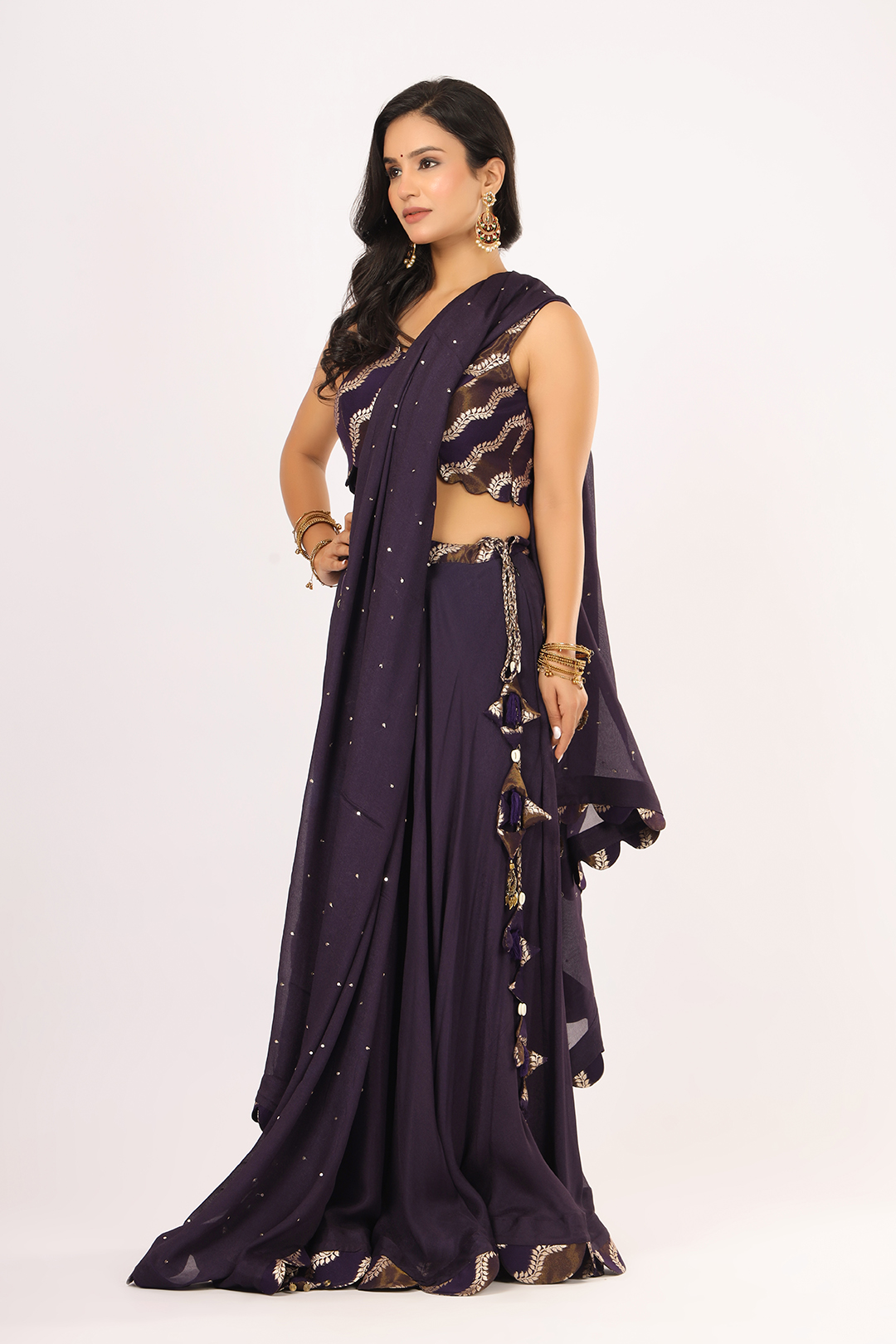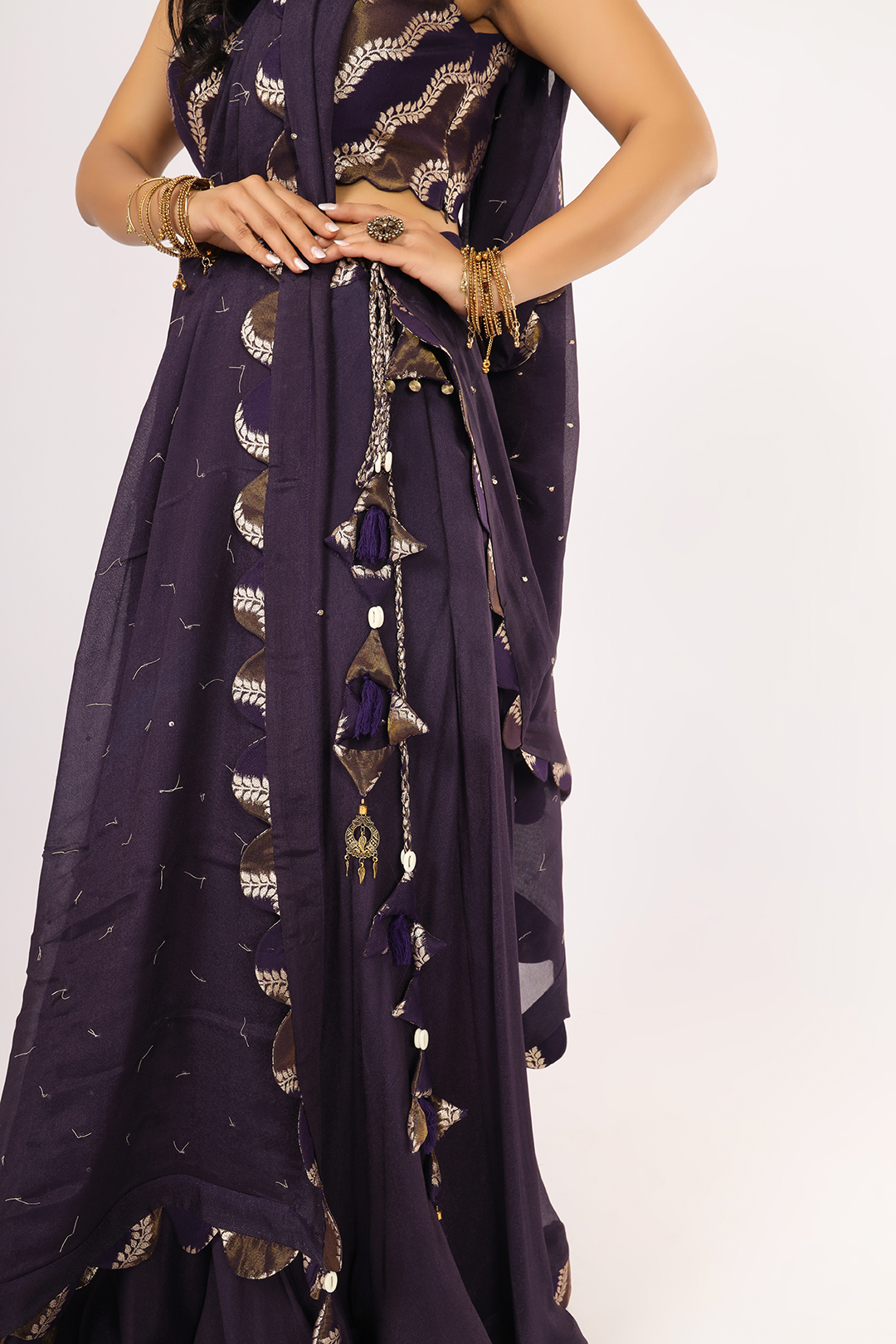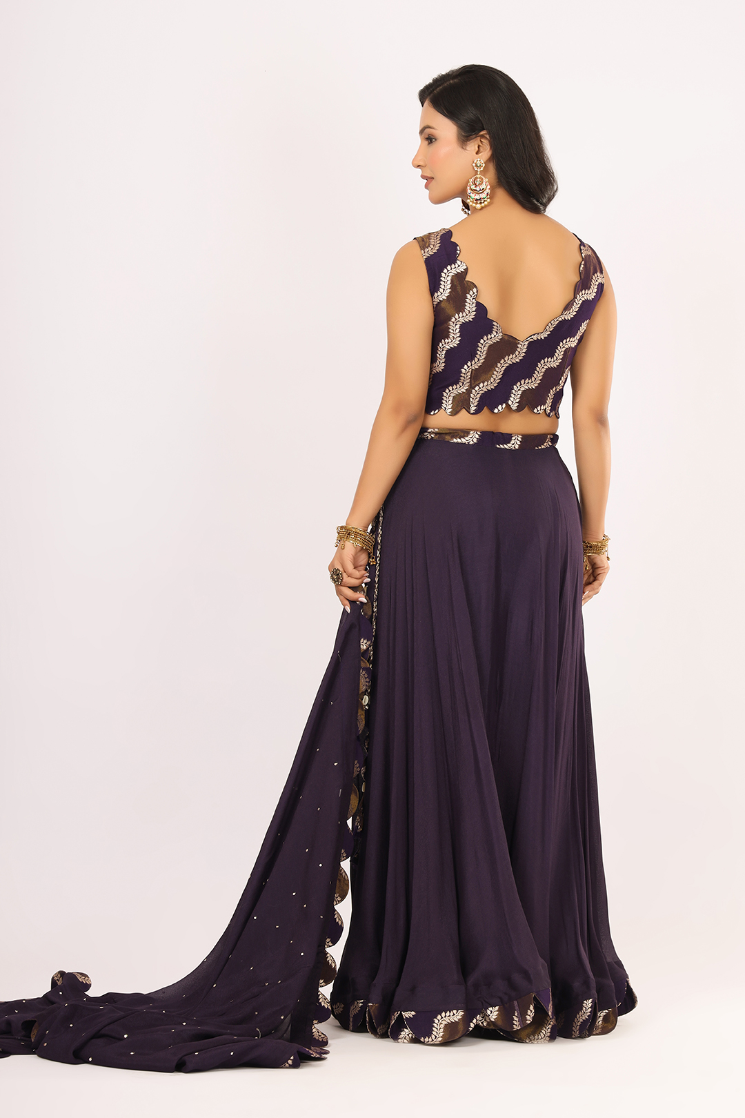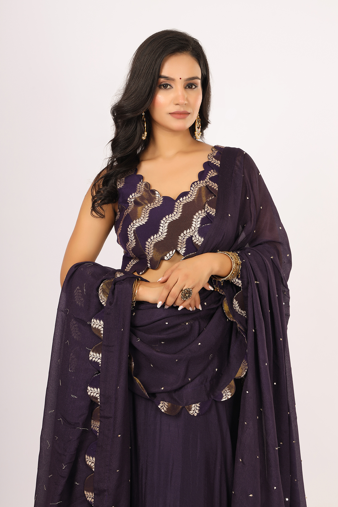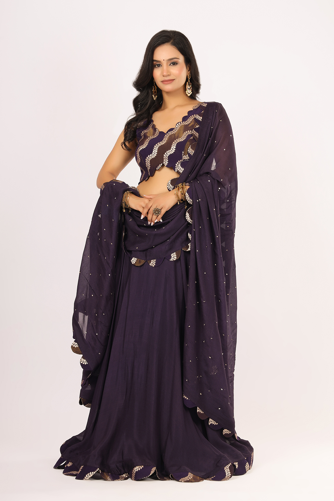 Radiate timeless grace with VGLAME’s Midnight Purple Crepe Lehenga Set, designed to capture every gaze with its understated glamour. Crafted from premium crepe fabric, this lehenga offers a smooth, flowy drape and unmatched comfort. The scalloped blouse adorned with intricate embroidery pairs beautifully with a lightly embellished dupatta, completing a look that’s both regal and contemporary.