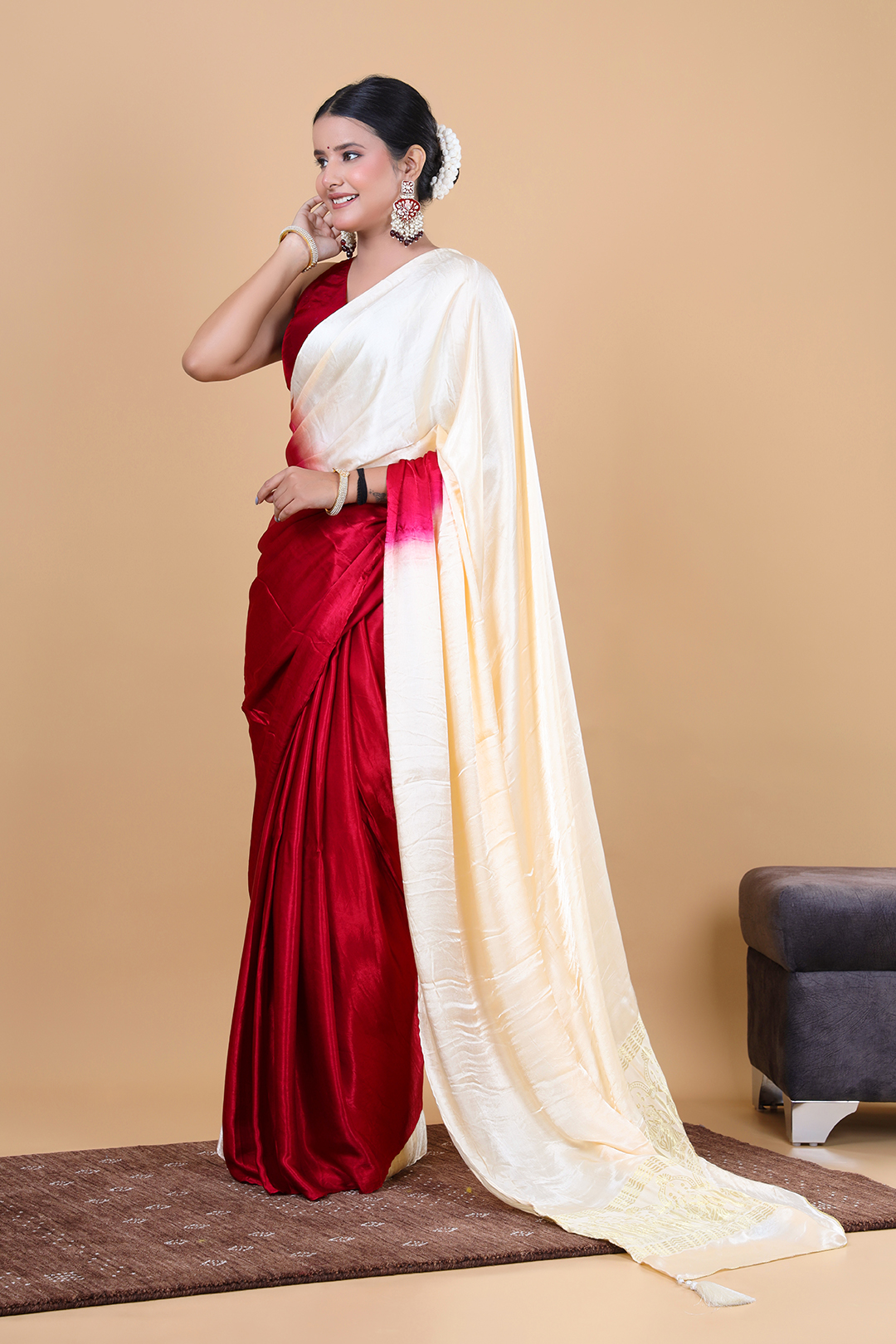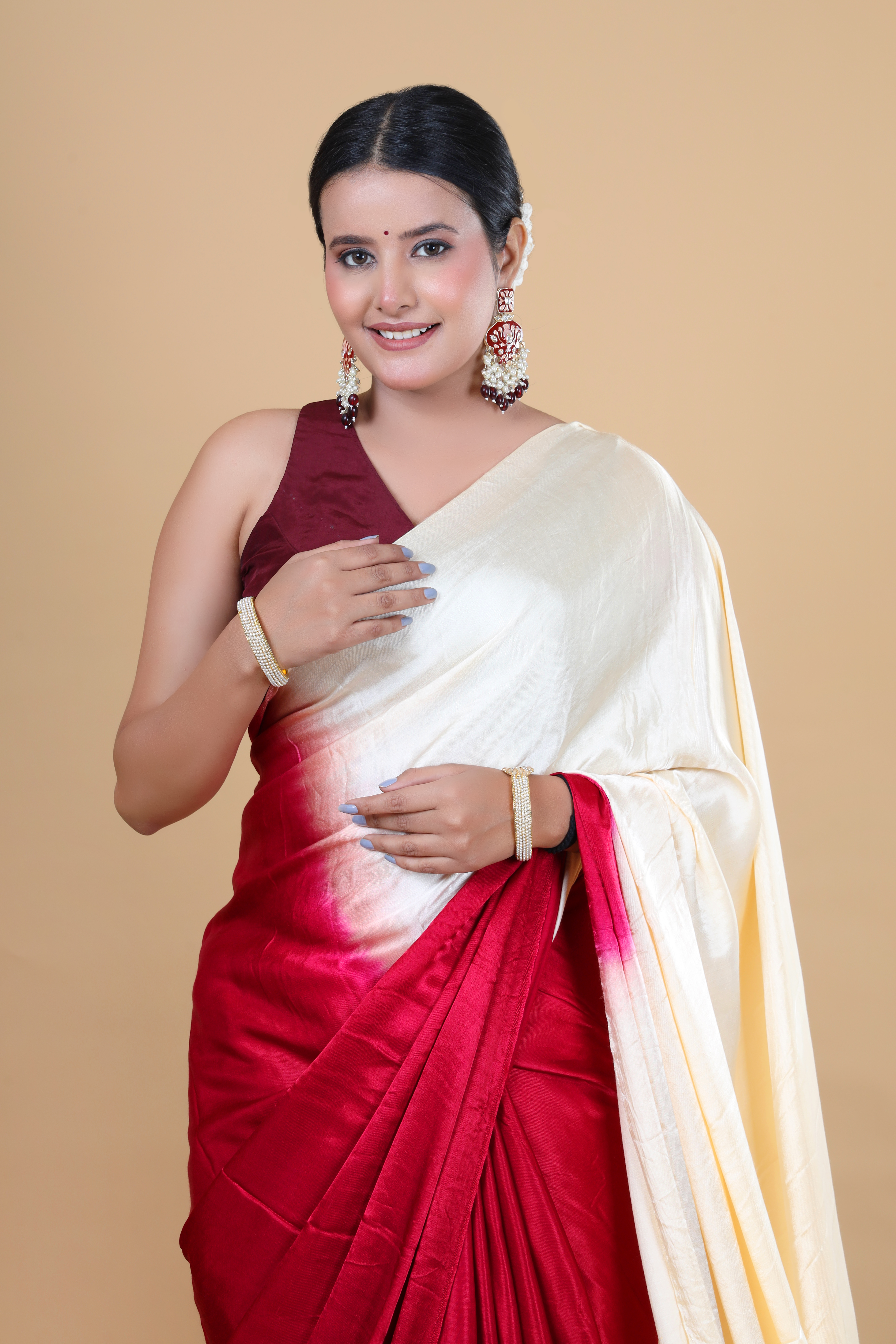 The vibrant contrast of magenta pink border on a serene off-white base adds a royal touch, making it ideal for weddings, festive occasions, and traditional celebrations. This 6.5-meter saree includes an unstitched blouse piece, allowing you to tailor it to your personal style.