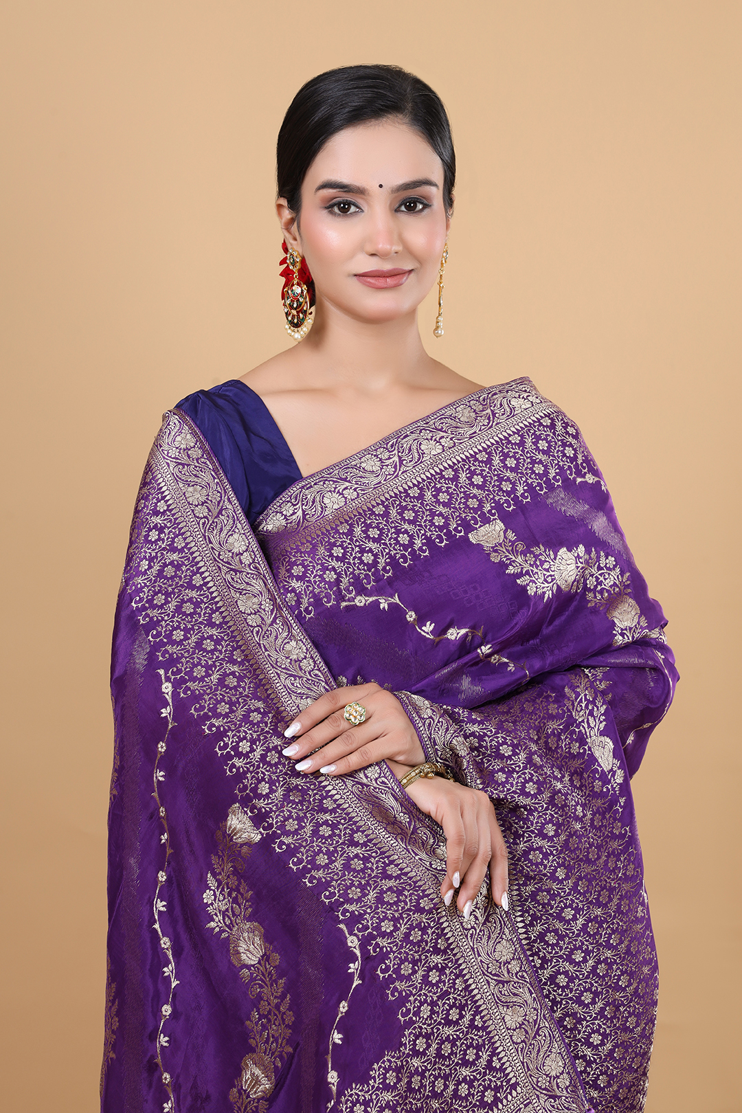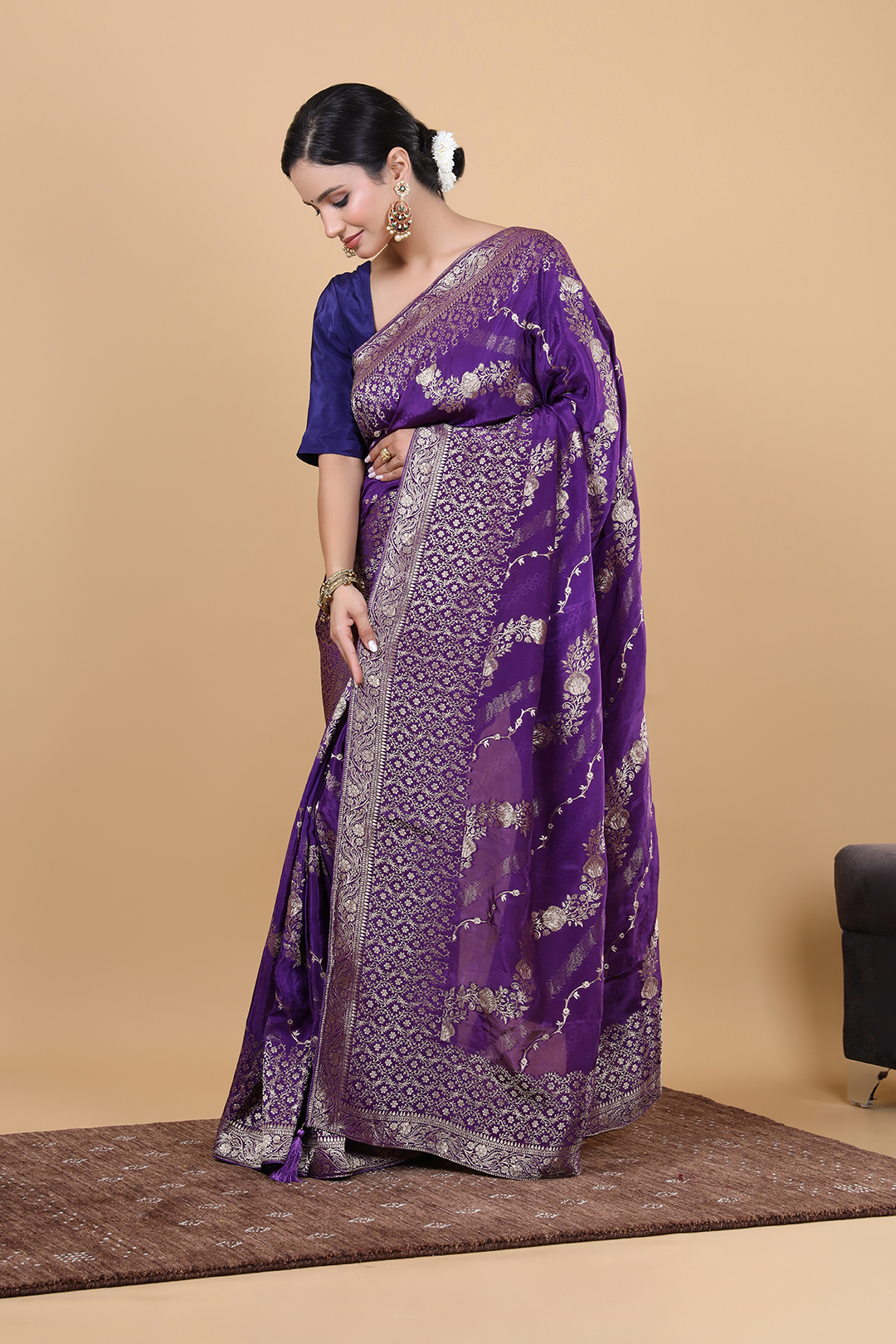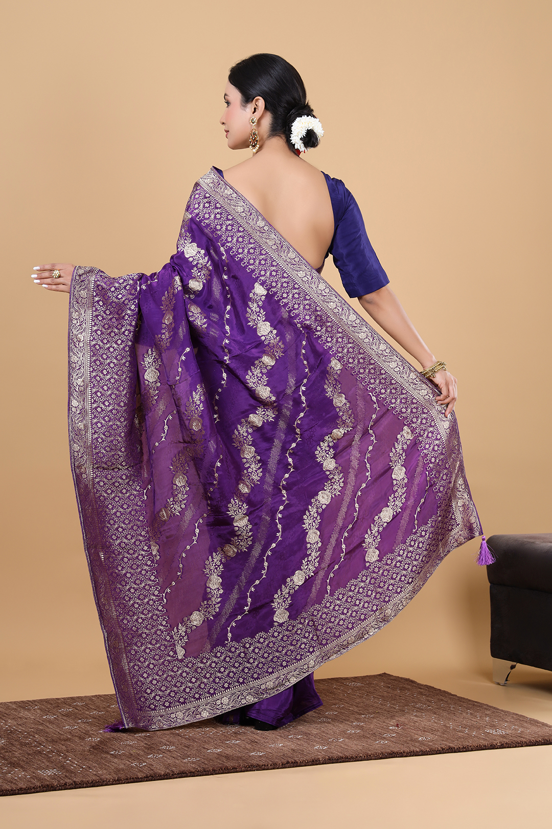 The vibrant purple shade with the subtle zari detailing adds elegance and sophistication to your look. This 6.5-meter saree comes with an unstitched blouse piece, giving you the flexibility to tailor it according to your style preference.