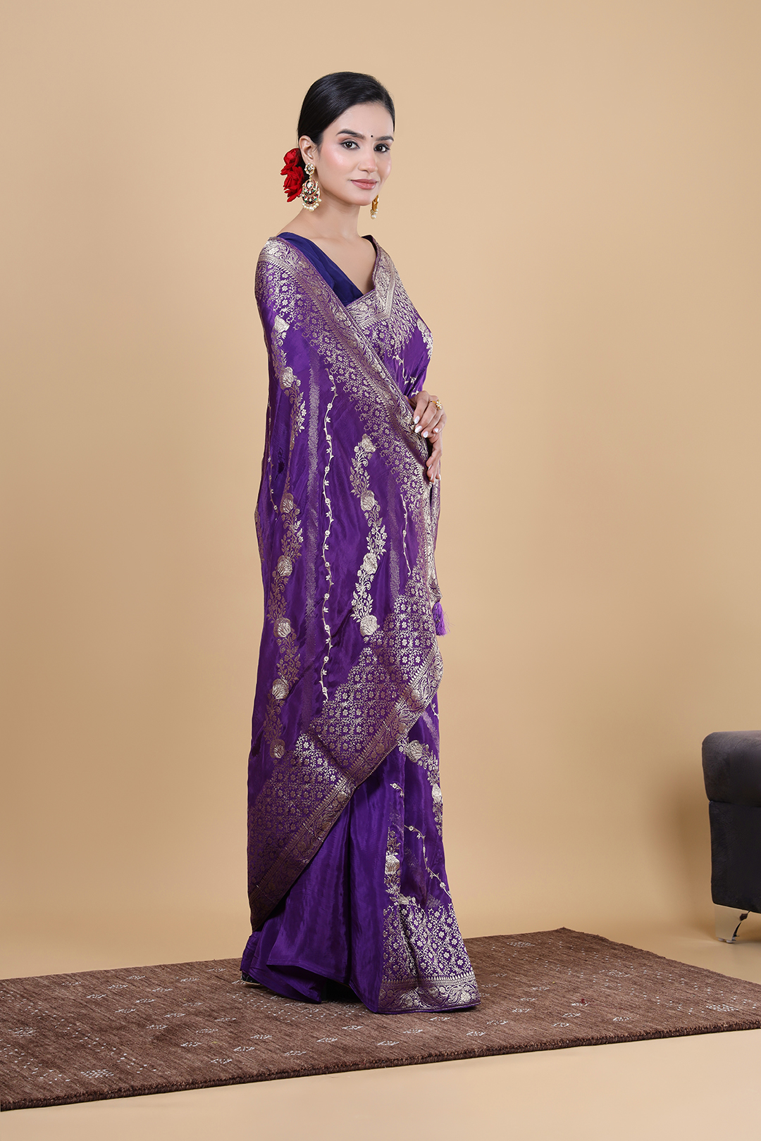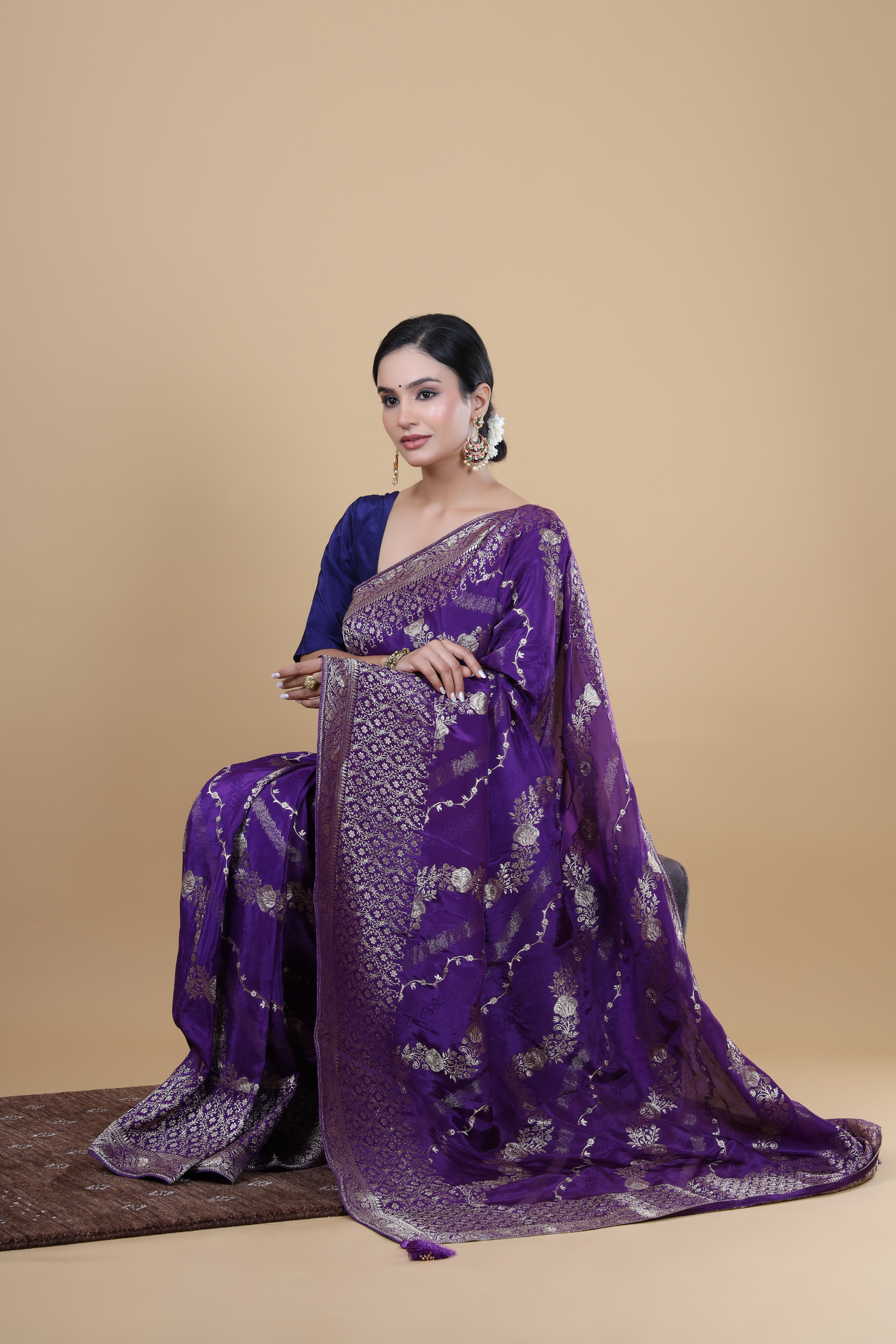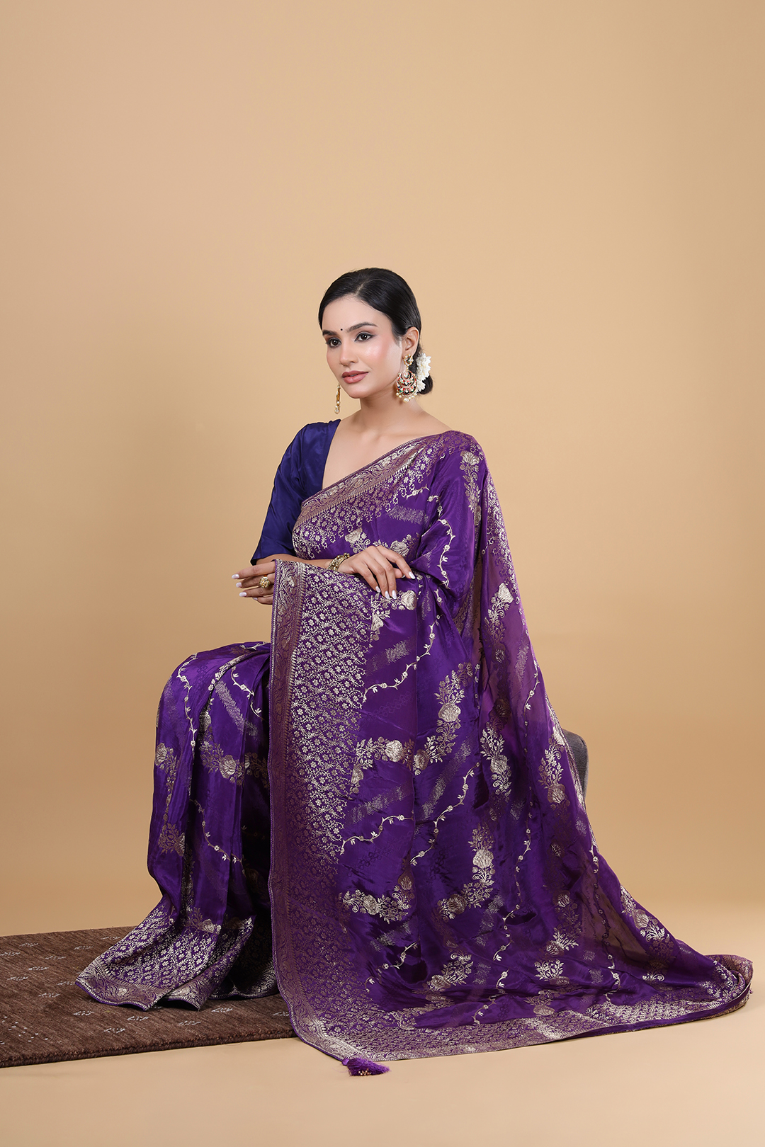 The vibrant purple shade with the subtle zari detailing adds elegance and sophistication to your look. This 6.5-meter saree comes with an unstitched blouse piece, giving you the flexibility to tailor it according to your style preference.