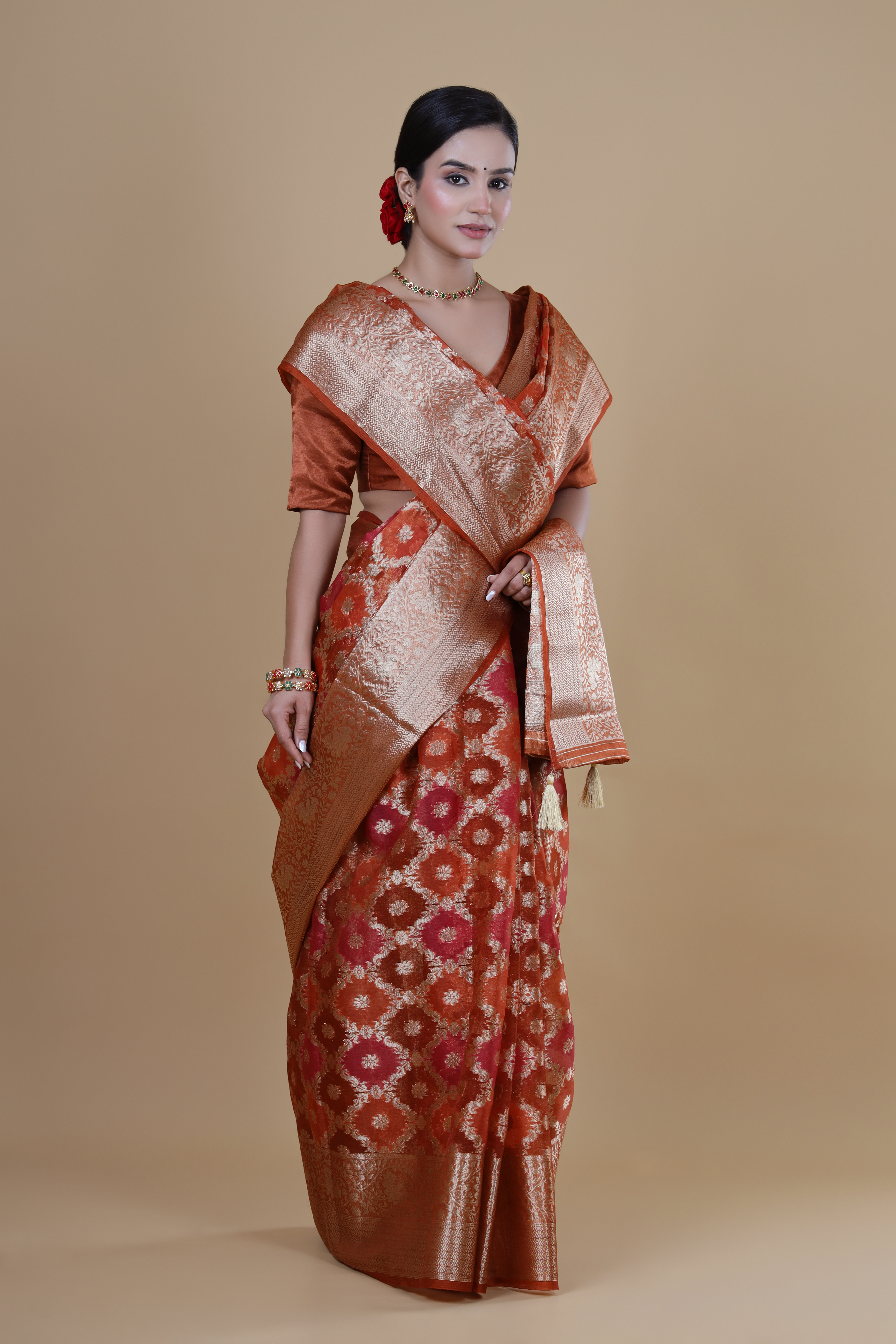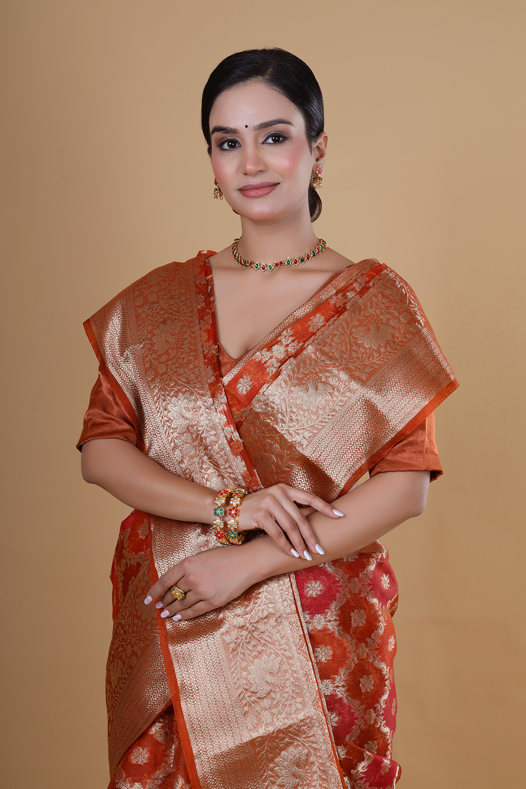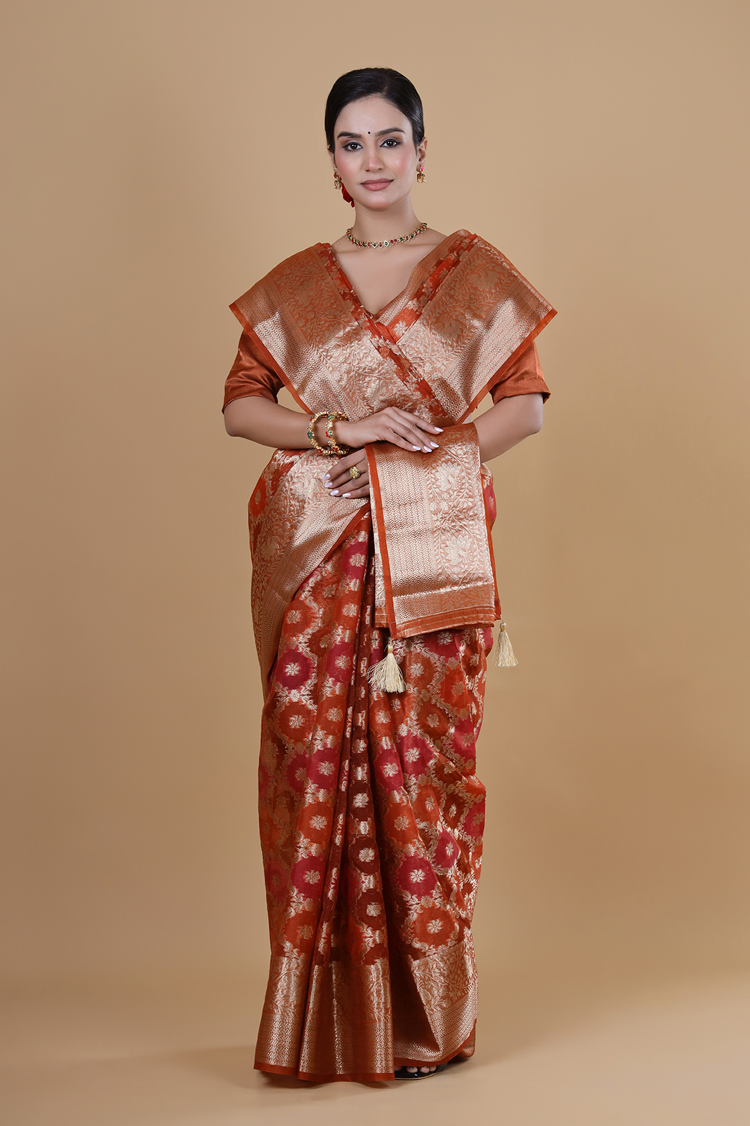 The rich rust shade enhances your presence at weddings, parties, and special celebrations, while the soft fabric ensures graceful draping and comfort. It comes with an unstitched blouse piece, giving you the freedom to tailor it to your personal style.