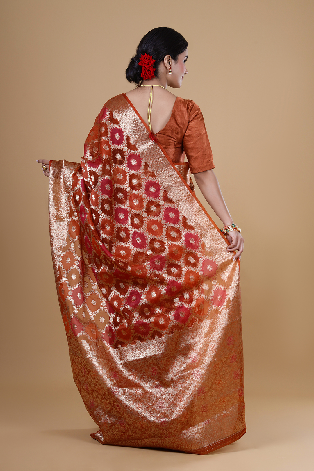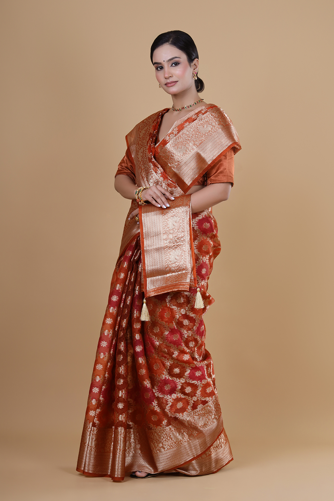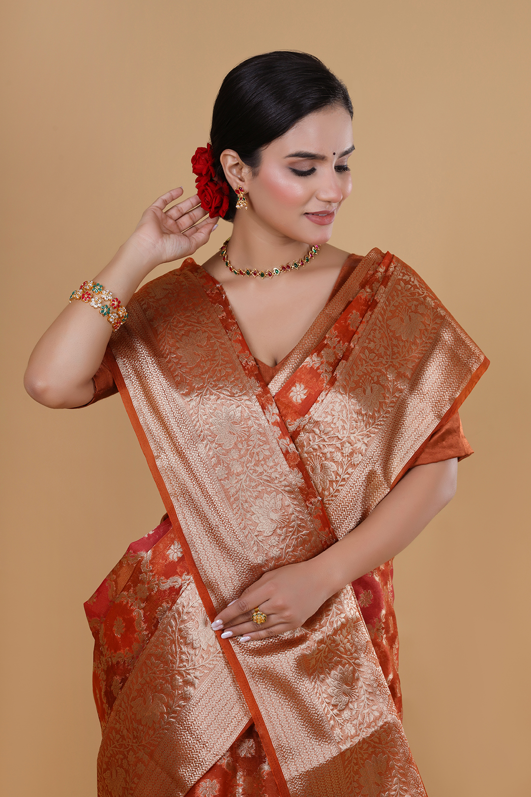 The rich rust shade enhances your presence at weddings, parties, and special celebrations, while the soft fabric ensures graceful draping and comfort. It comes with an unstitched blouse piece, giving you the freedom to tailor it to your personal style.