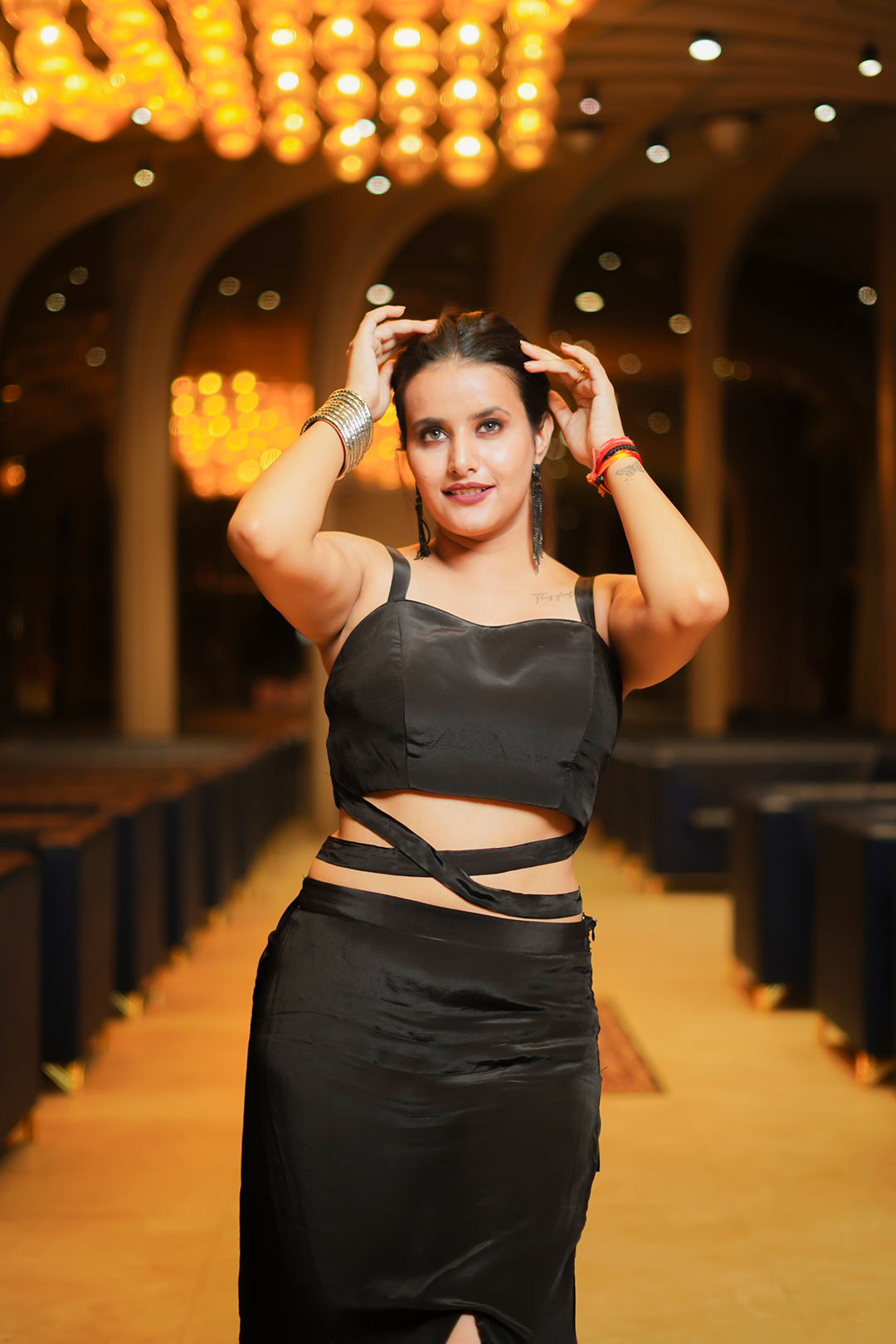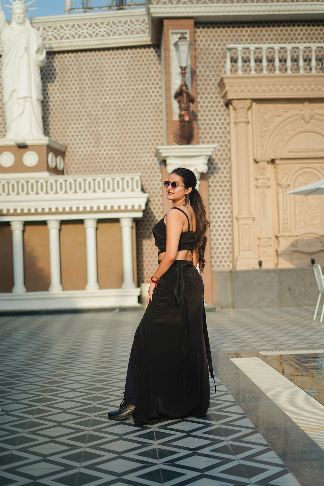 Step into classic sophistication with this V Glame Two-Piece Dress, crafted from premium pure natural crepe fabric in a sleek black color. The outfit features a crop top paired with a long fitted skirt that includes a stylish side leg slit, creating a modern and elegant silhouette. Perfect for evening occasions and parties, this ensemble exudes timeless charm.