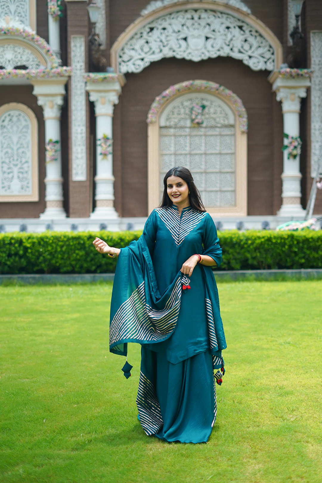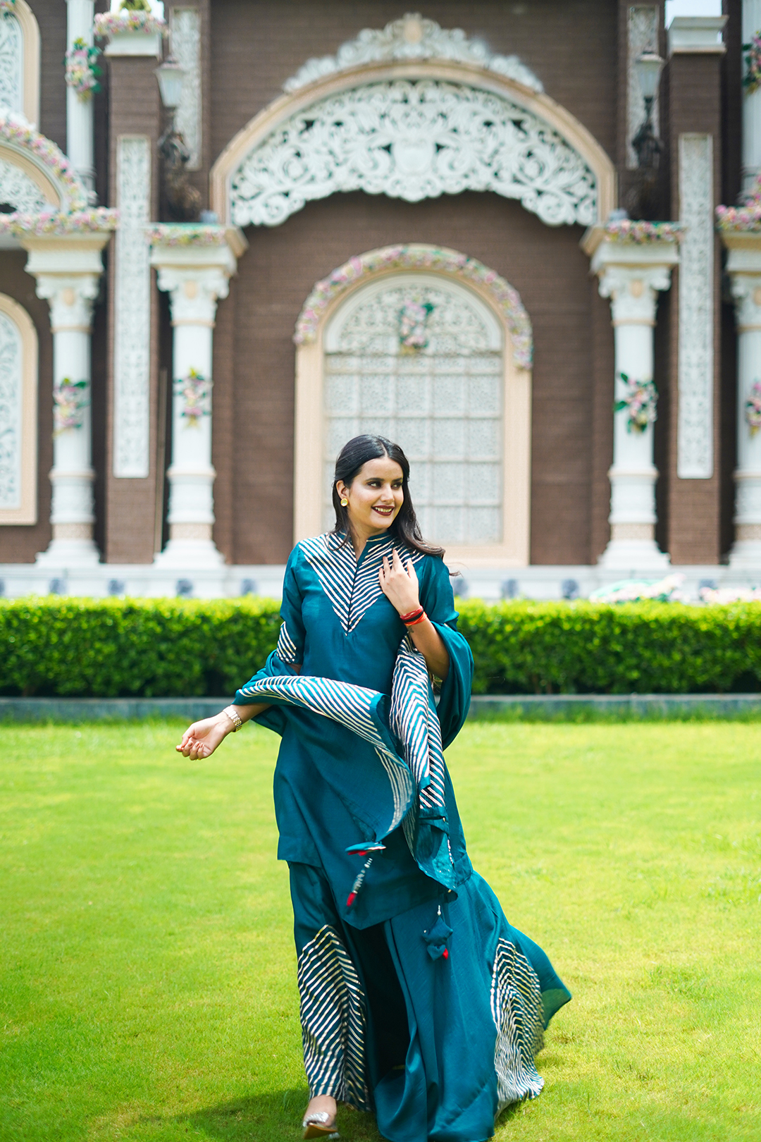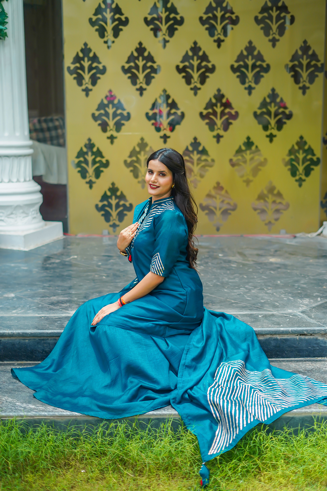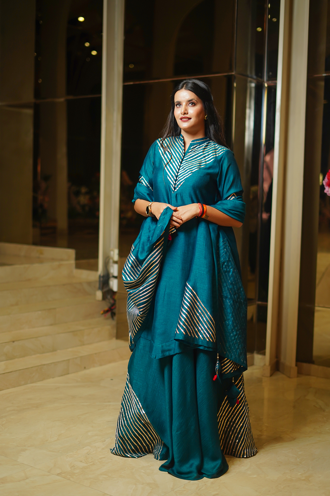 Elevate your festive style with this V Glame Bluish Green Kurta Set, crafted from luxurious V Silk fabric. The kurta yoke is adorned with elegant gota work, complemented by matching gota designs on the lehenga and dupatta. The dupatta edges are finished with delicate tassels, giving the outfit a graceful and refined look—perfect for special occasions and celebrations.