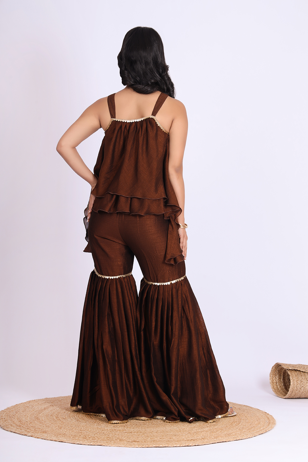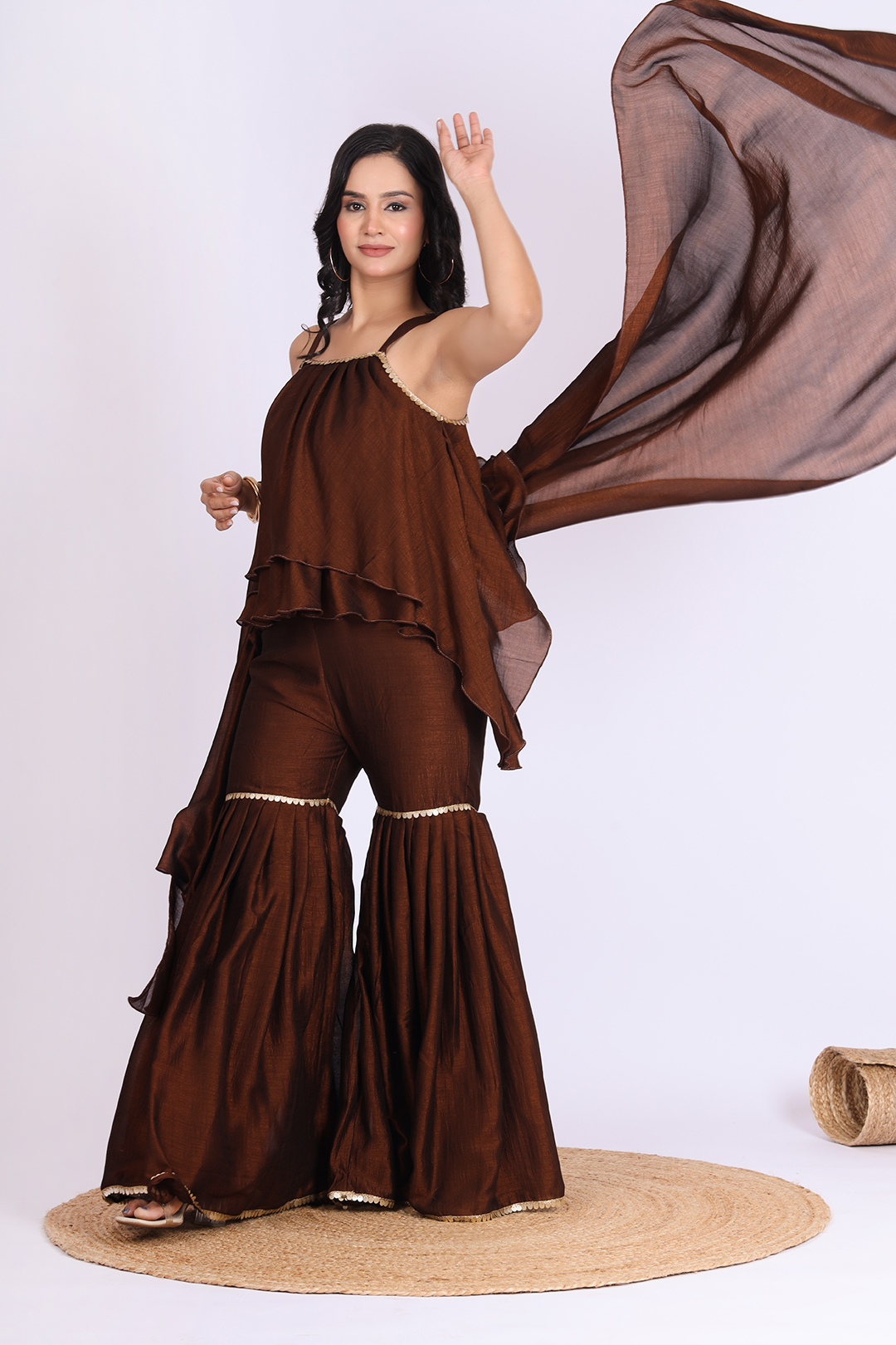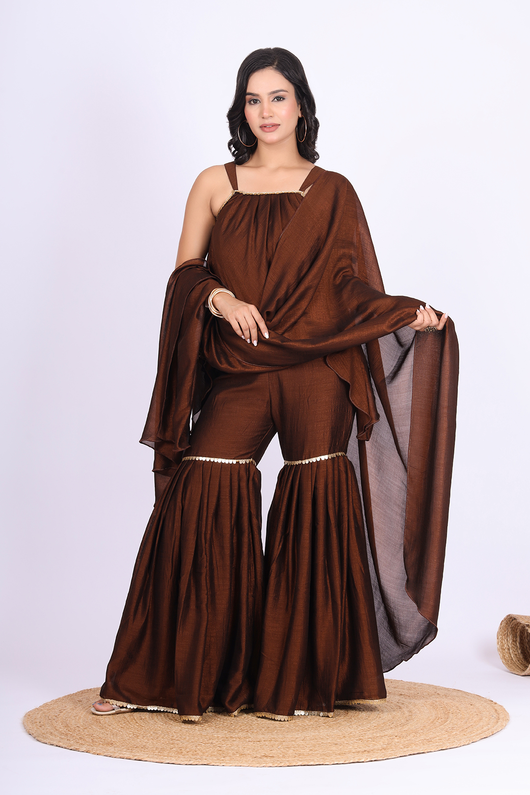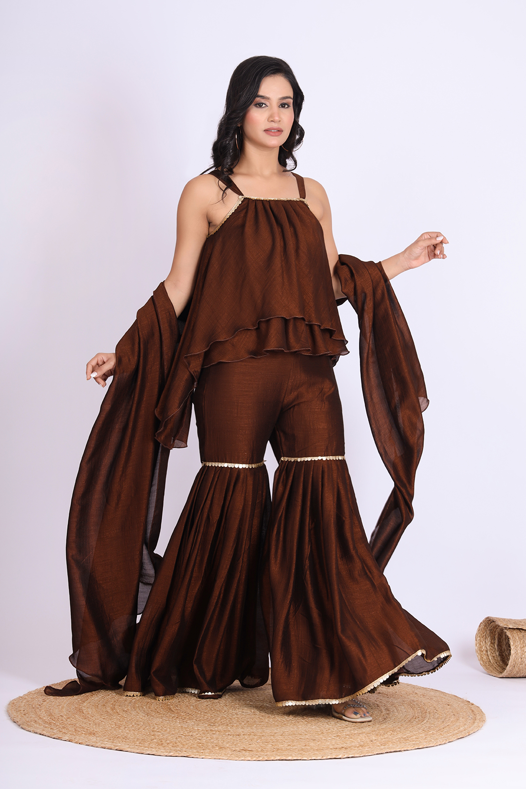 Step into elegance with this V Glame Brown Three-Piece Dress, crafted from rich V Silk fabric. The outfit features a gathered double-layer top, paired with a flared sharara and a beautifully coordinated dupatta, creating a graceful and festive look. Perfect for celebrations and traditional occasions, this set blends comfort, charm, and luxury effortlessly.