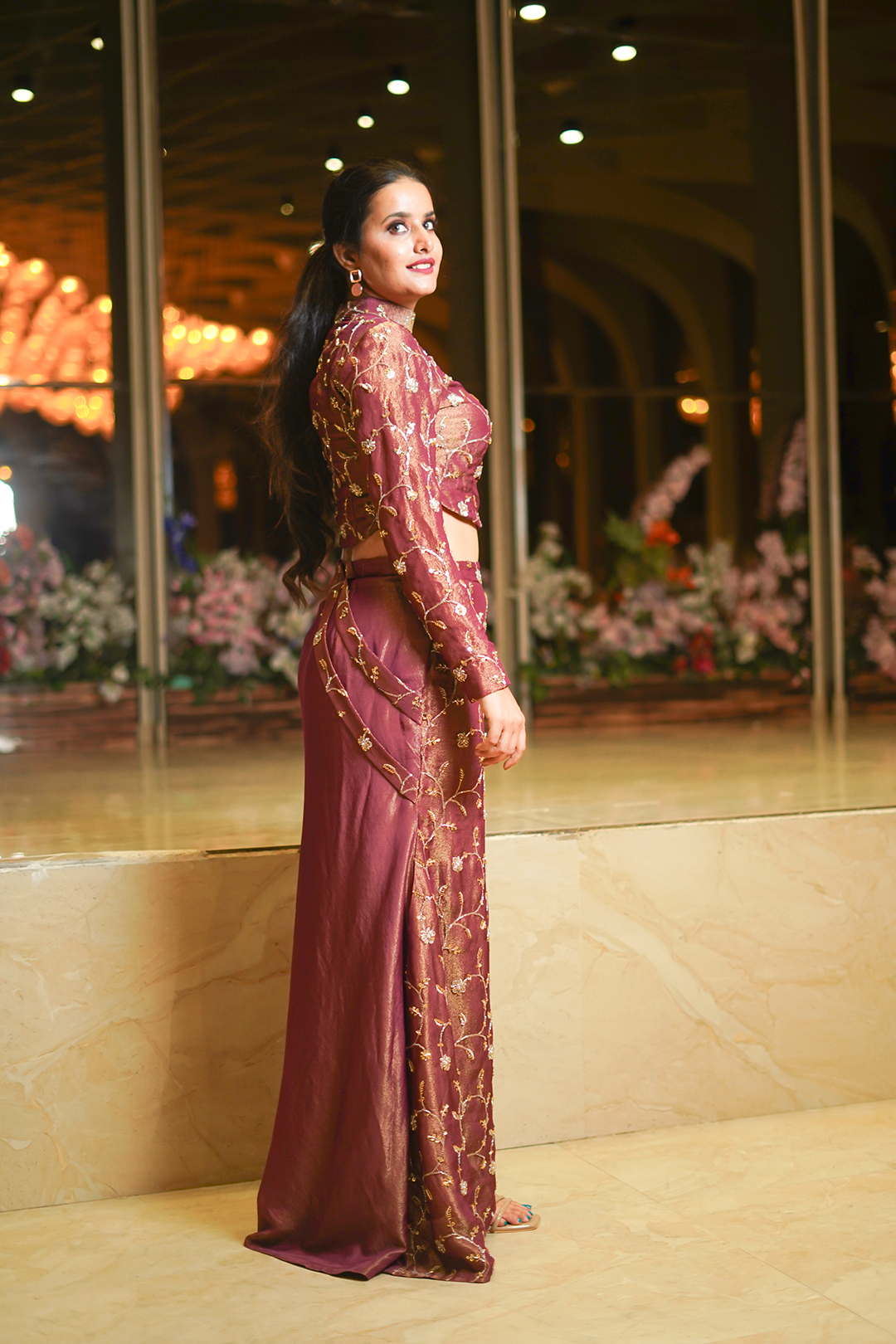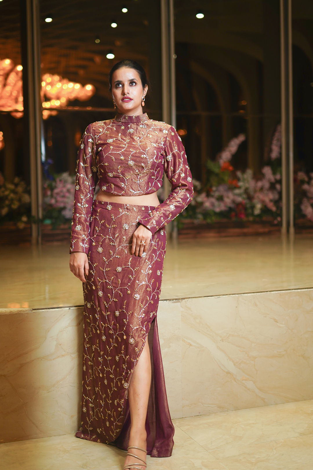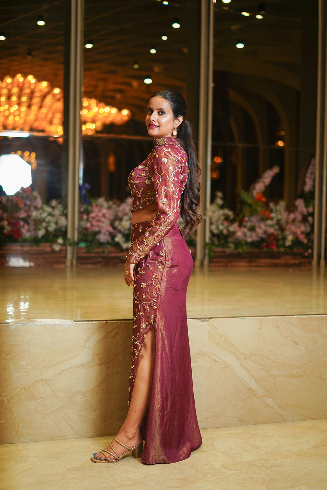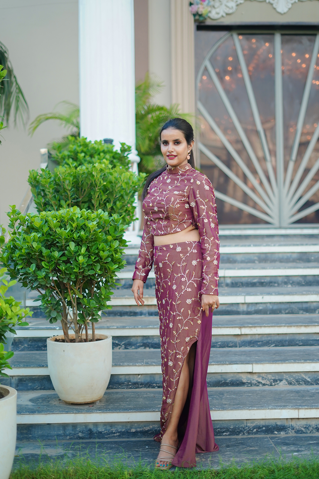 Exude bold sophistication with this V Glame Two-Piece Dress, tailored from a blend of plain glamour viscose and work glamour viscose fabric. The outfit features a high-neck crop top with full sleeves, paired with a fitted side-slit skirt, creating a sleek and modern silhouette. Perfect for evening events or parties, this ensemble reflects elegance with a hint of contemporary charm.