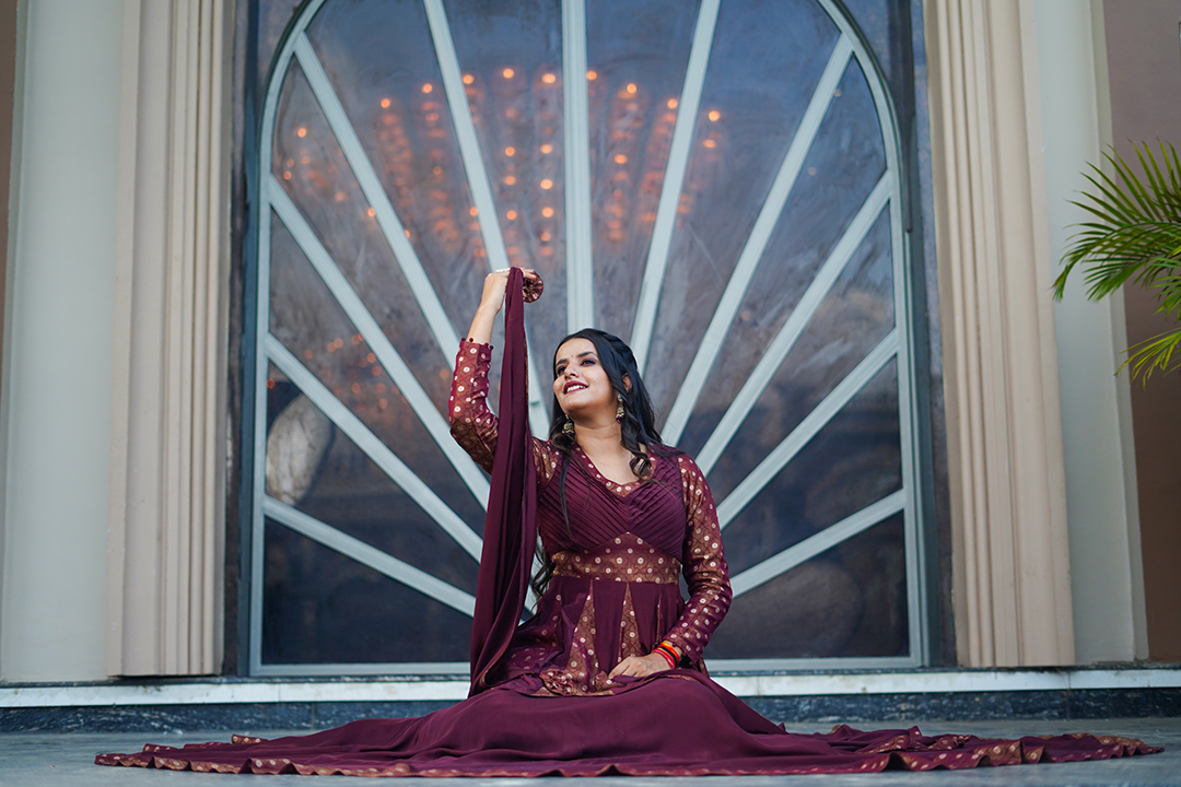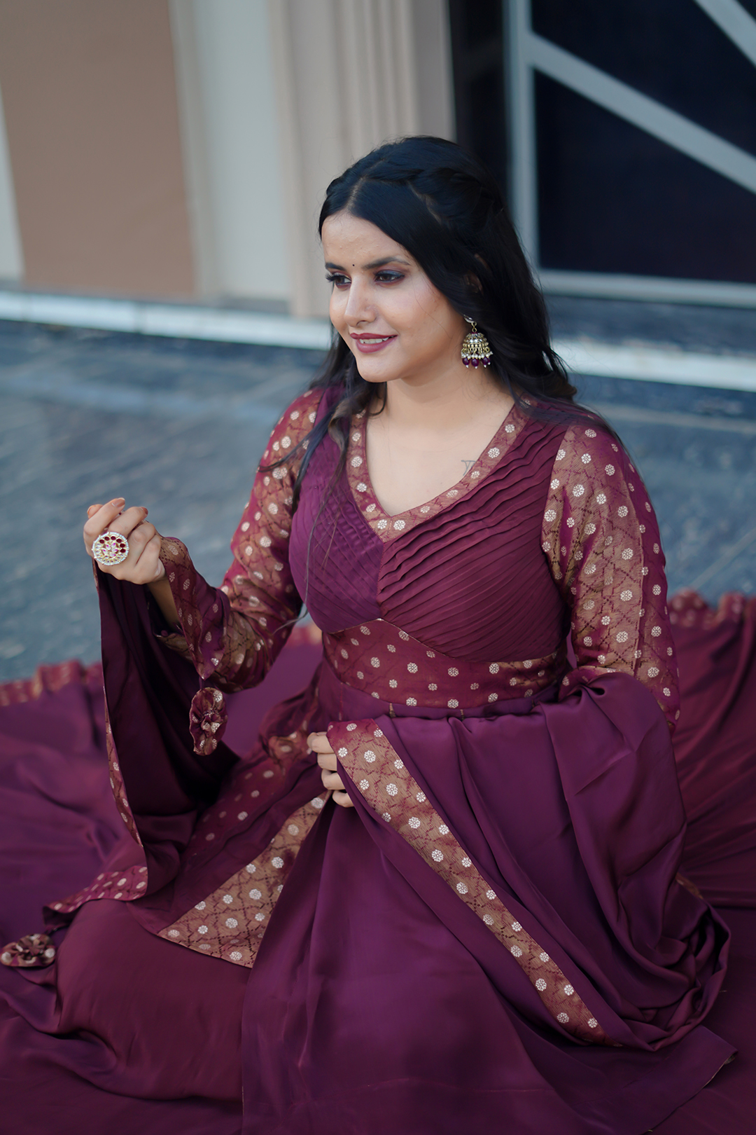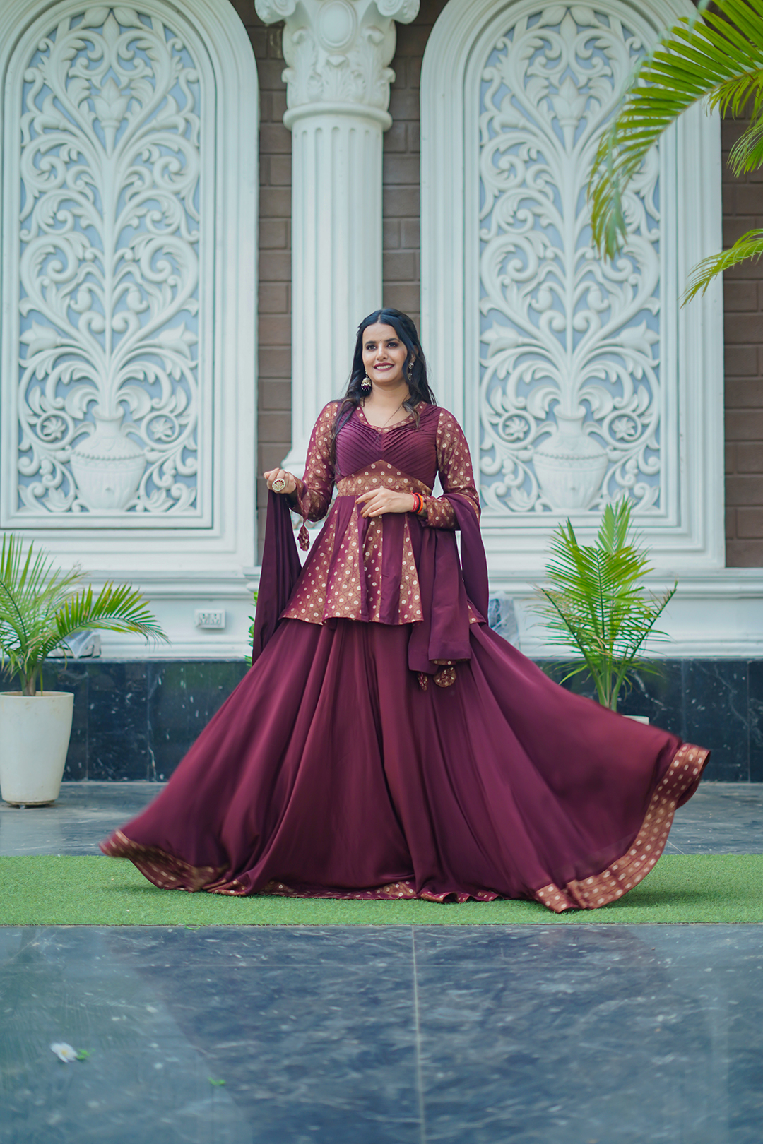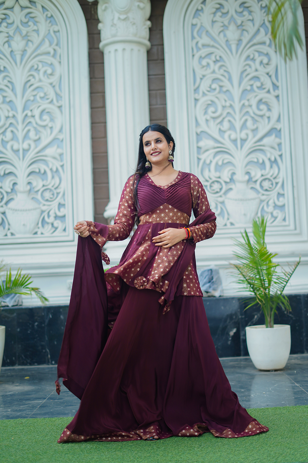 Make a grand statement with this V Glame Dark Maroon Three-Piece Dress, beautifully tailored in pure crepe and jacquard jari moti fabric. The outfit features a full-sleeve peplum panel top with a pleated yoke, paired with a flared skirt and a dupatta finished with an elegant jacquard border. Perfect for festive occasions and weddings, this ensemble radiates luxury and traditional charm.
