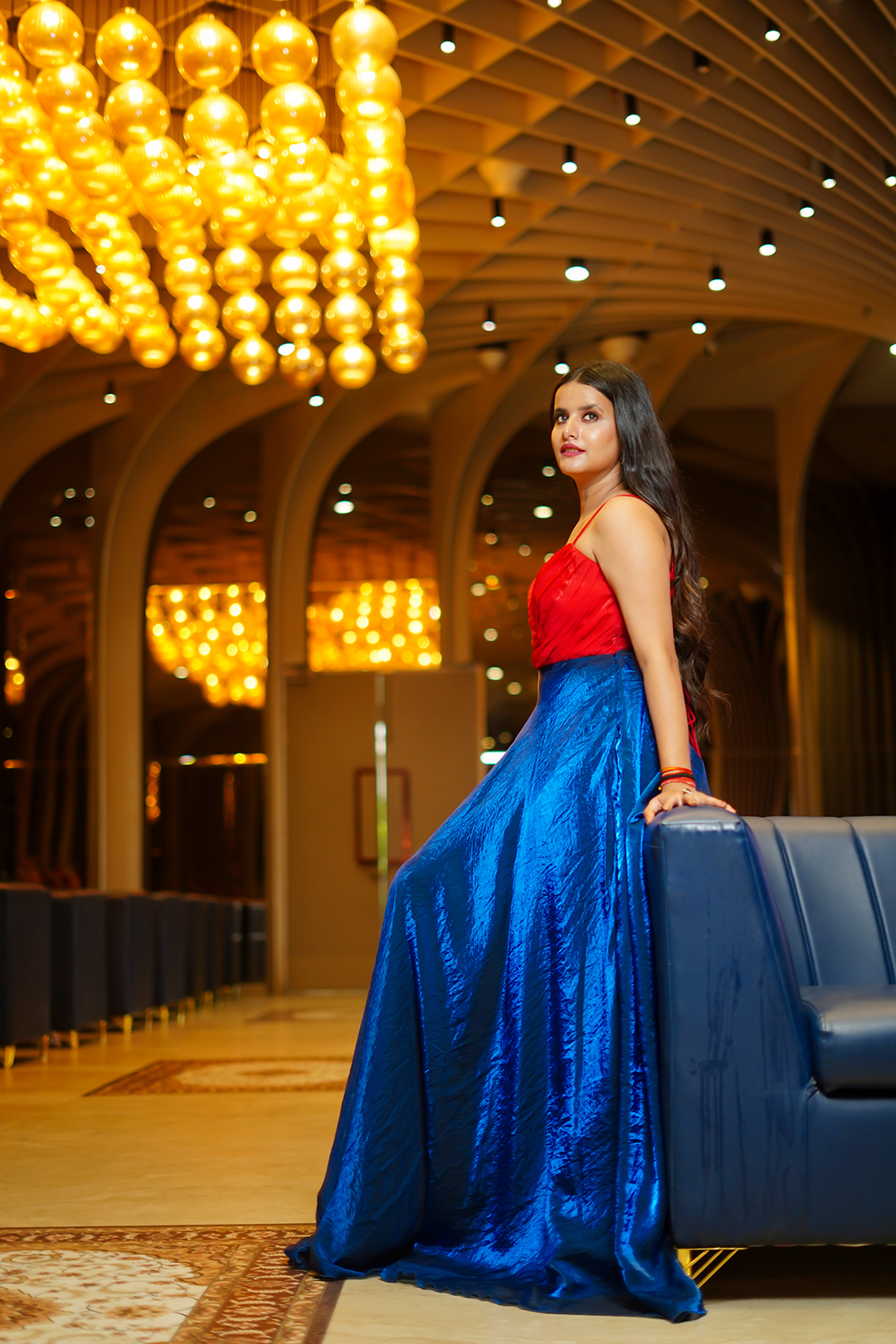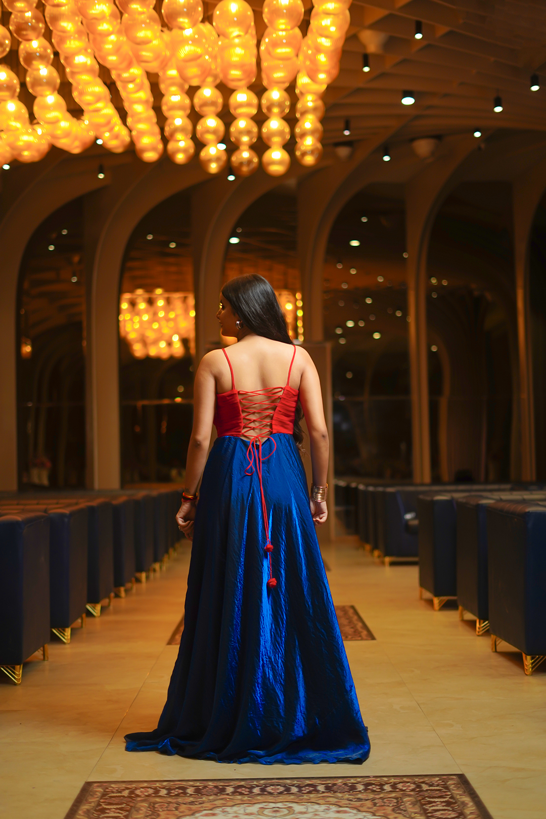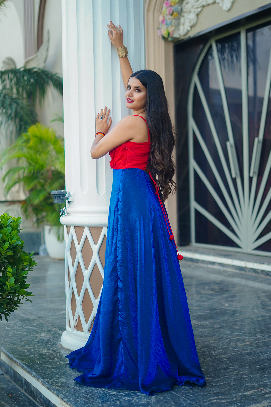 Bring out your radiant charm with this V Glame One-Piece Gown, crafted from premium glow satin fabric in a stunning pink and blue combination. The gown features a flared silhouette with a pleated upper design and a stylish string pattern at the back, adding a graceful and modern touch. Perfect for parties and evening occasions, this outfit blends glamour with sophistication.