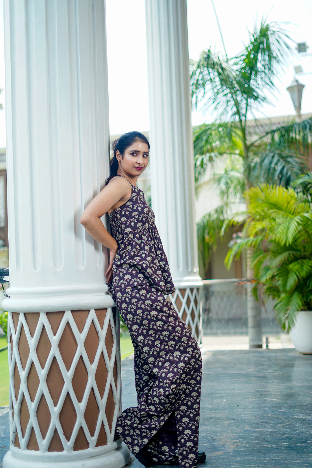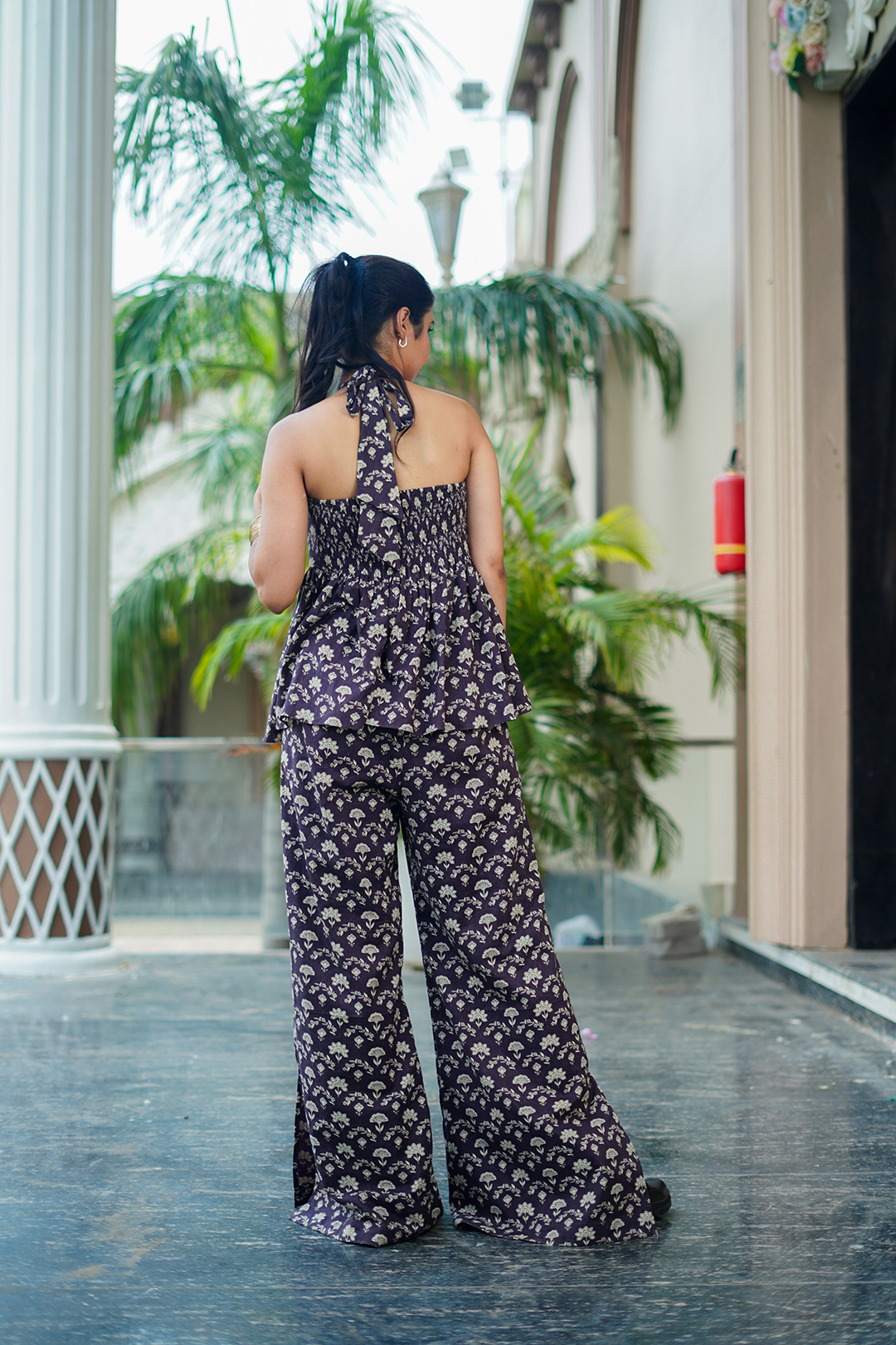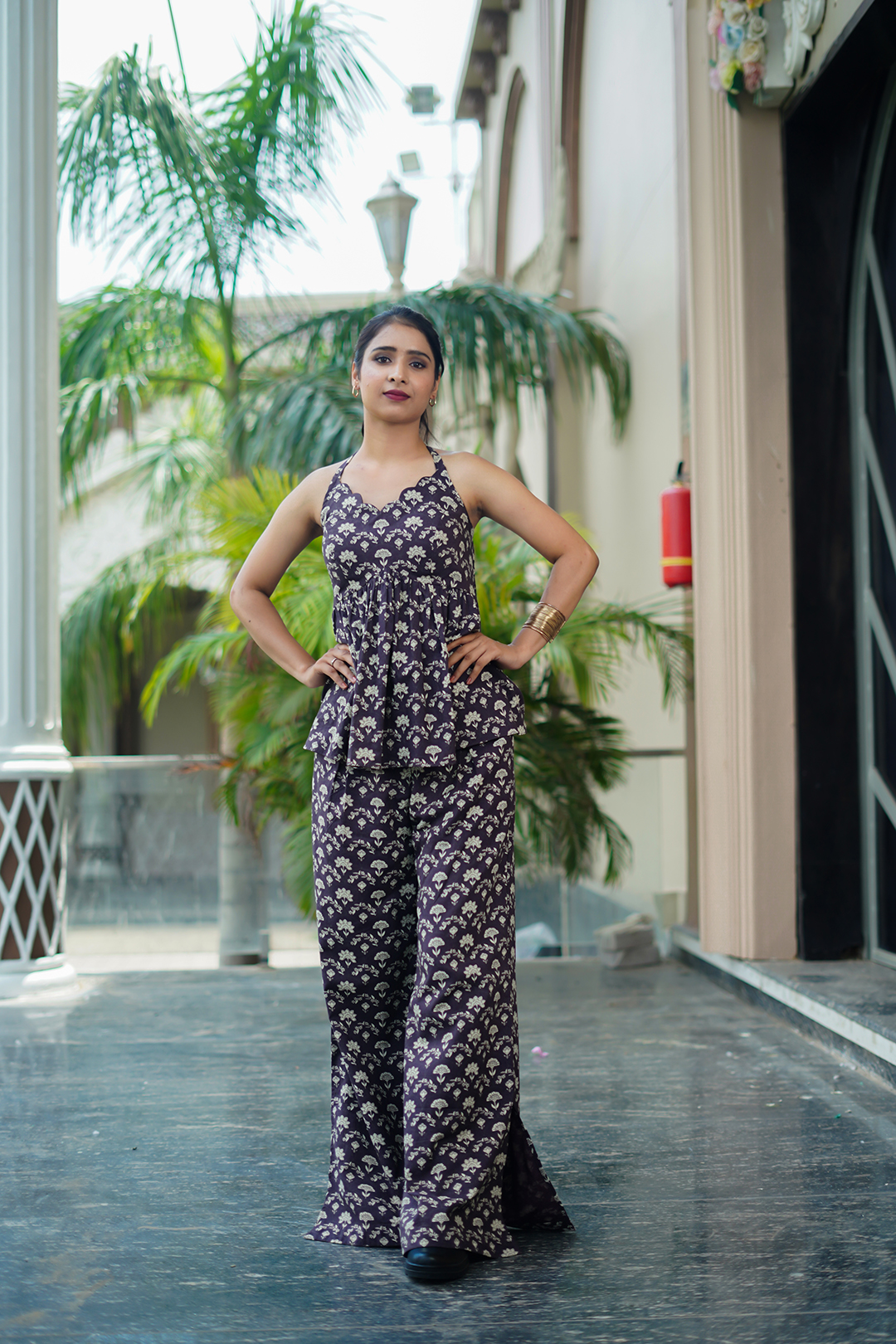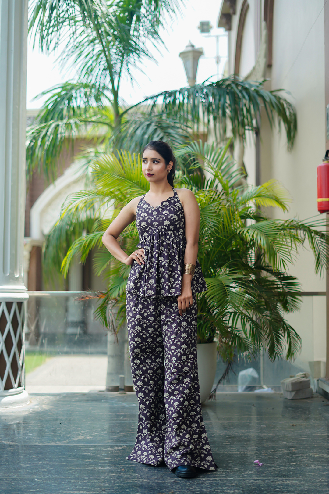 Redefine effortless style with this V Glame Charcoal Black Peplum Co-ord Set, made from soft and breathable printed cotton fabric. The scalloped peplum top pairs beautifully with wide-leg bottoms featuring side slits, offering both comfort and sophistication. Perfect for chic casual outings or semi-formal events, this outfit blends modern flair with timeless elegance.