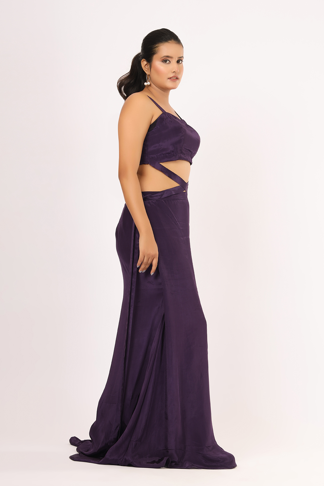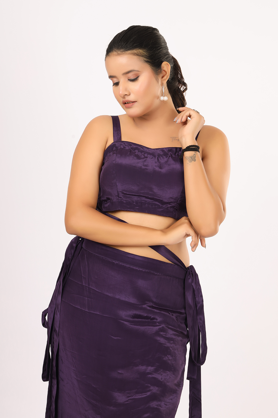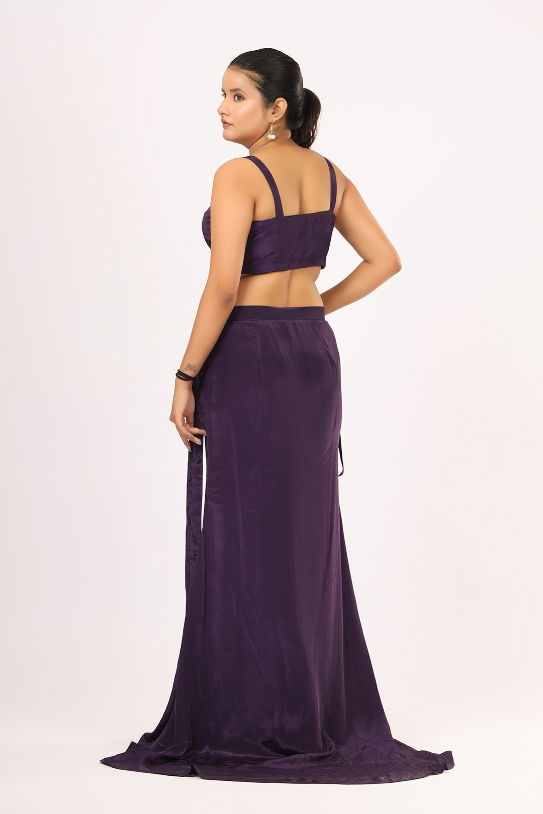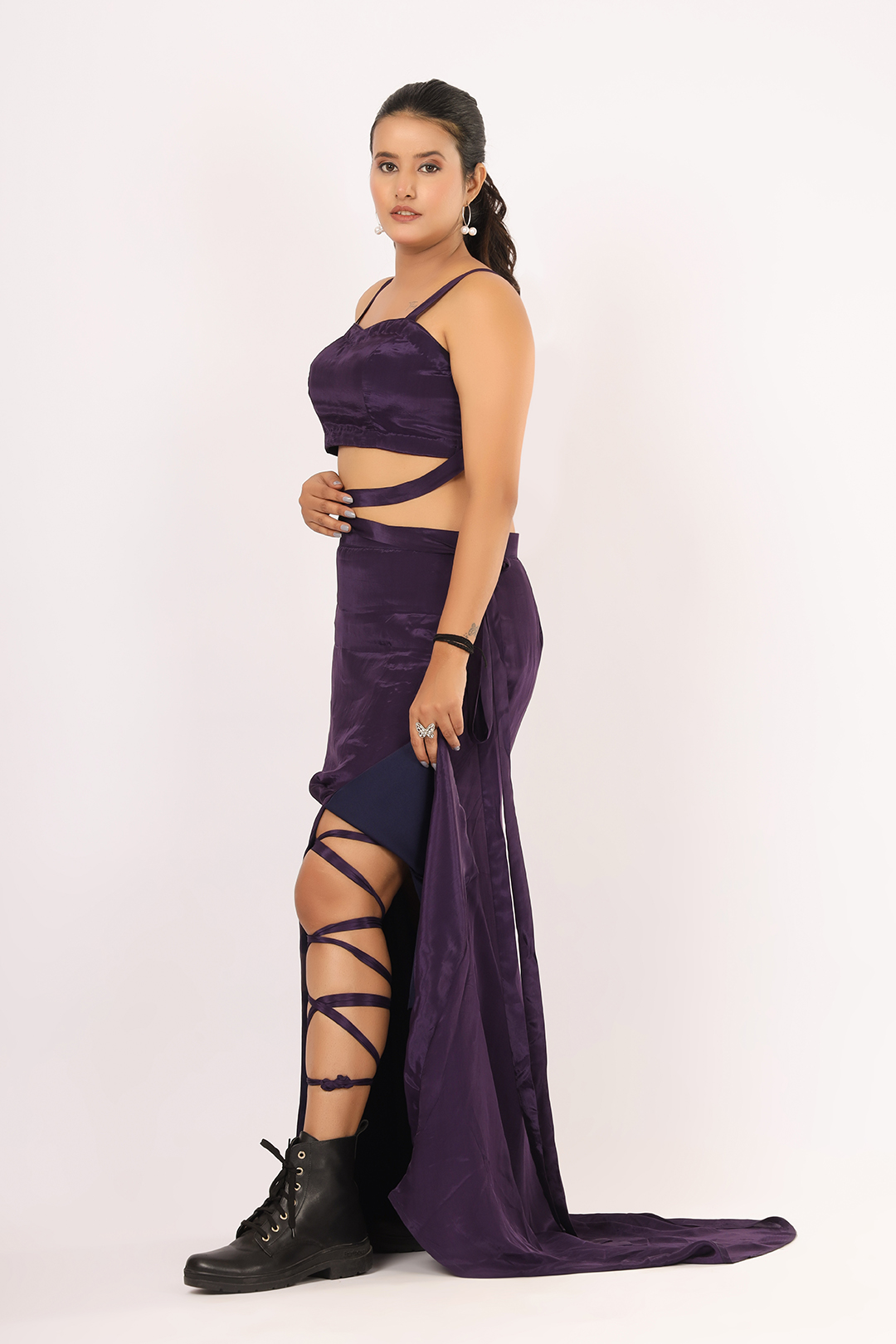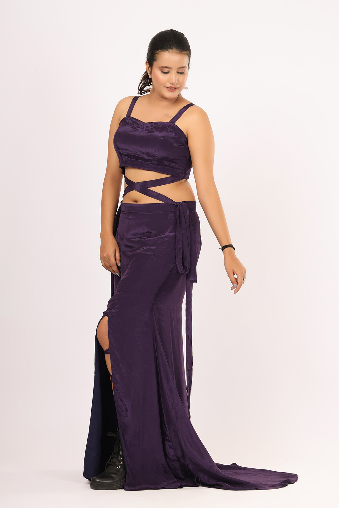 Step into classic sophistication with this V Glame Two-Piece Dress, crafted from premium pure natural crepe fabric in a sleek purple color. The outfit features a crop top paired with a long fitted skirt that includes a stylish side leg slit, creating a modern and elegant silhouette. Perfect for evening occasions and parties, this ensemble exudes timeless charm.