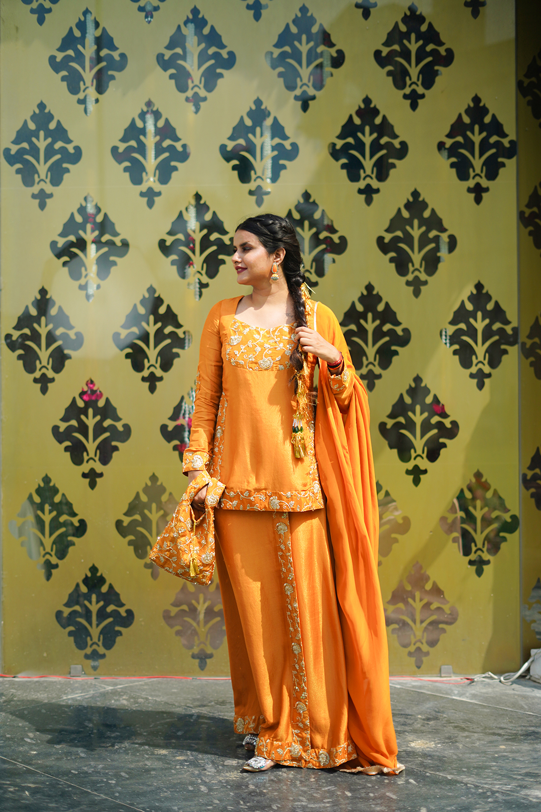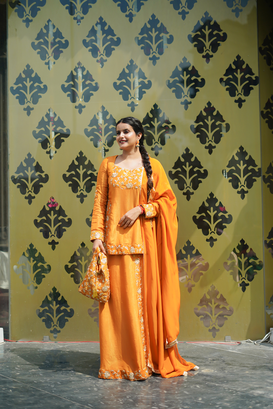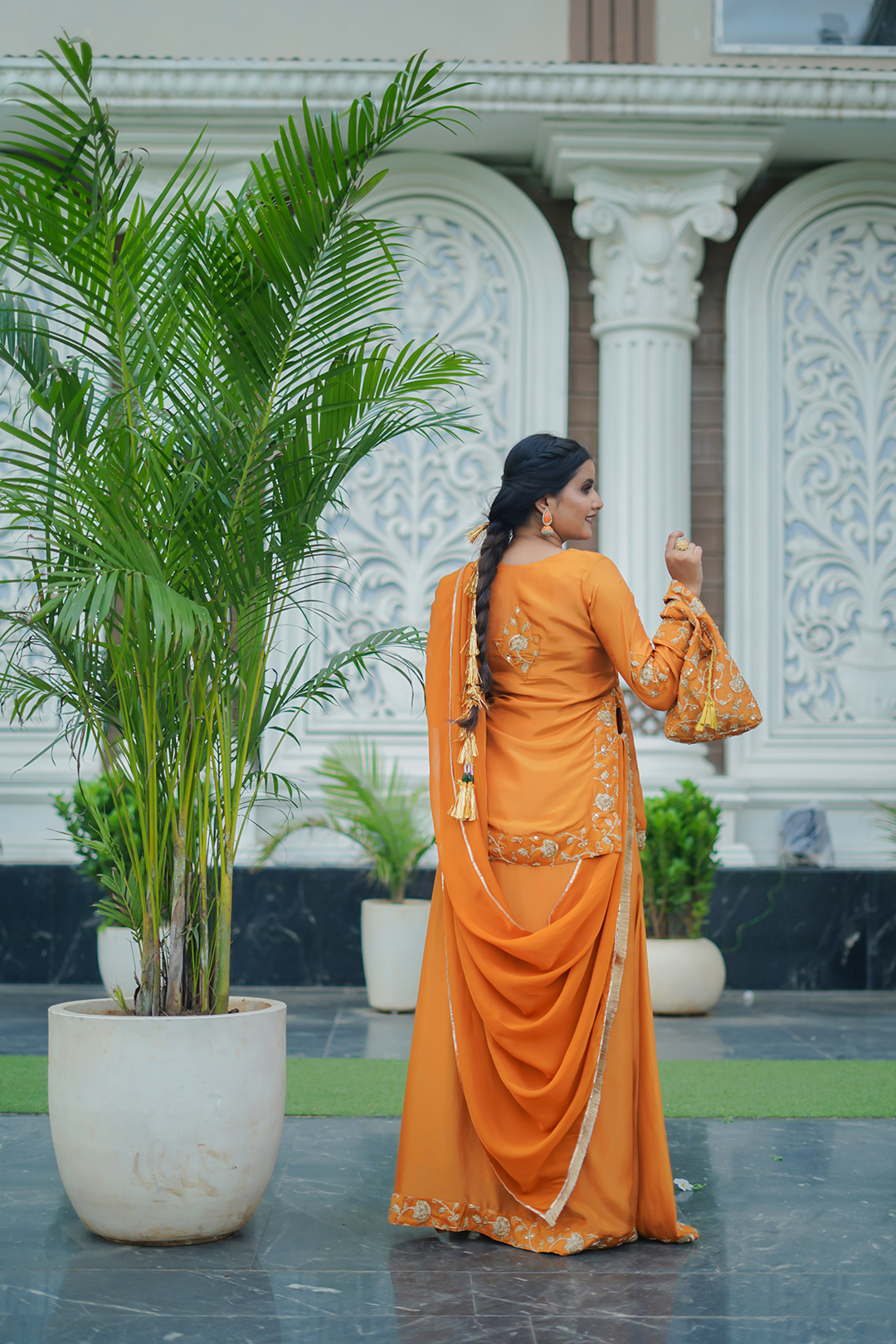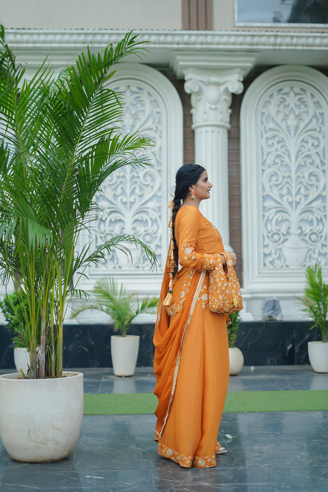 Turn every occasion into a style statement with this V Glame Rust Orange Three-Piece Dress, crafted from a blend of glamour viscose, work glamour viscose, and organza fabrics. The outfit features a full-sleeve short kurti with a detailed work yoke, paired with an A Line drape skirt for a graceful silhouette. The dupatta is finished with delicate fringes lace, adding a touch of modern elegance to this traditional look.