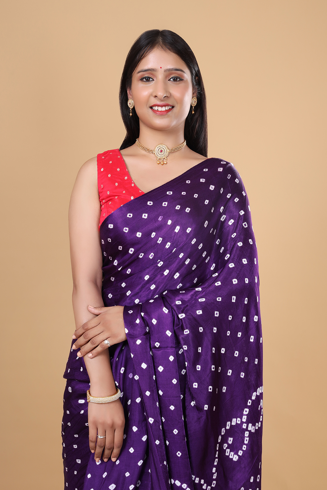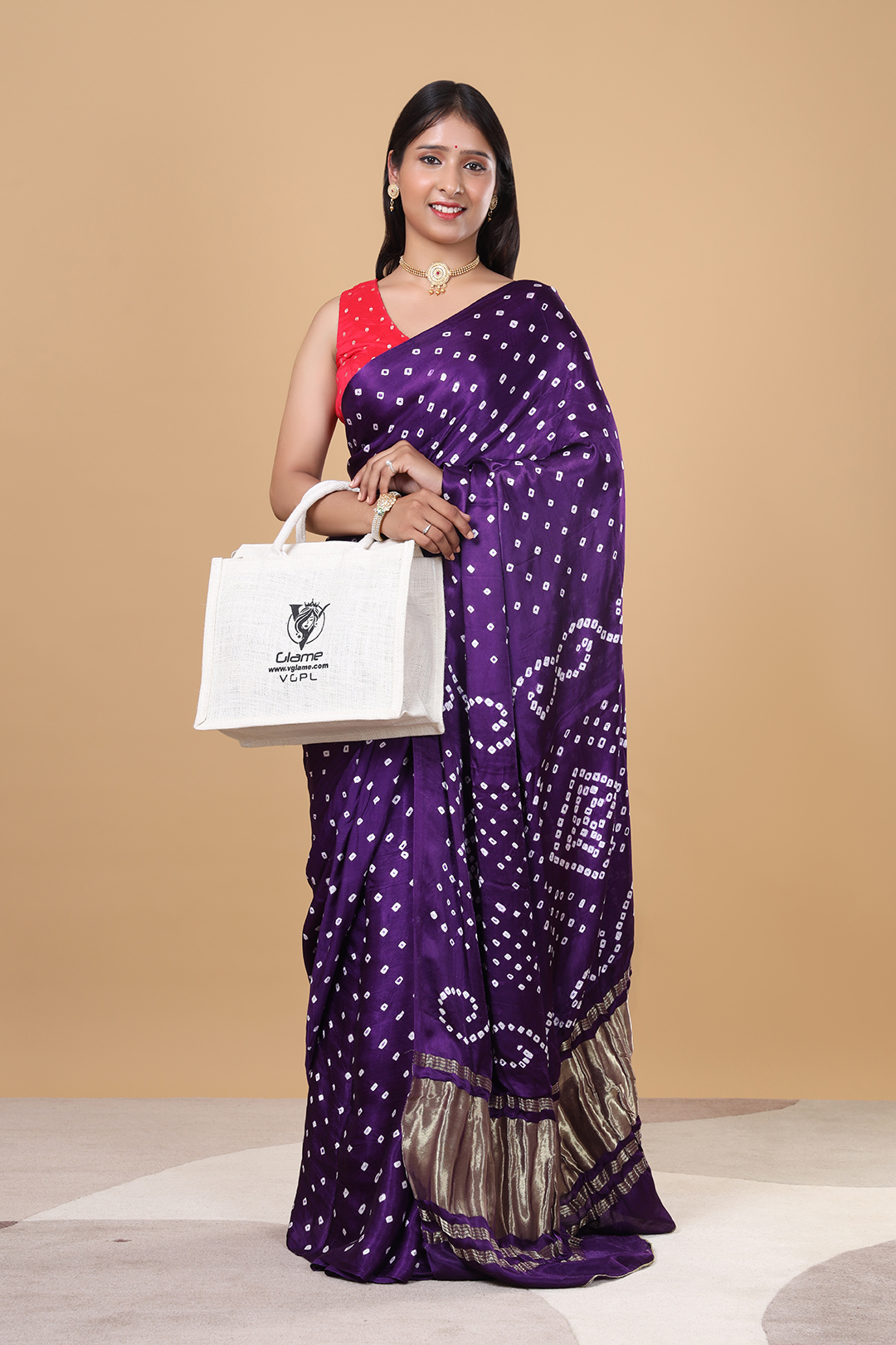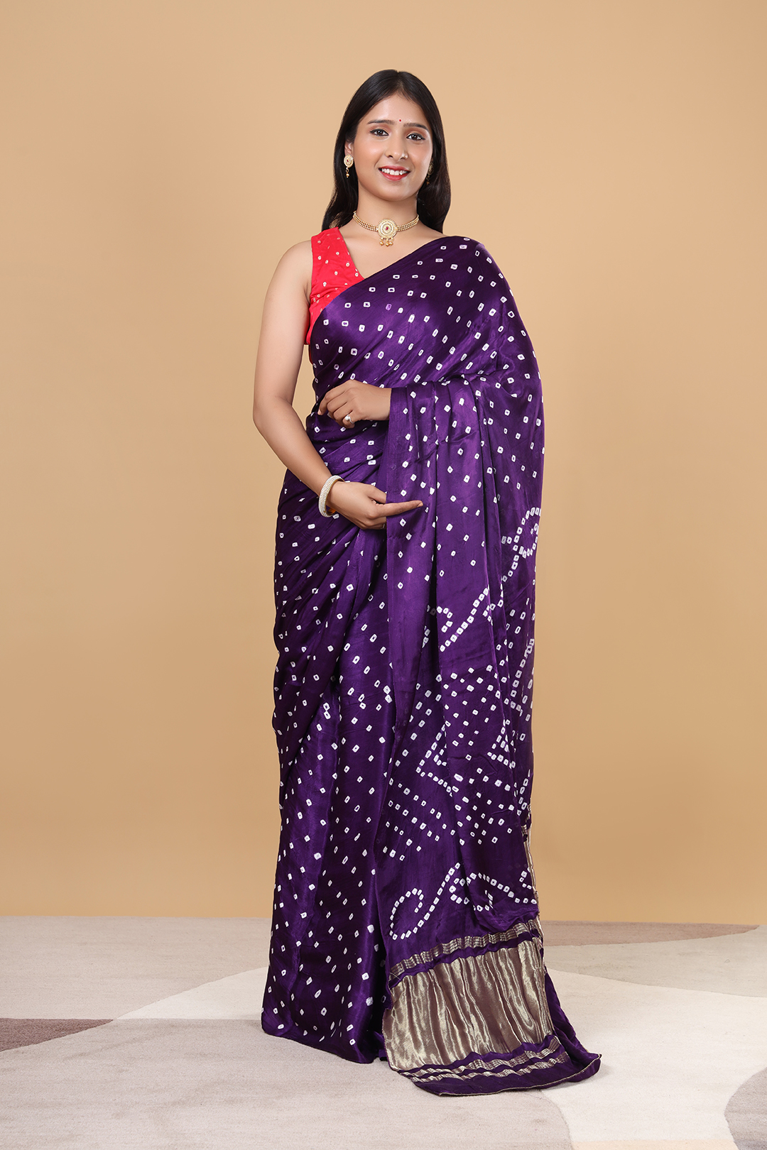 Bring a touch of elegance to your ethnic collection with this single solid colour saree in royal blue, crafted from premium Gajji Bandhej fabric and designed by Team V Glame. The saree features intricate Bandhej (Bandhani) patterns throughout, complemented by a full zari pallu, adding a luxurious and festive charm.