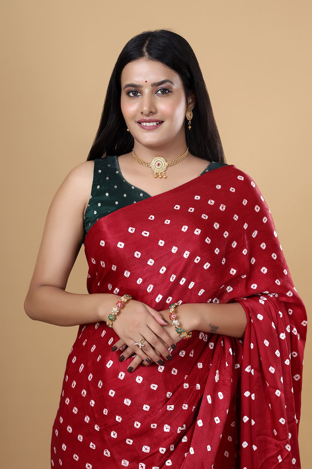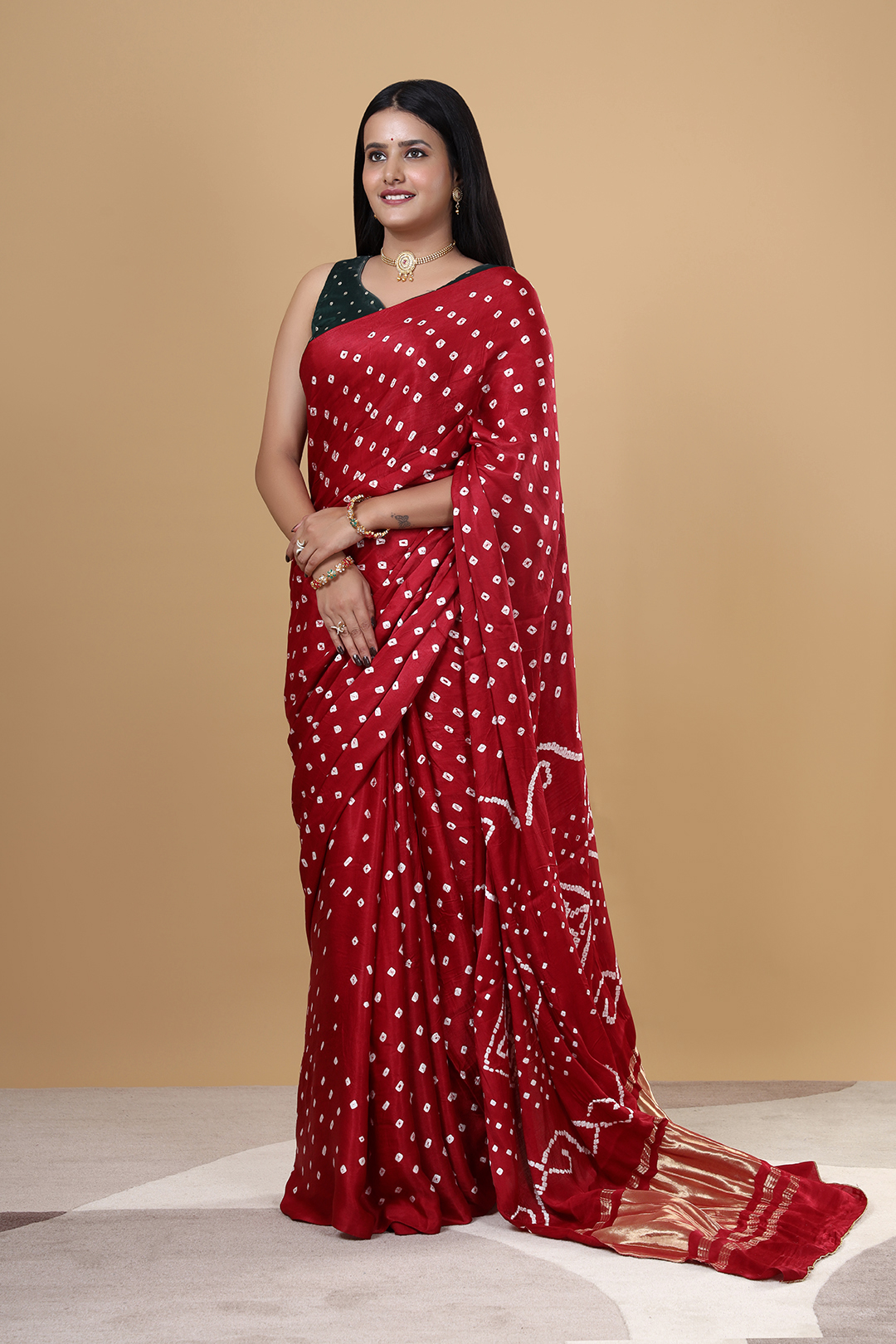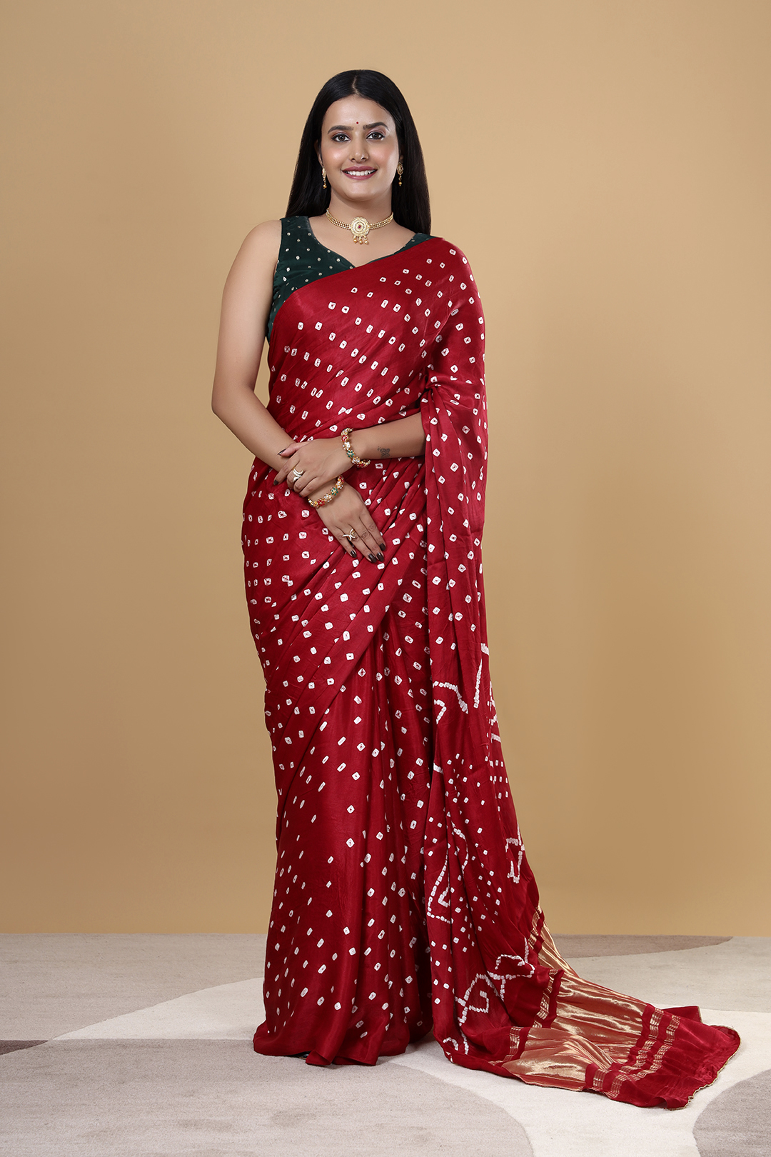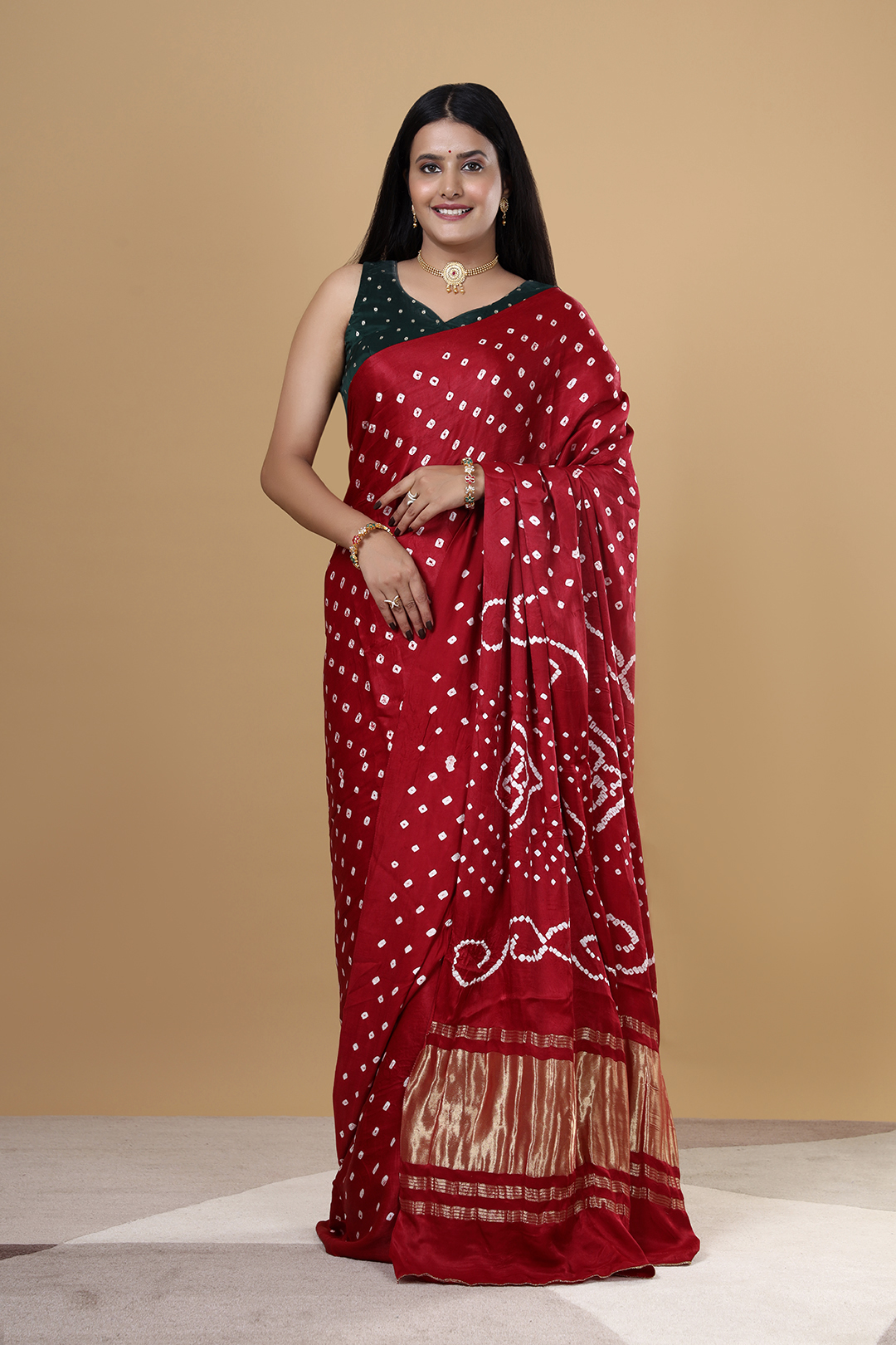 Perfect for weddings, festive occasions, and cultural events, this maroon Gajji Bandhej saree reflects the beauty of traditional Indian craftsmanship. Its smooth texture and graceful fall make it an ideal choice for women who prefer both comfort and sophistication in their festive wear.