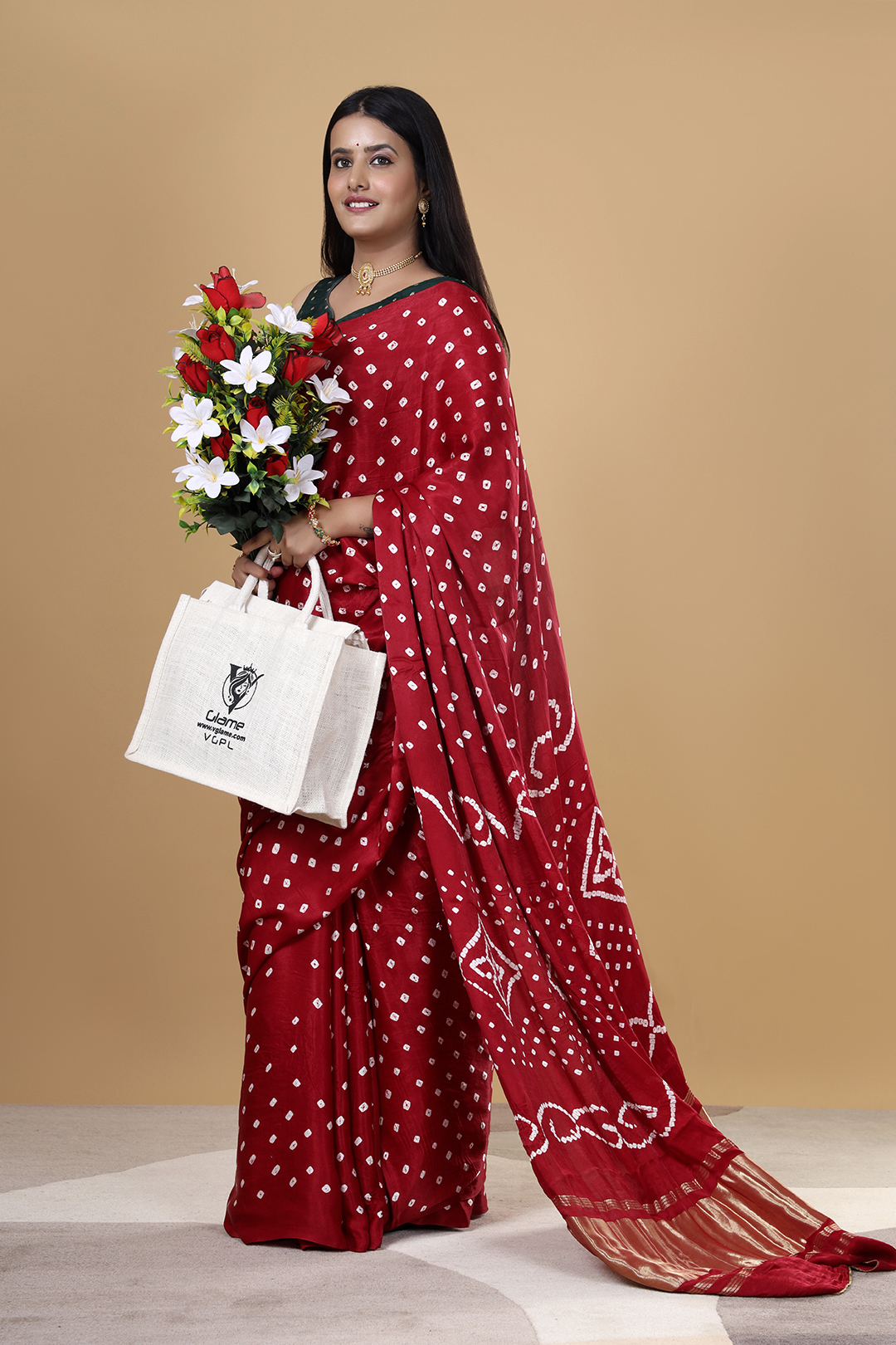 Celebrate timeless tradition with this elegant single solid colour saree in deep maroon, crafted from premium Gajji Bandhej fabric and designed by Team V Glame. Showcasing intricate Bandhej (Bandhani) patterns across the drape, this saree is elevated with a rich zari pallu that adds a royal touch to your ethnic look.