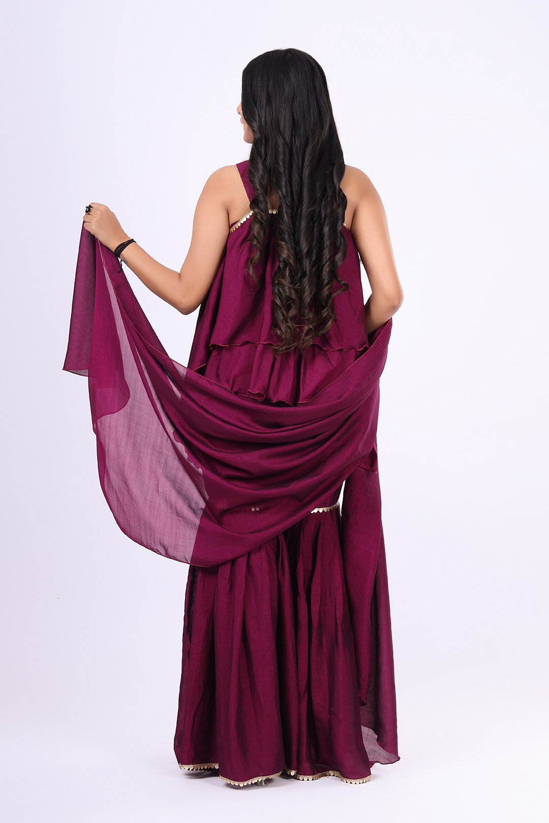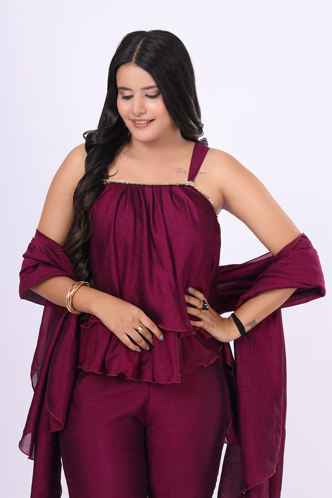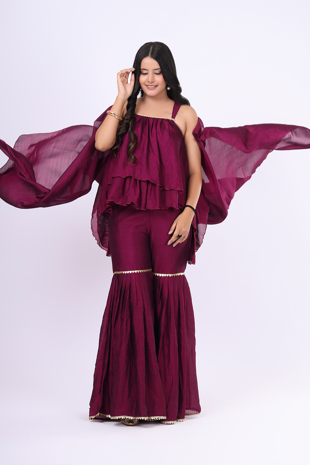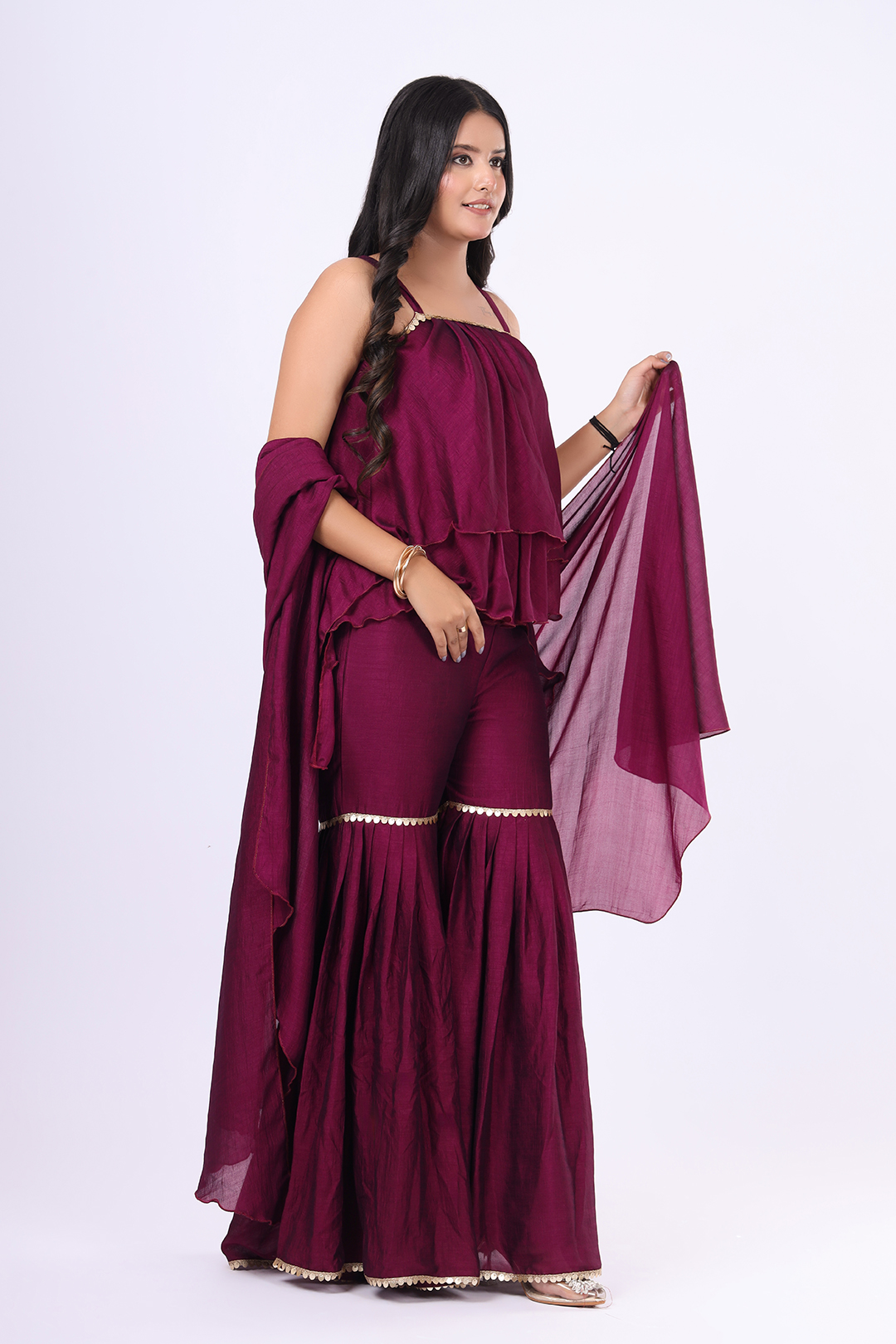 Step into elegance with this V Glame Wine Purple Three-Piece Dress, crafted from rich V Silk fabric. The outfit features a gathered double-layer top, paired with a flared sharara and a beautifully coordinated dupatta, creating a graceful and festive look. Perfect for celebrations and traditional occasions, this set blends comfort, charm, and luxury effortlessly.
