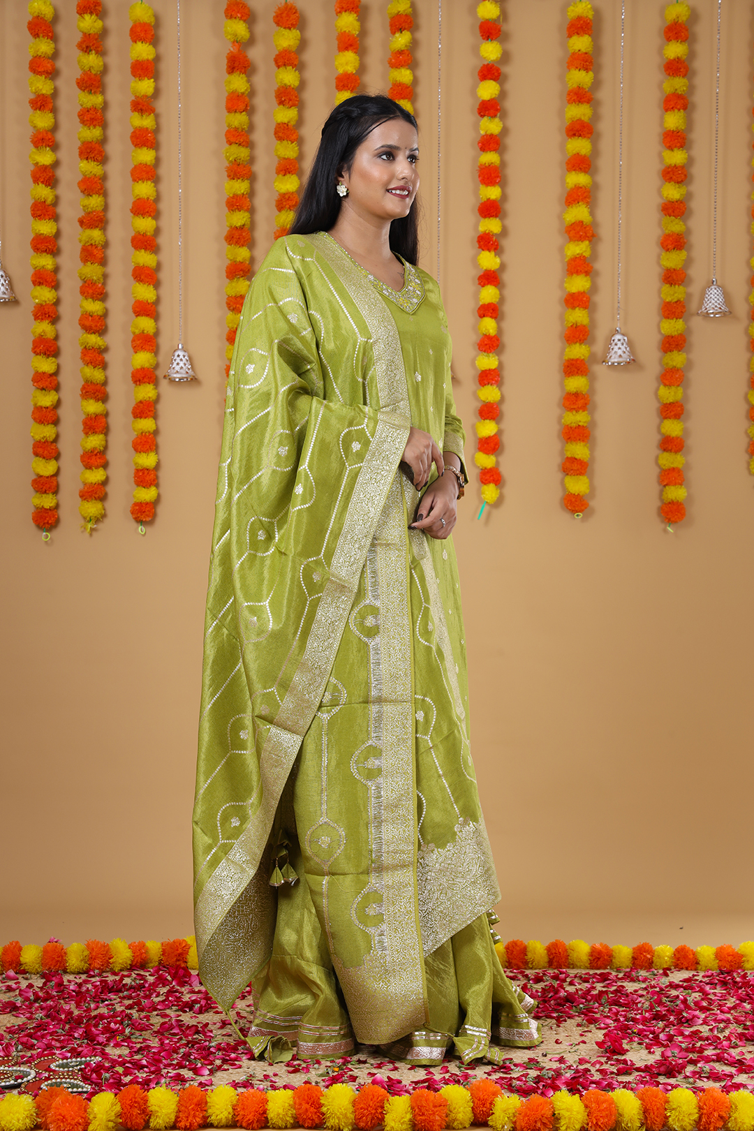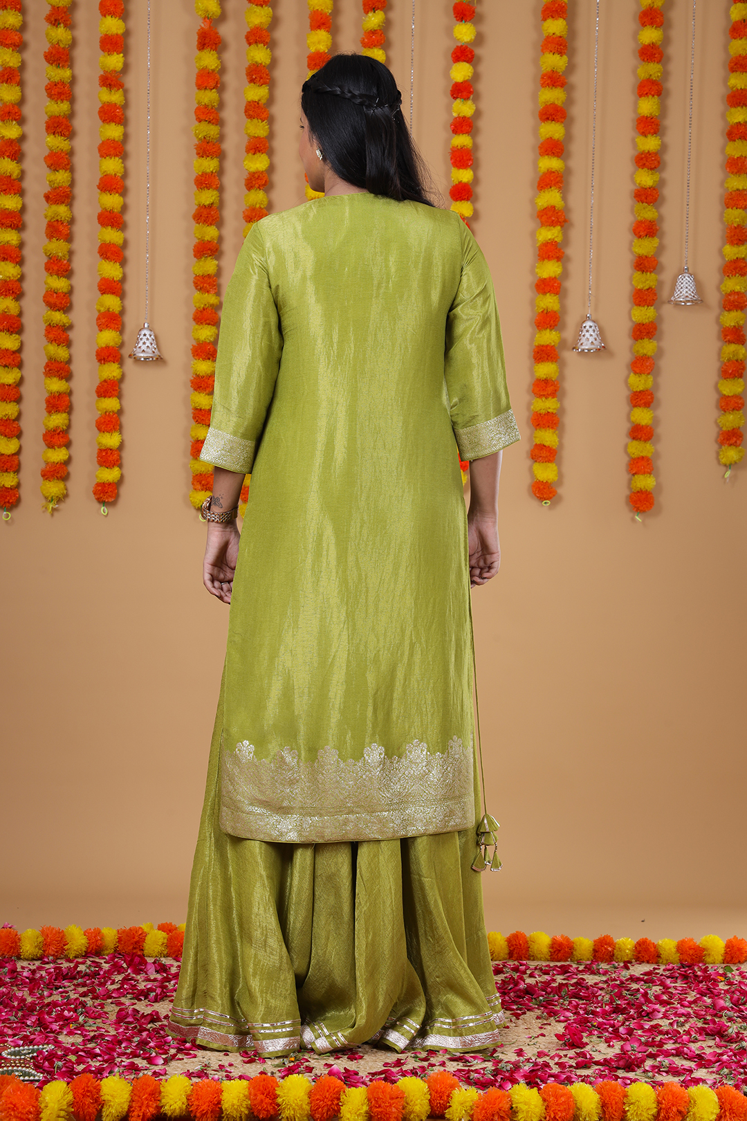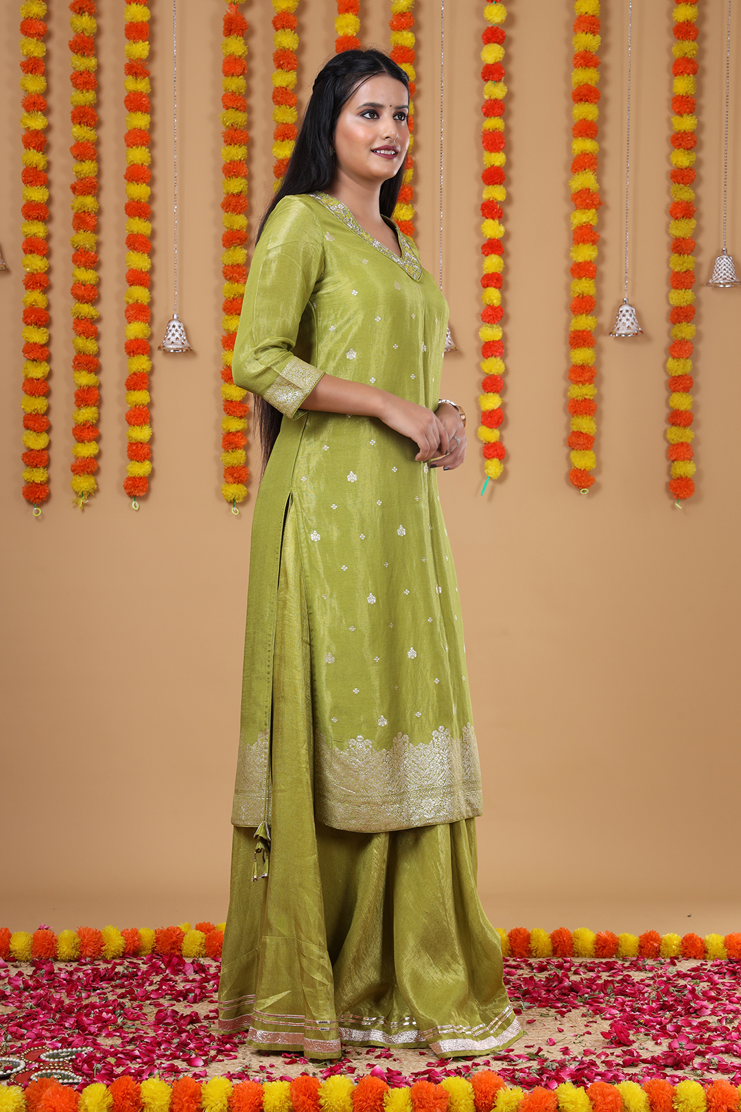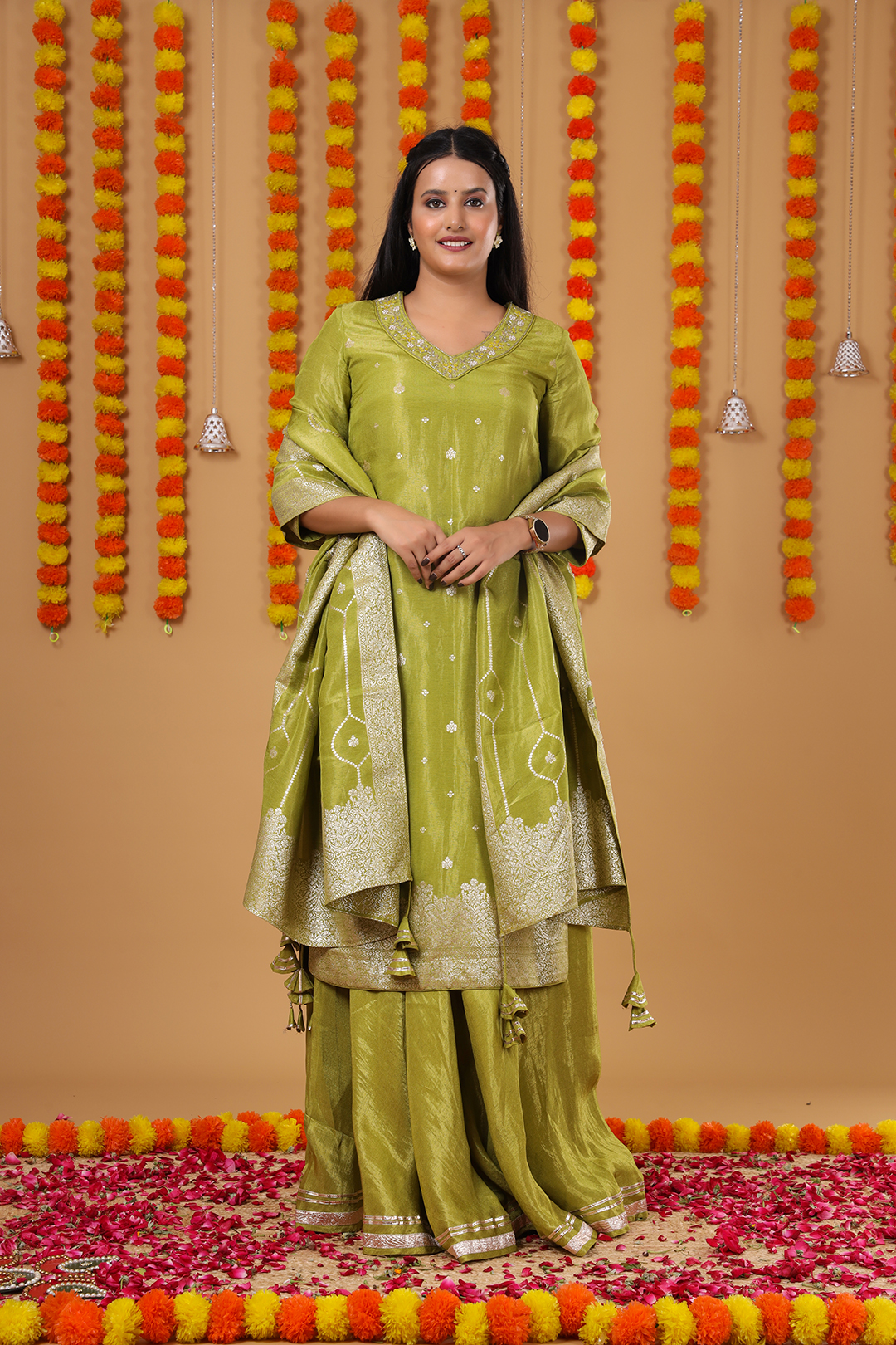 The kurta is highlighted with a delicately designed neckline featuring fine hand work, giving it a sophisticated ethnic appeal. To enhance its graceful silhouette, dori tassels are attached at the side seams of the kurta, adding charm and elegance. Completing the ensemble is a heavy zari dupatta, designed with edges finished with tassels for a luxurious festive look.