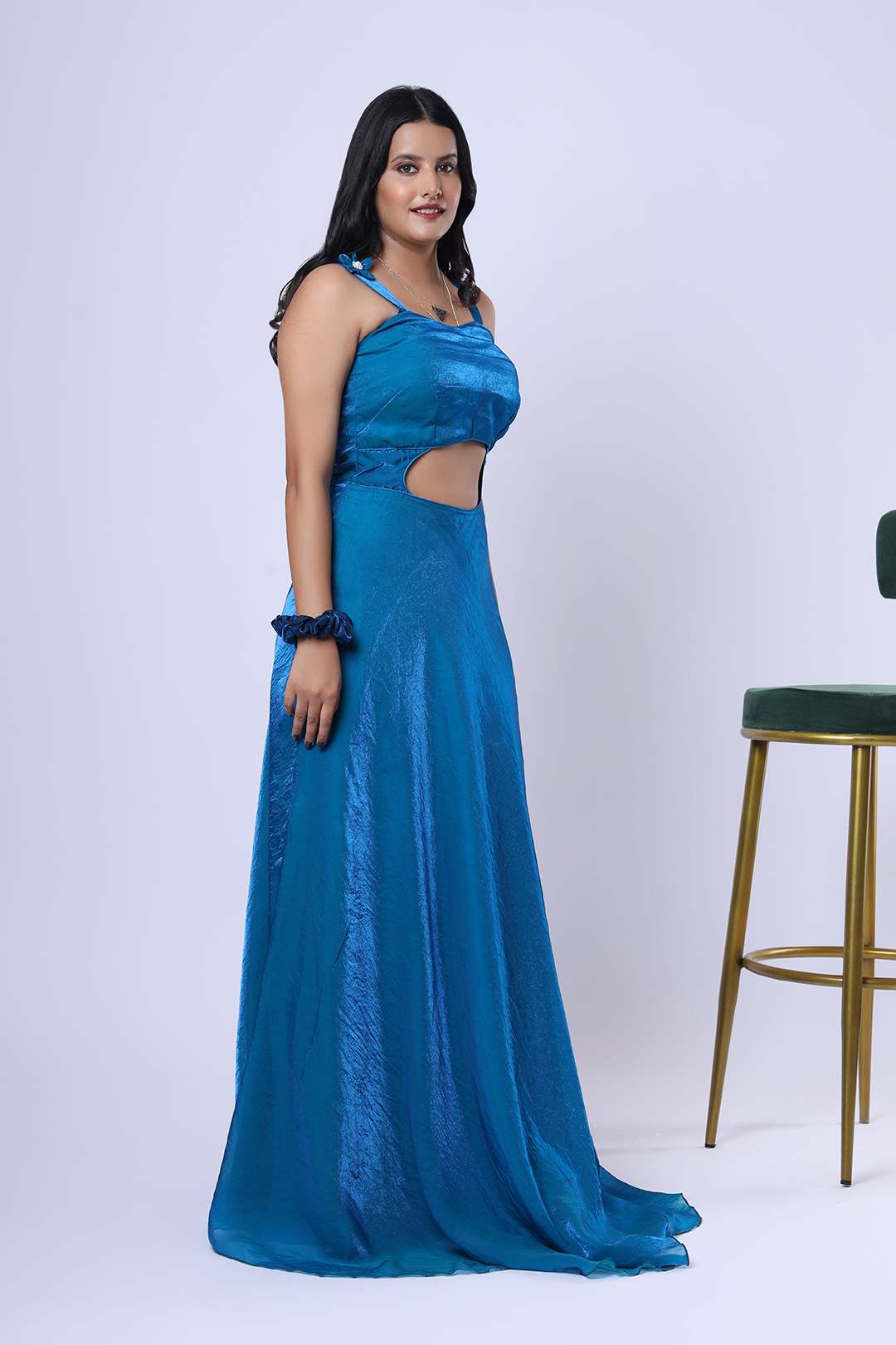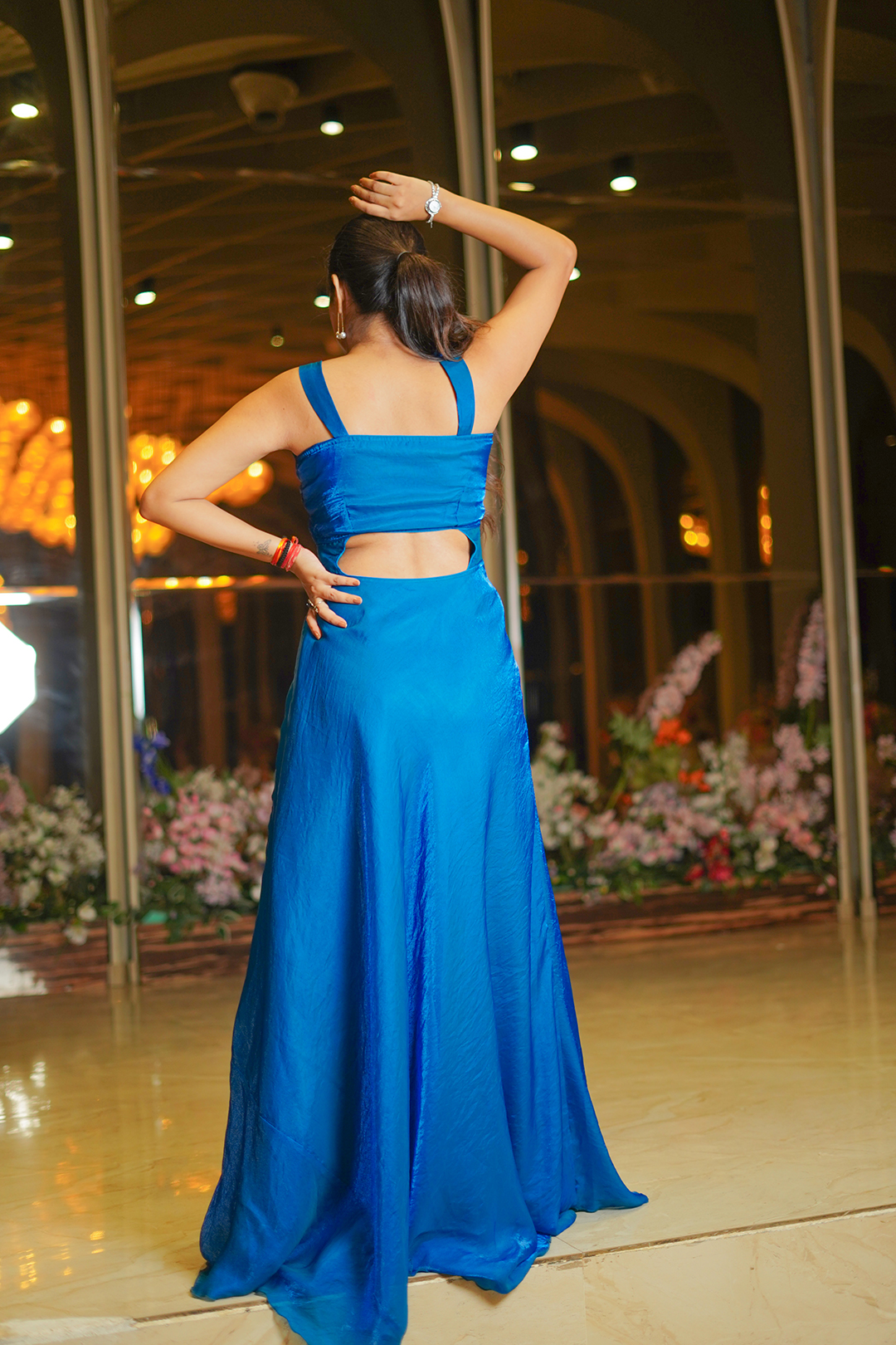Step into elegance with the Vglame Blue Golden Satin Flared One Piece Dress, a perfect blend of luxury and style. Crafted from premium golden satin fabric, this stunning blue dress is designed to offer a graceful flow and timeless charm, making it an ideal choice for parties, evening gatherings, and festive occasions.