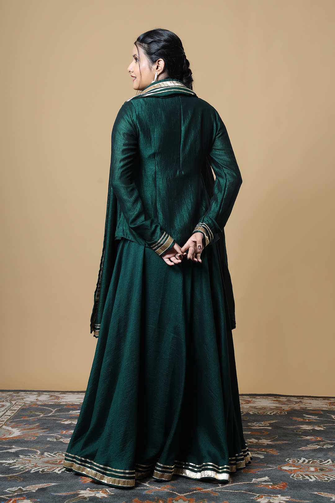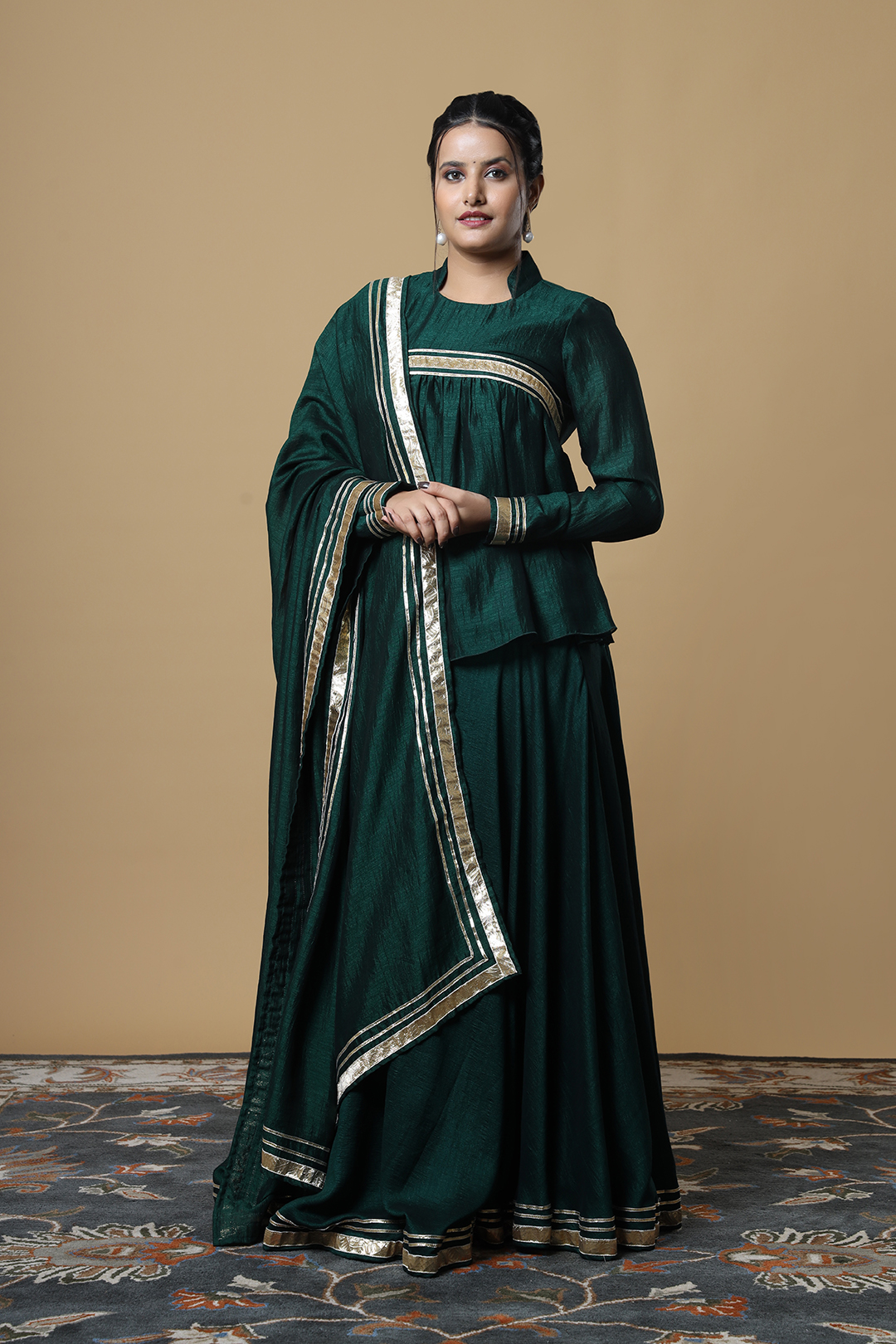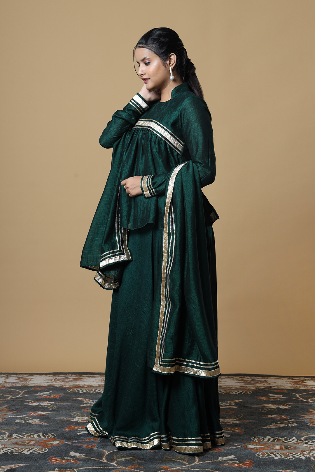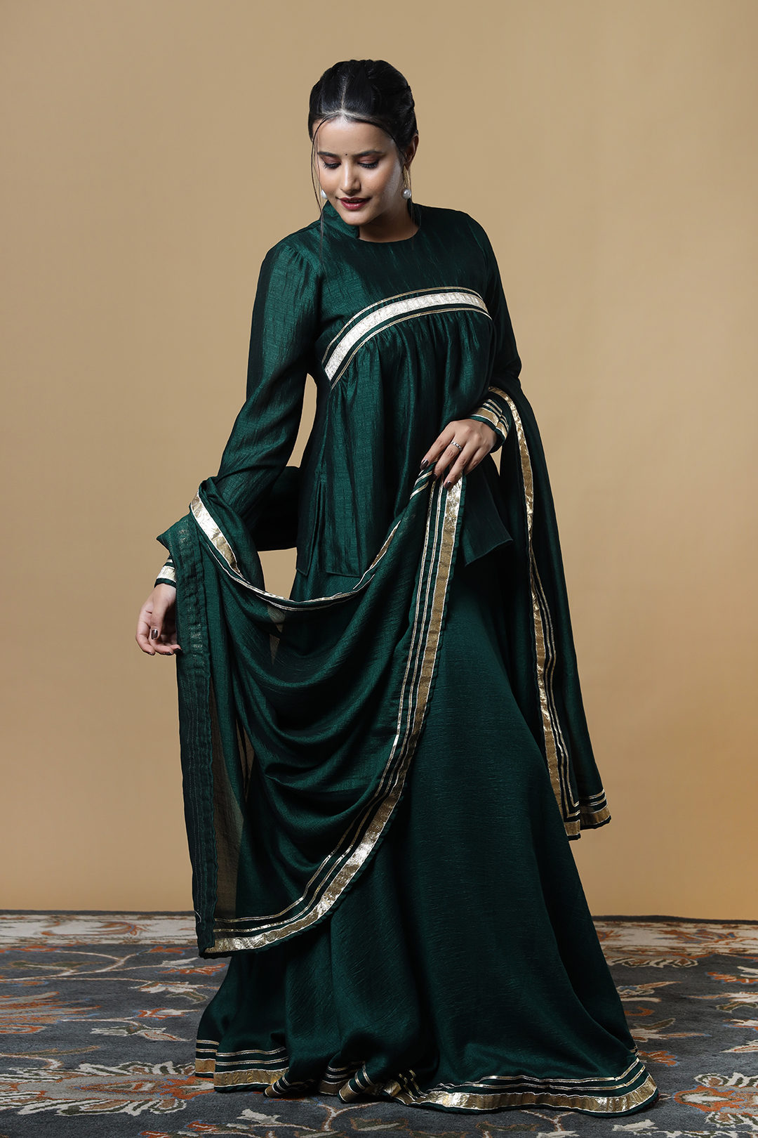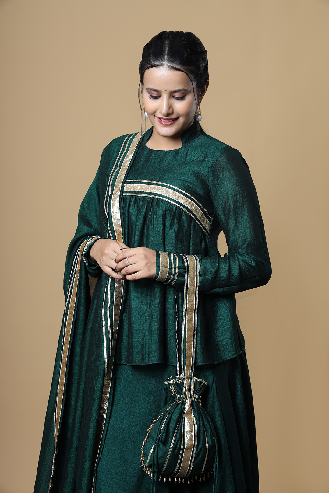 Enhance your ethnic wardrobe with the elegant Vglame Green Yoke Gathered Kurta Set, crafted from premium V Silk. The refreshing green shade combined with intricate gota work makes this ensemble a perfect choice for weddings, festive occasions, and traditional celebrations.