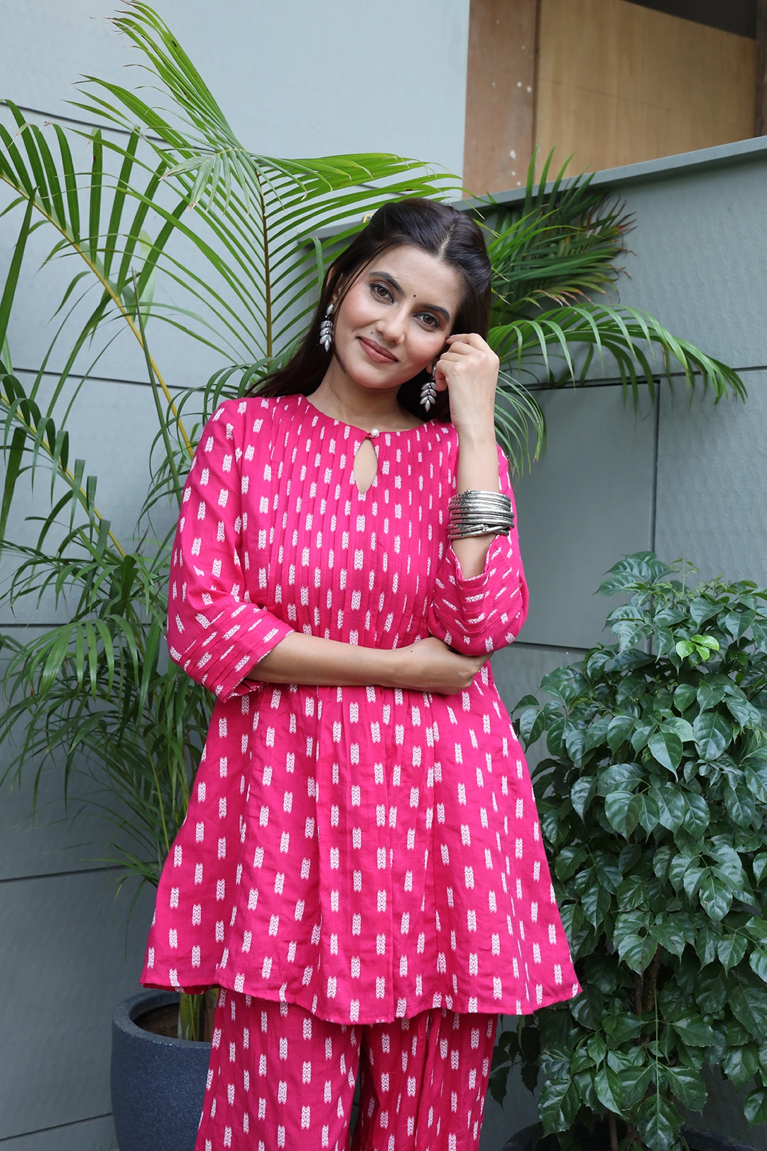 Crafted from premium cotton dobby fabric, this set ensures all-day comfort with its breathable and lightweight texture—perfect for casual outings, workwear, or small gatherings. The kurti is beautifully enhanced with pin tuck detailing, adding subtle texture and sophistication to the overall look.