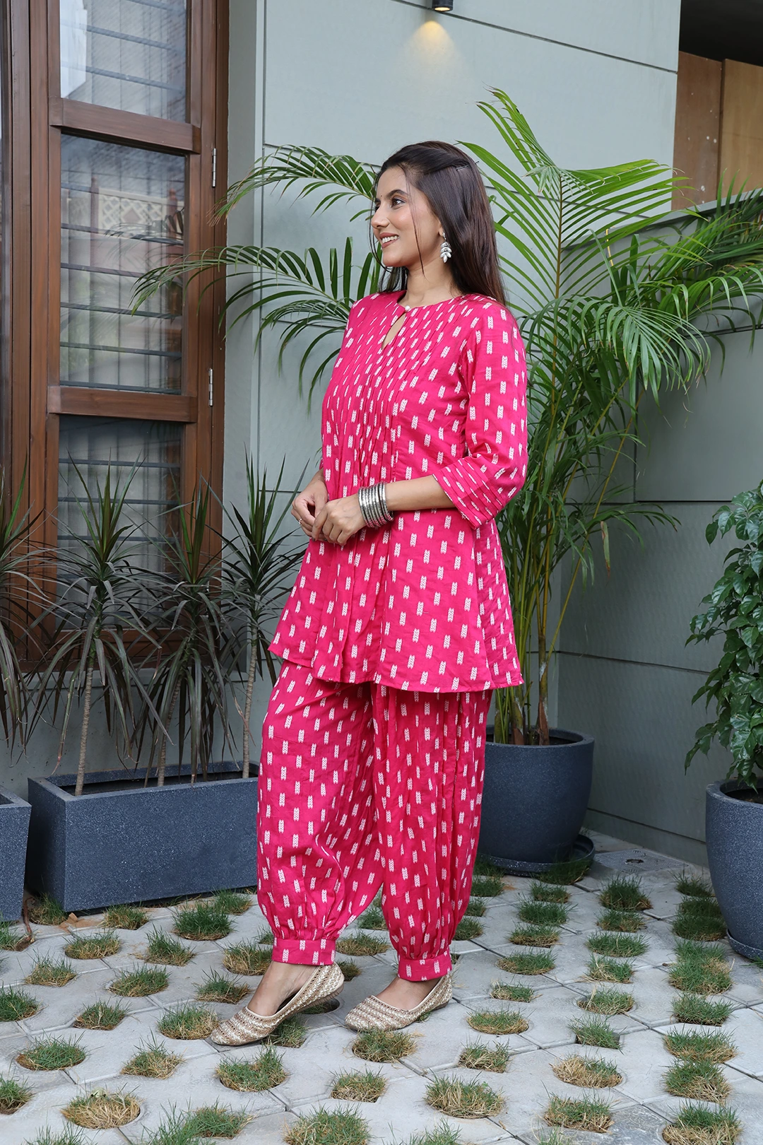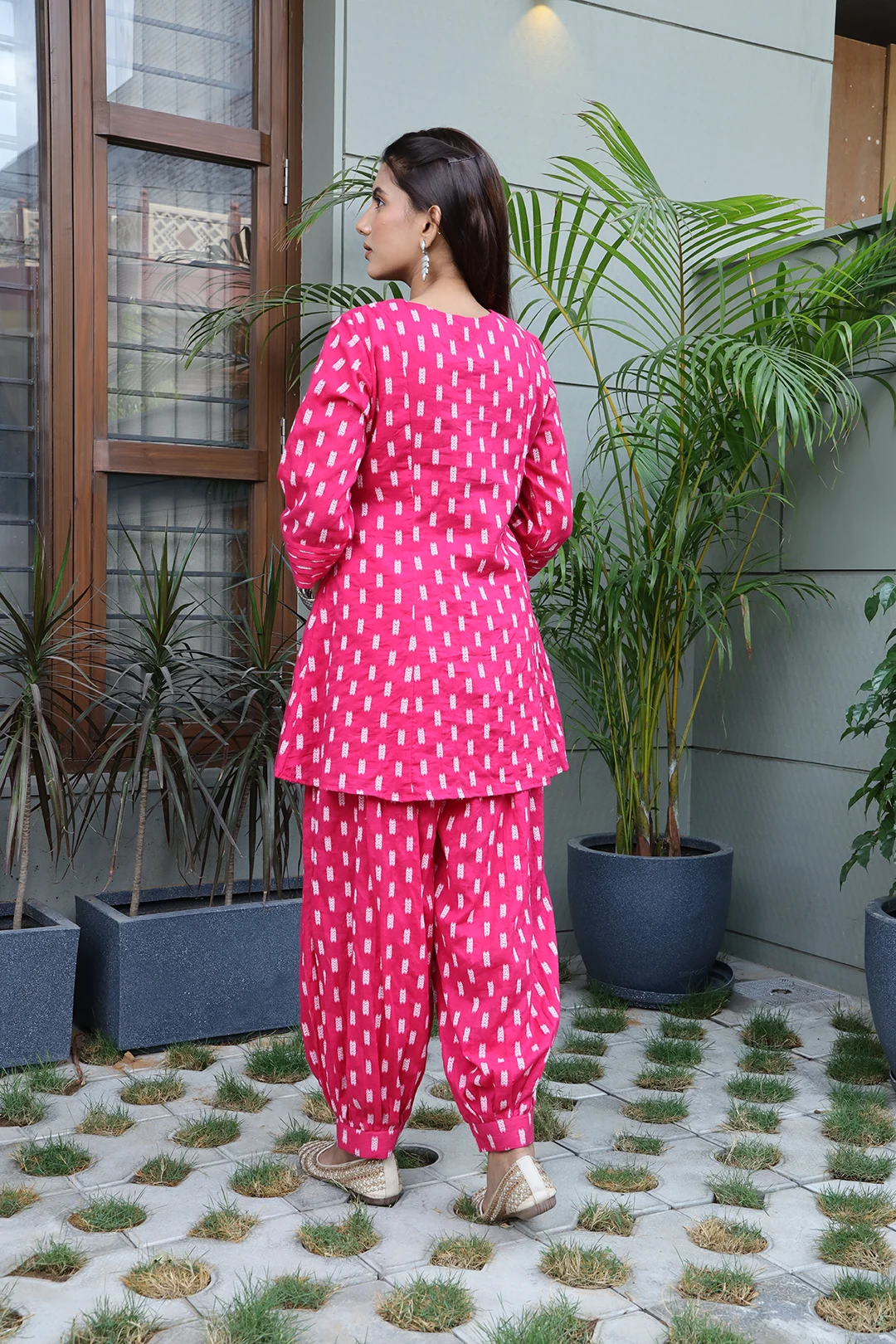 Elevate your everyday ethnic style with this elegant Pink Cotton Afghani Set from Vglame, designed for modern women who love a blend of comfort and fusion fashion. This Indo-western 2-piece outfit features a short flared kurti paired with a stylish Afghani bottom, creating a trendy yet traditional silhouette.