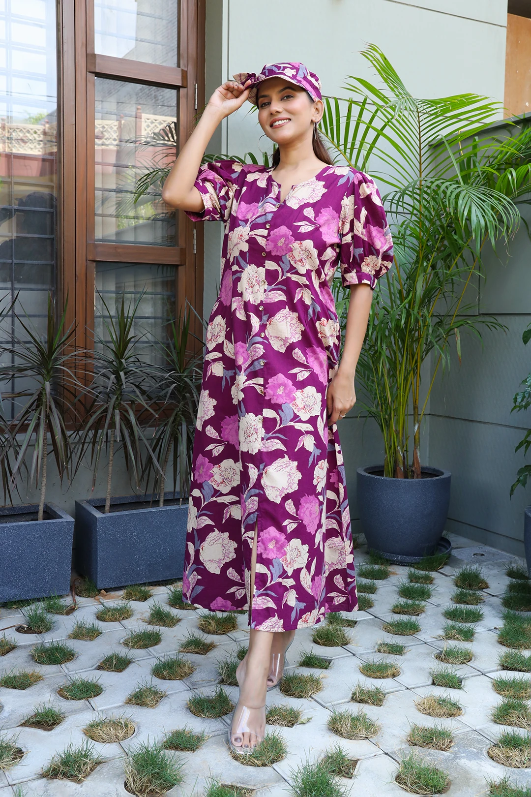 Step into effortless summer style with this charming Wine Floral Cotton One Piece Dress from Vglame, thoughtfully designed to keep you cool, comfortable, and stylish. Featuring a beautiful floral bunch print on a rich wine-colored base, this outfit is perfect for vacations, day outings, and casual wear.