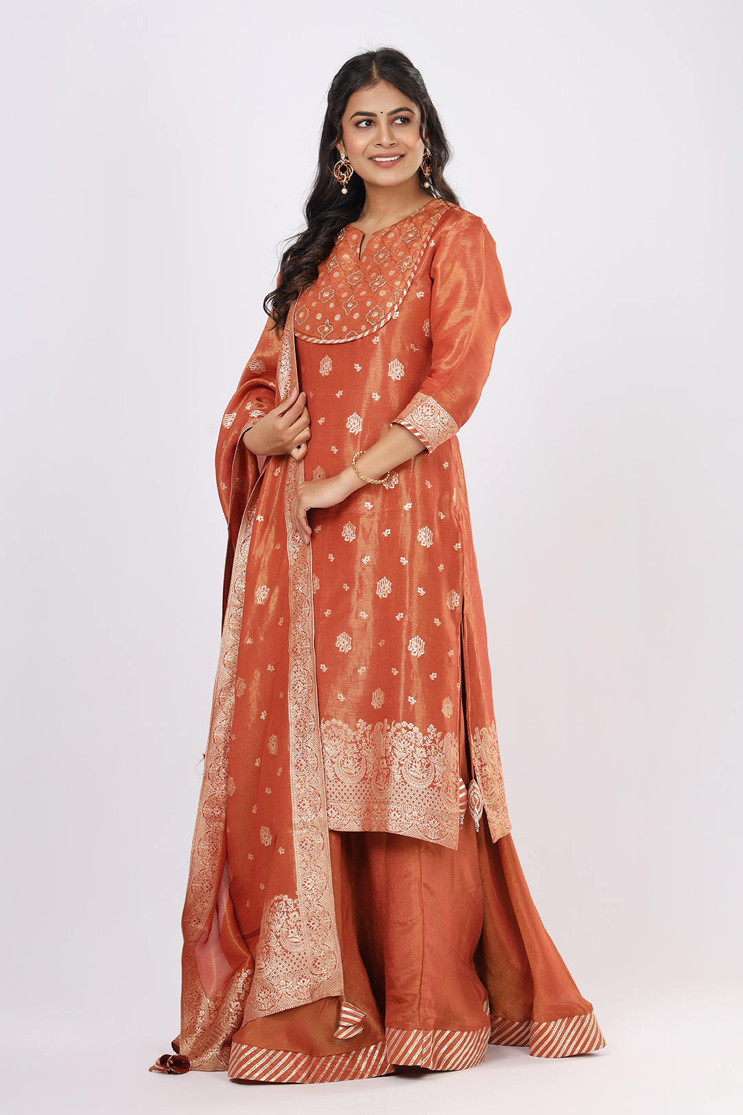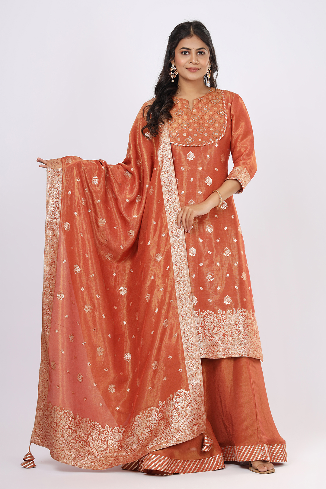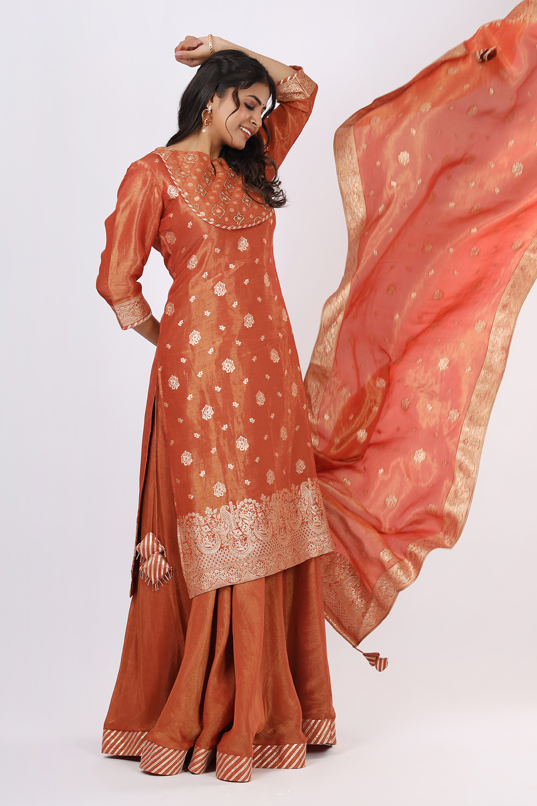 This set features a kurta with intricately hand-worked neck yoke and magzi piping, a flared lehenga with gota work at the bottom, and a coordinating heavy zari dupatta finished with tassels for added elegance.