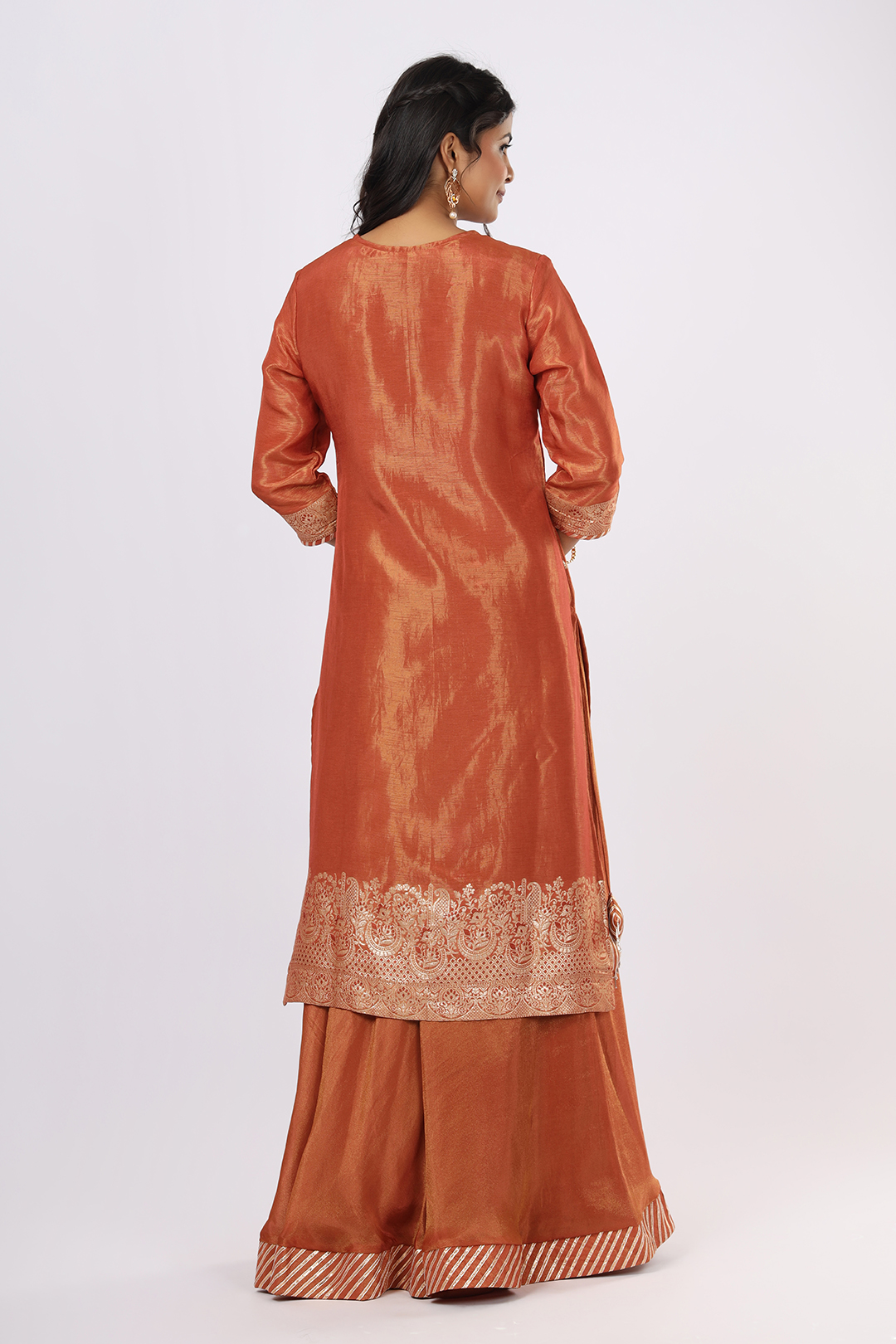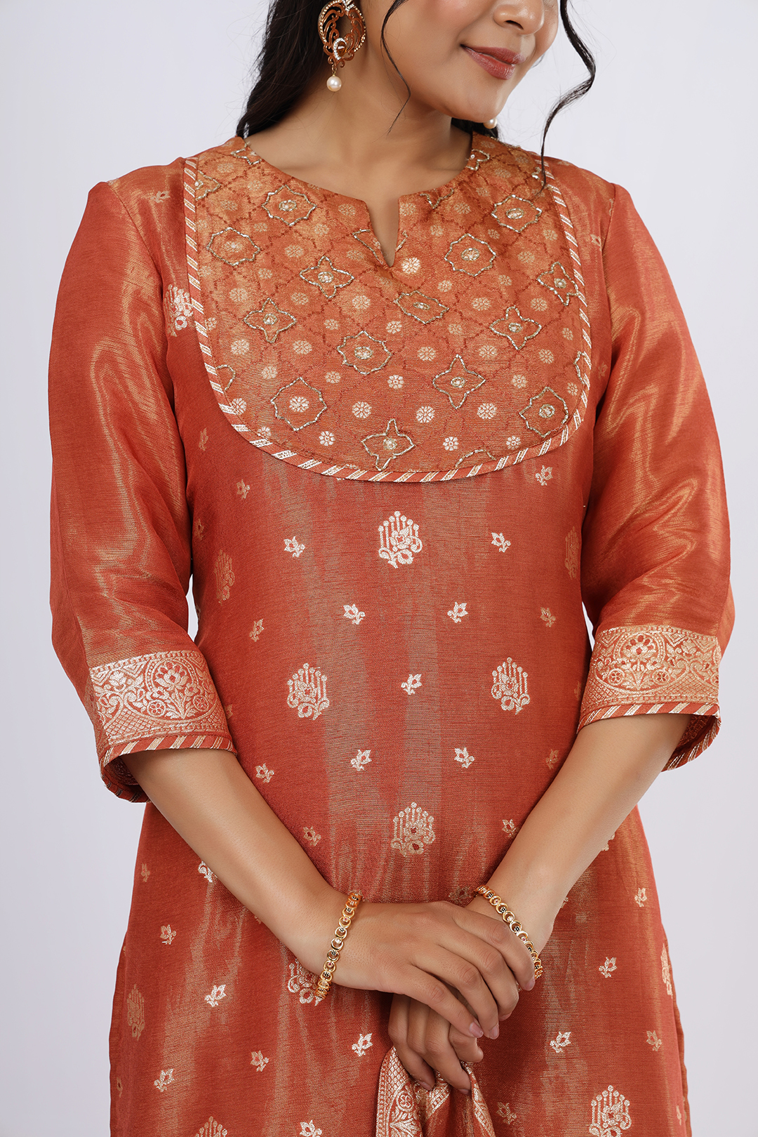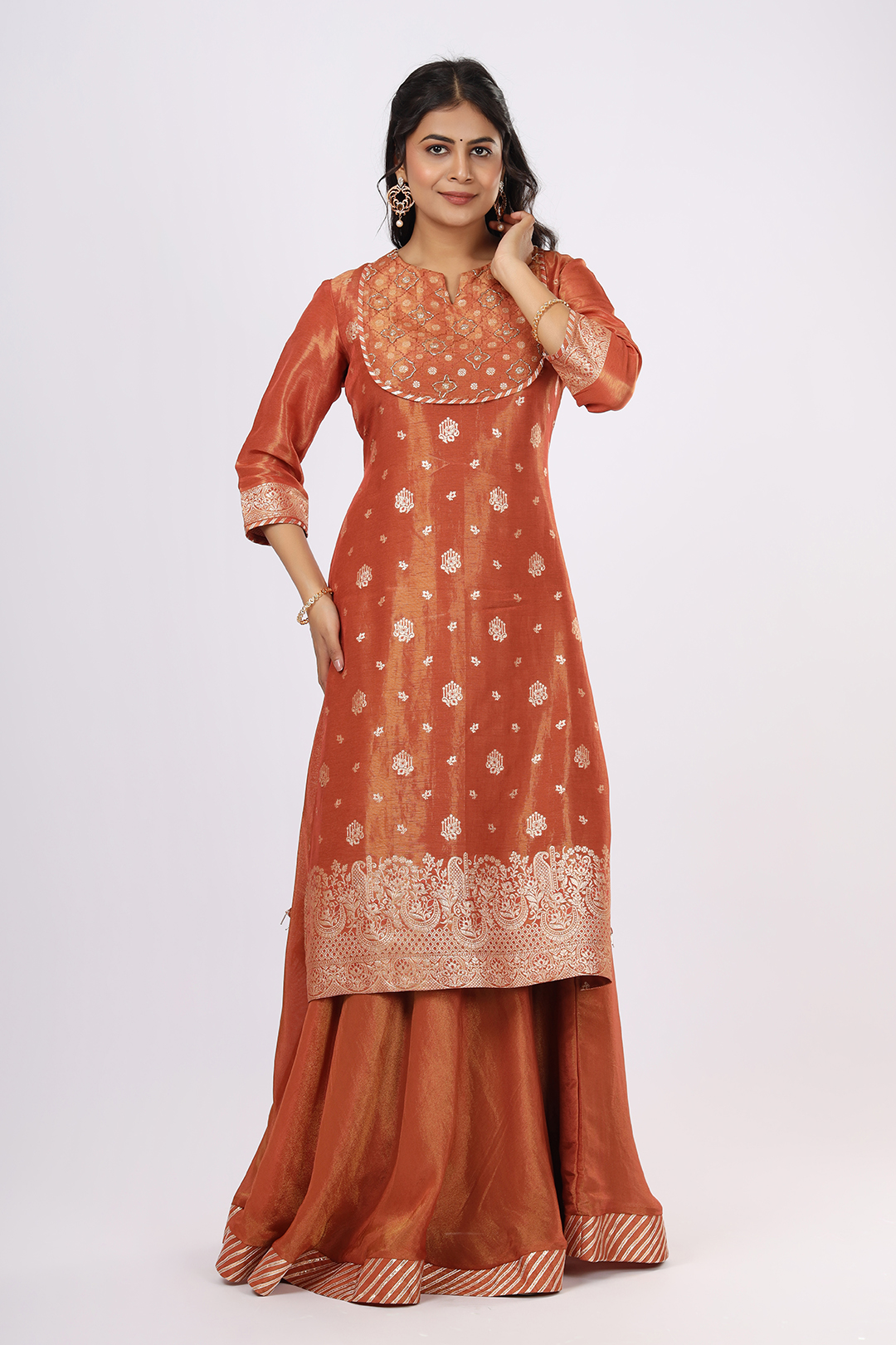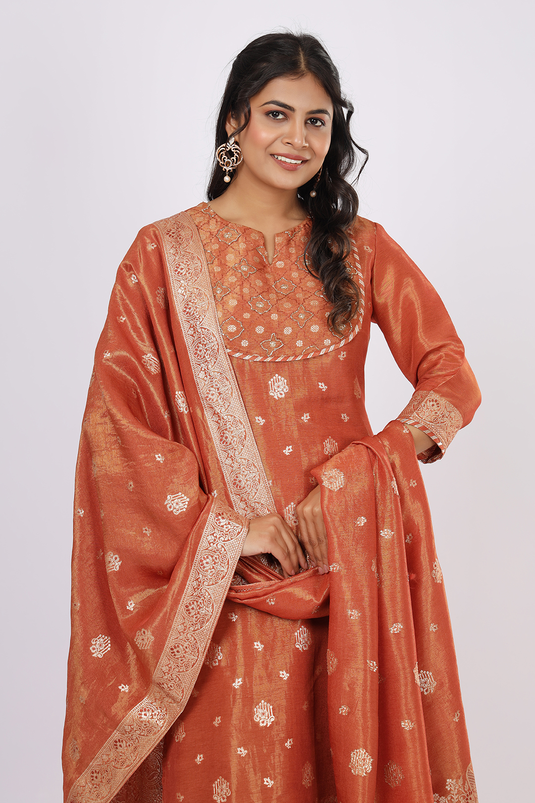 This set features a kurta with intricately hand-worked neck yoke and magzi piping, a flared lehenga with gota work at the bottom, and a coordinating heavy zari dupatta finished with tassels for added elegance.