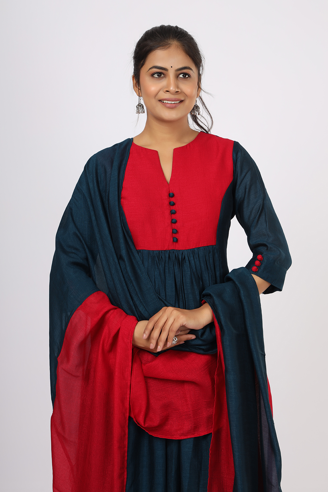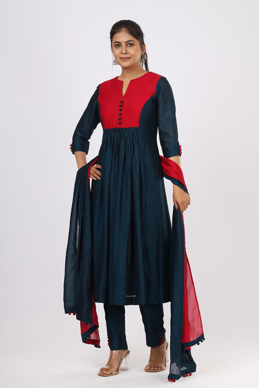 The kurta features a designer yoke pattern paired with a gathered flared silhouette, offering both movement and charm. Complementing the look is a double-color dupatta and a coordinated bottom enhanced with potli button embellishments, adding subtle detailing to the ensemble.