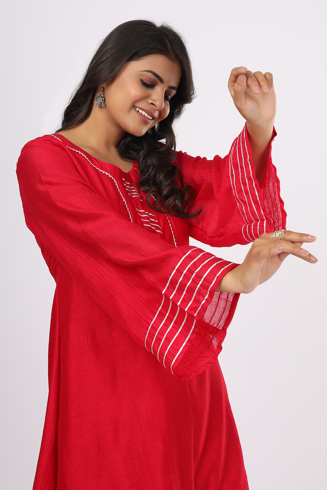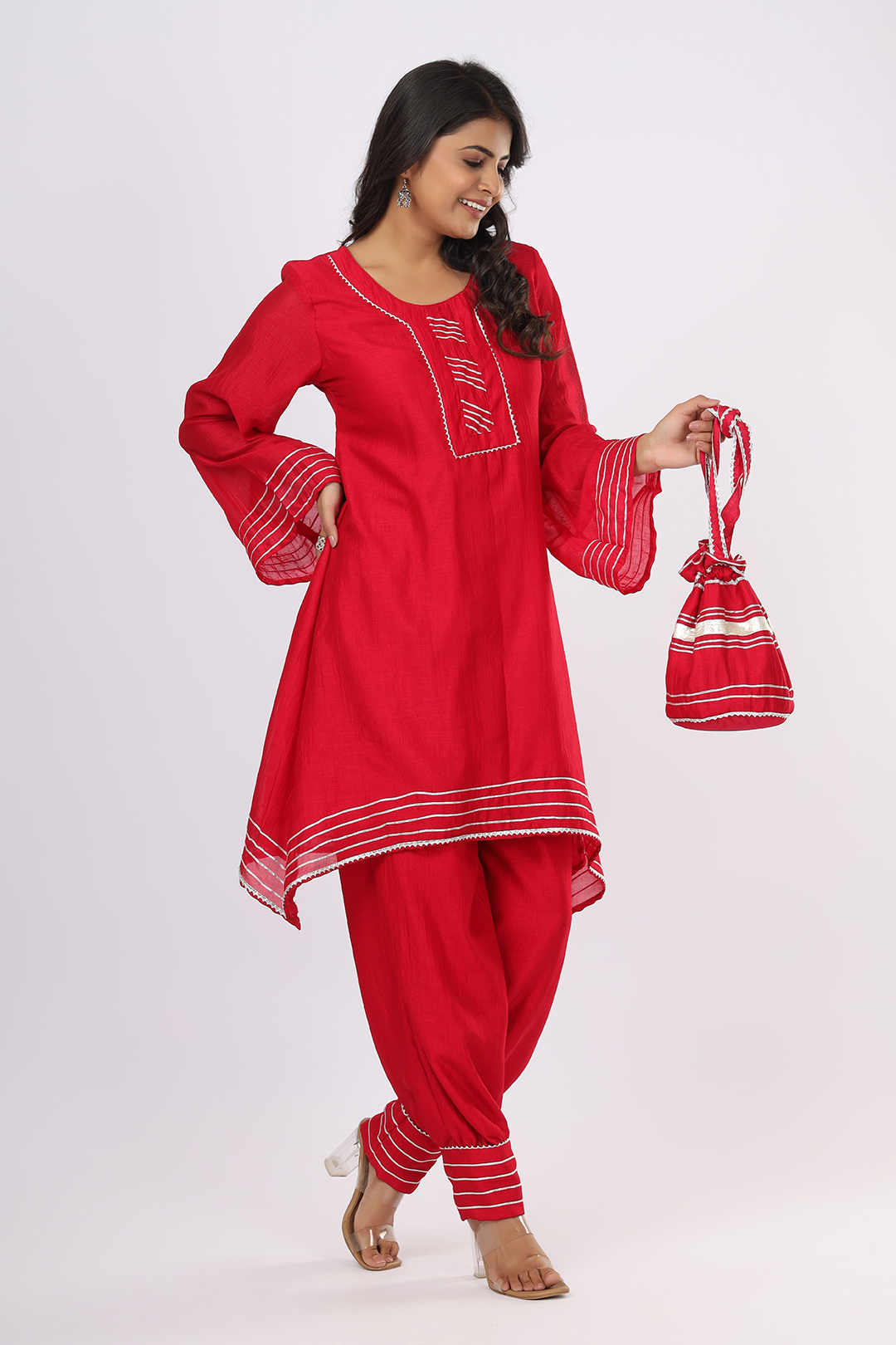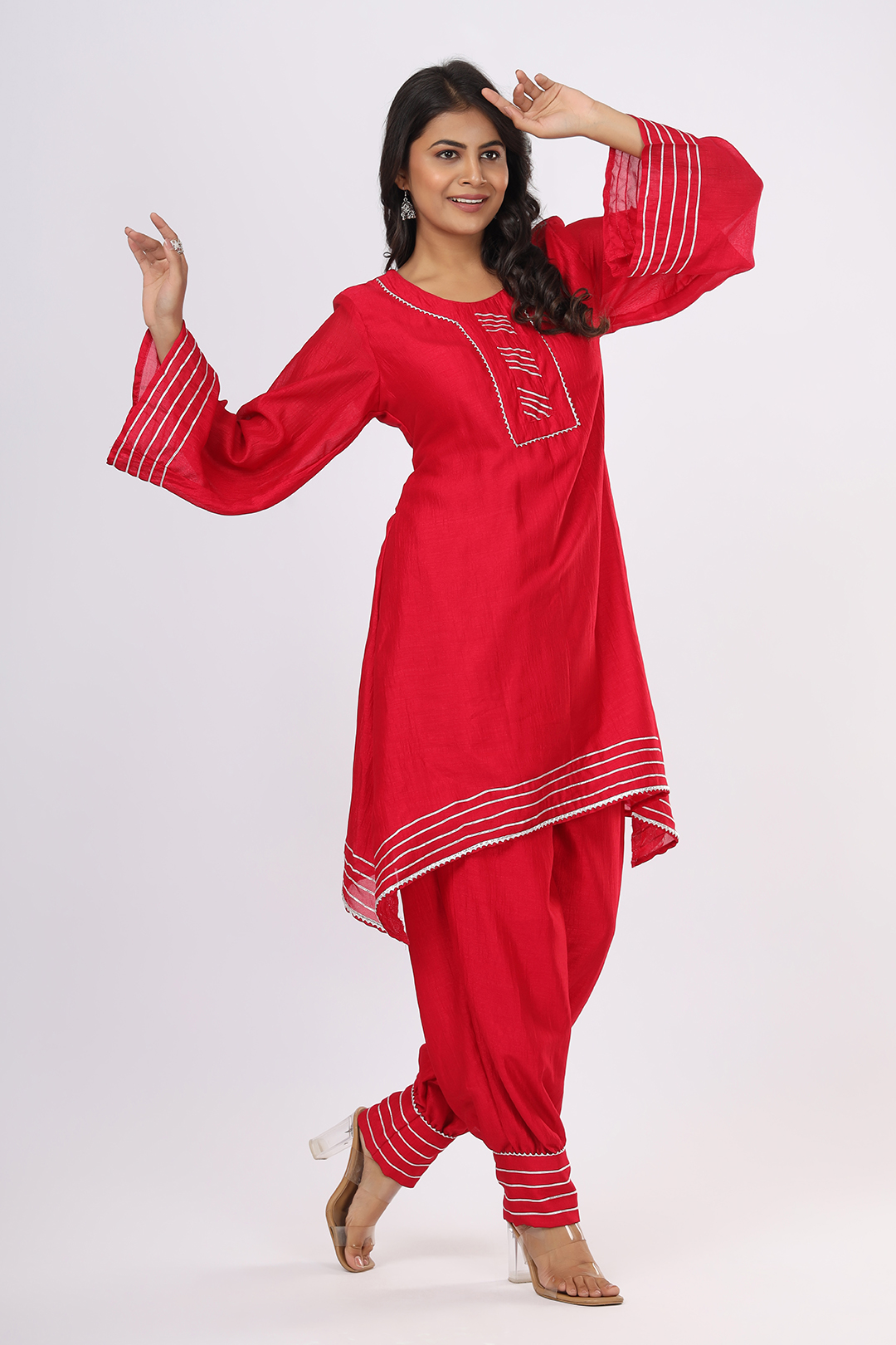 The outfit features a bell-sleeve kurta paired with a comfortable salwar, both beautifully enhanced with intricate gota work embellishments on the kurta, sleeves, and bottom.