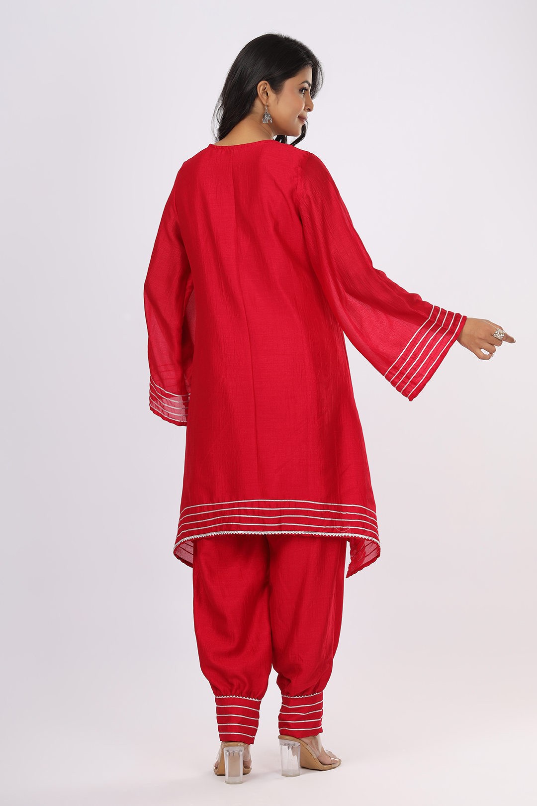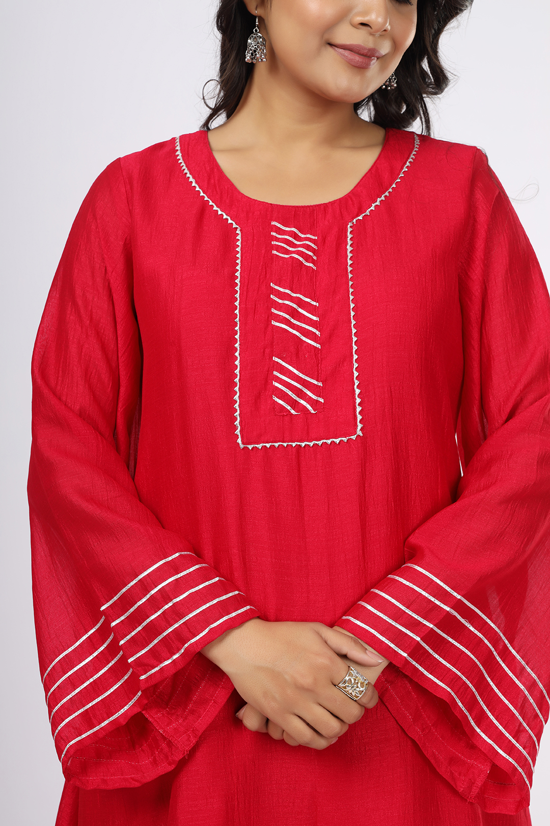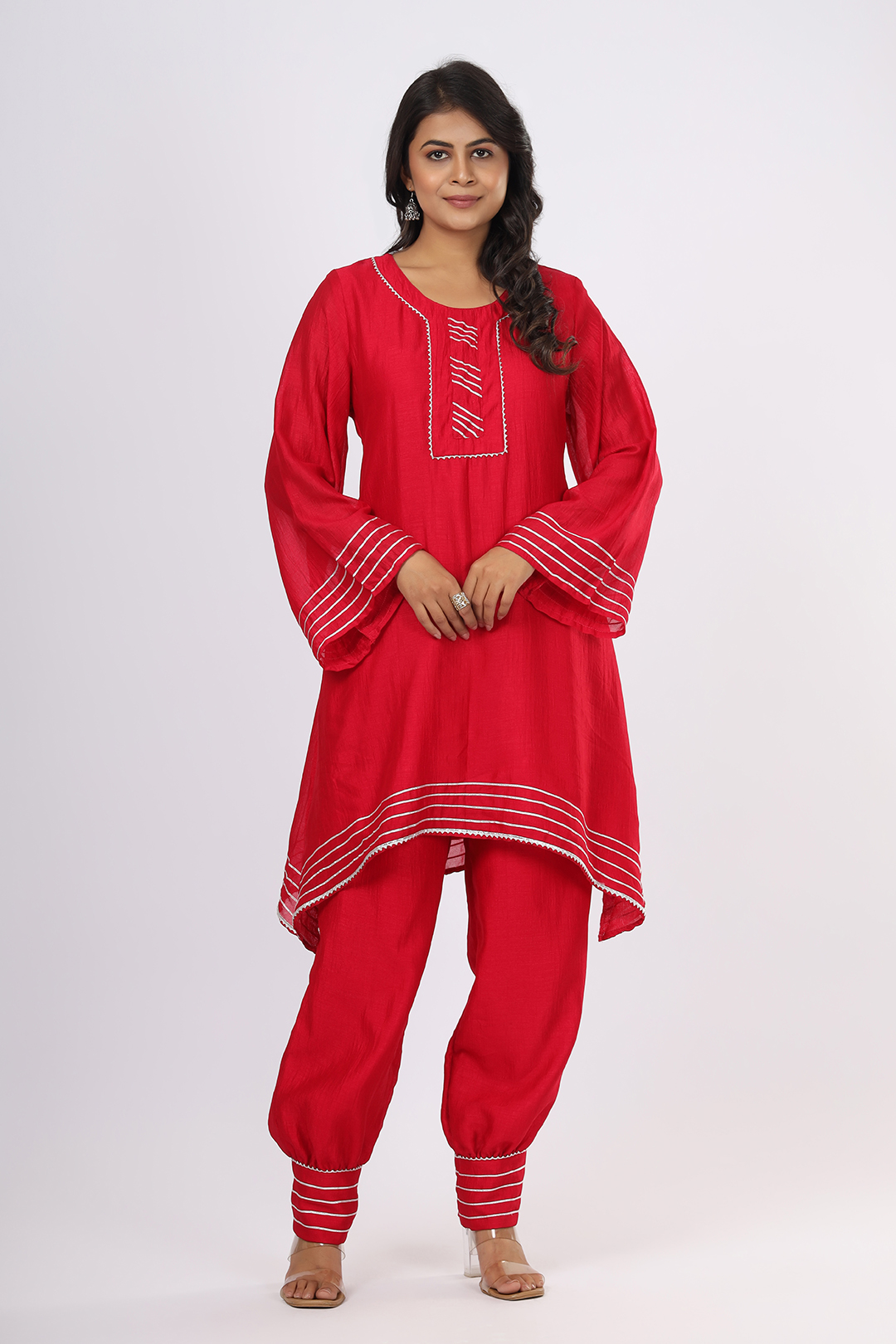 The outfit features a bell-sleeve kurta paired with a comfortable salwar, both beautifully enhanced with intricate gota work embellishments on the kurta, sleeves, and bottom.