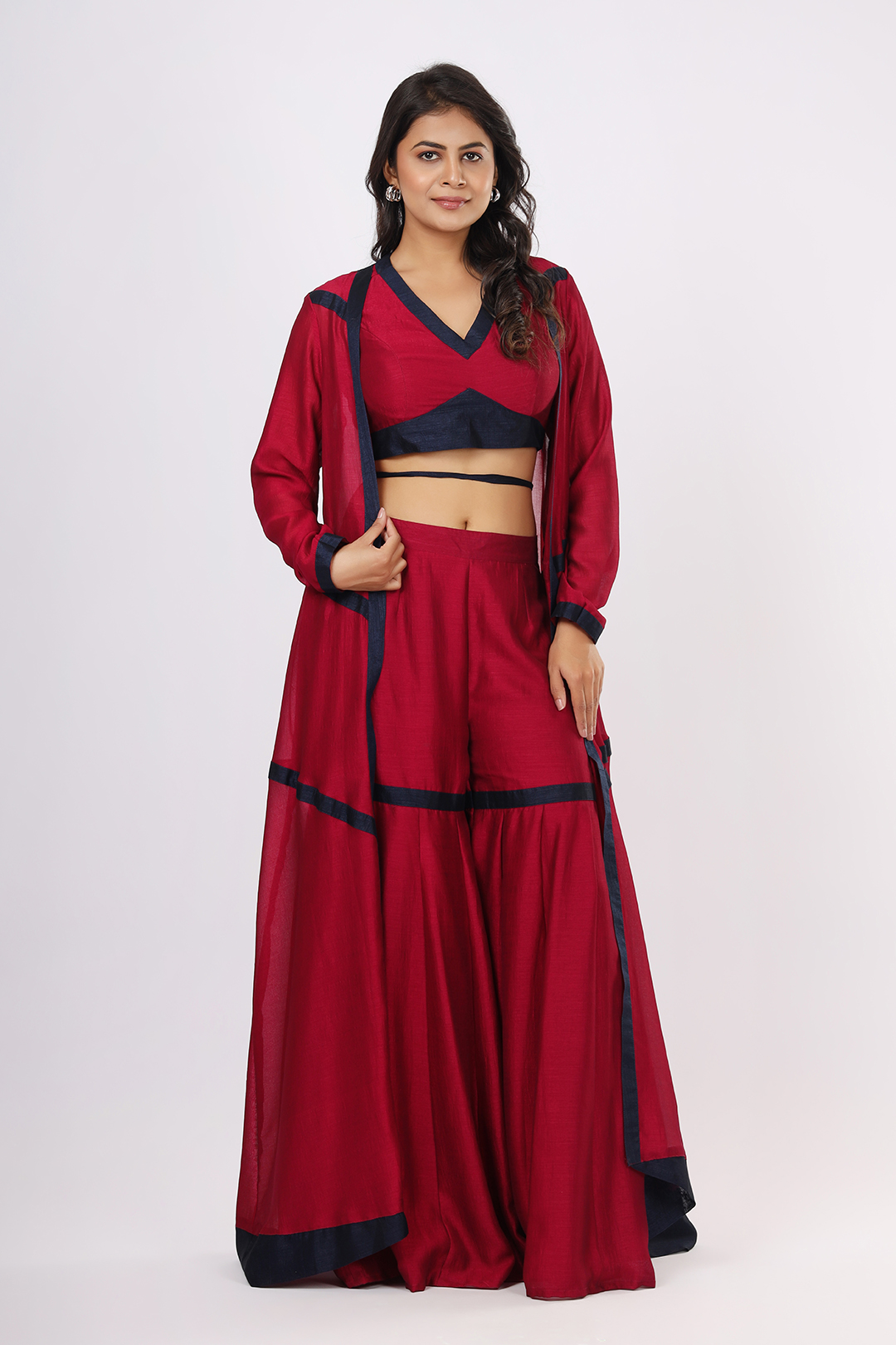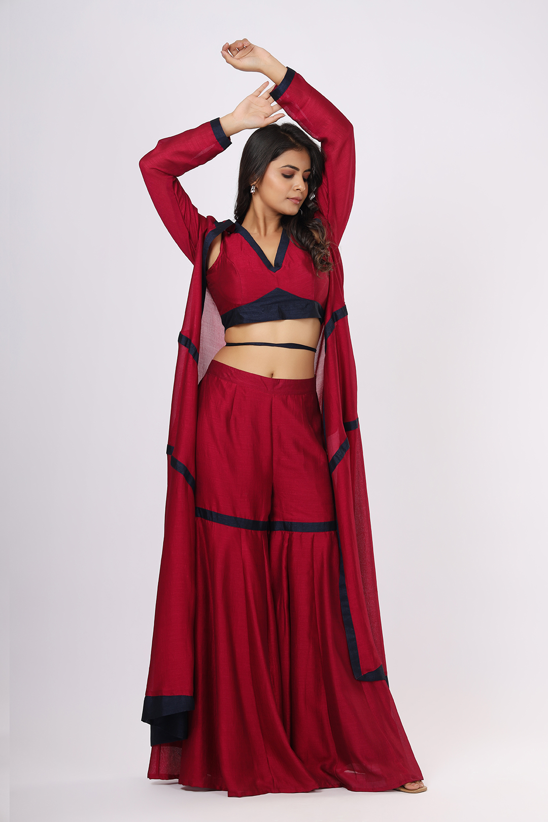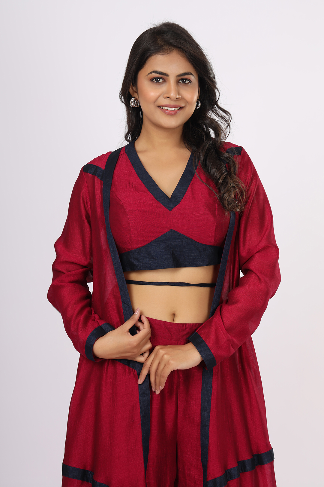 Designed in a rich Mulberry Purple shade, this set includes a stylish V-neck crop top, a flared panel palazzo, and a long shrug with pocket detailing—perfectly blending comfort, sophistication, and contemporary fashion.