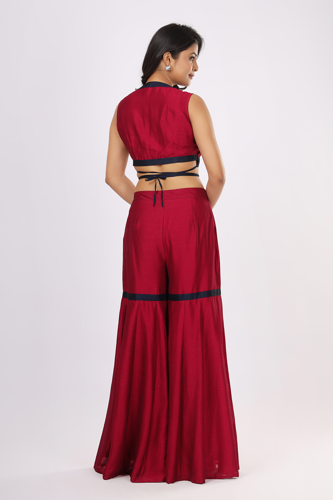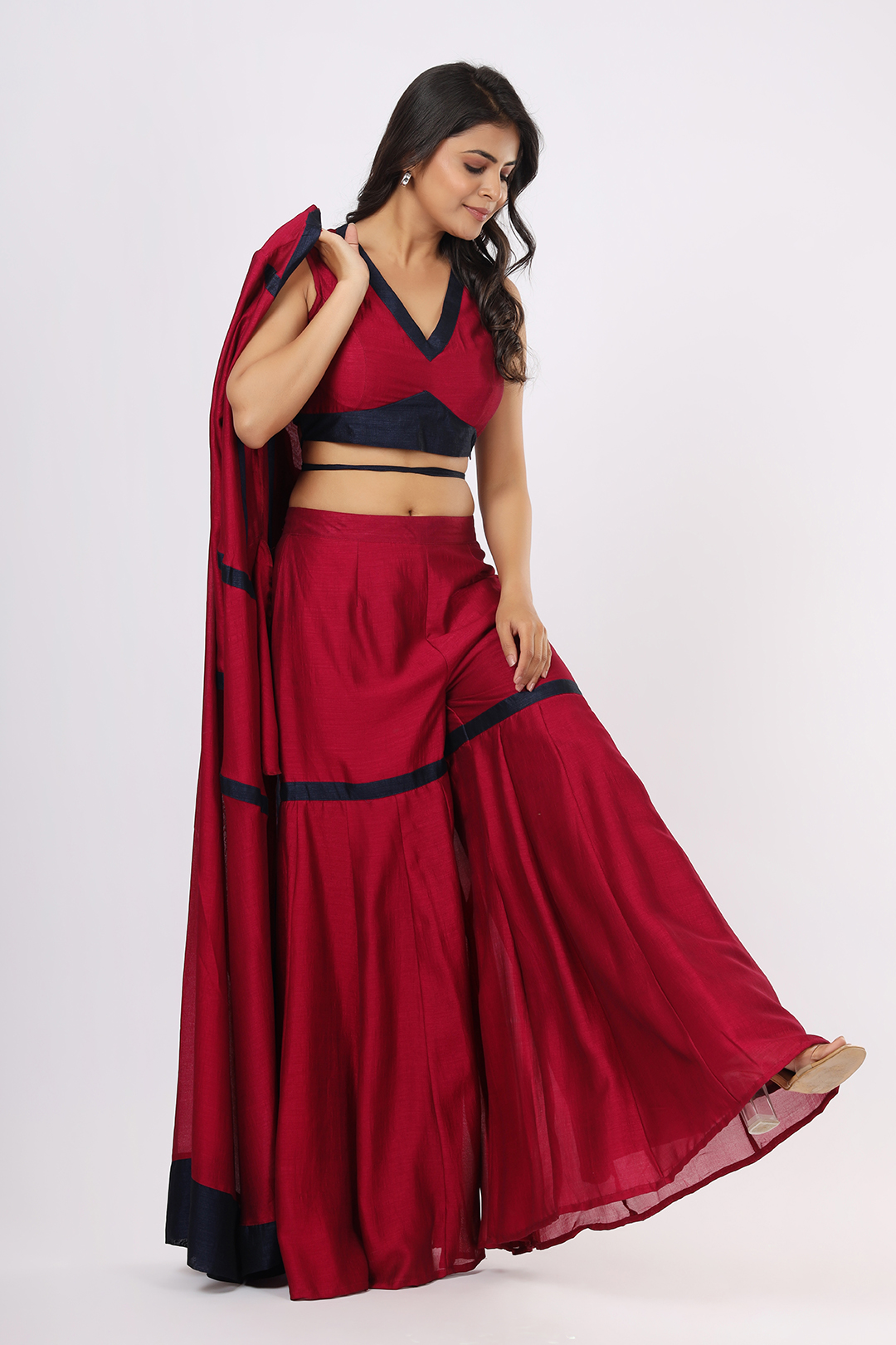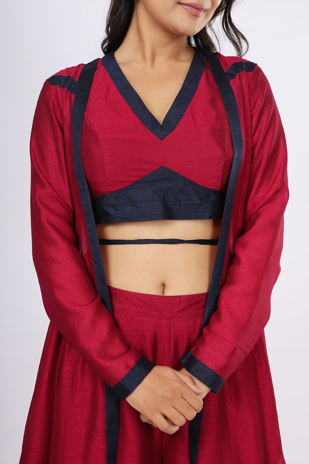 Designed in a rich Mulberry Purple shade, this set includes a stylish V-neck crop top, a flared panel palazzo, and a long shrug with pocket detailing—perfectly blending comfort, sophistication, and contemporary fashion.