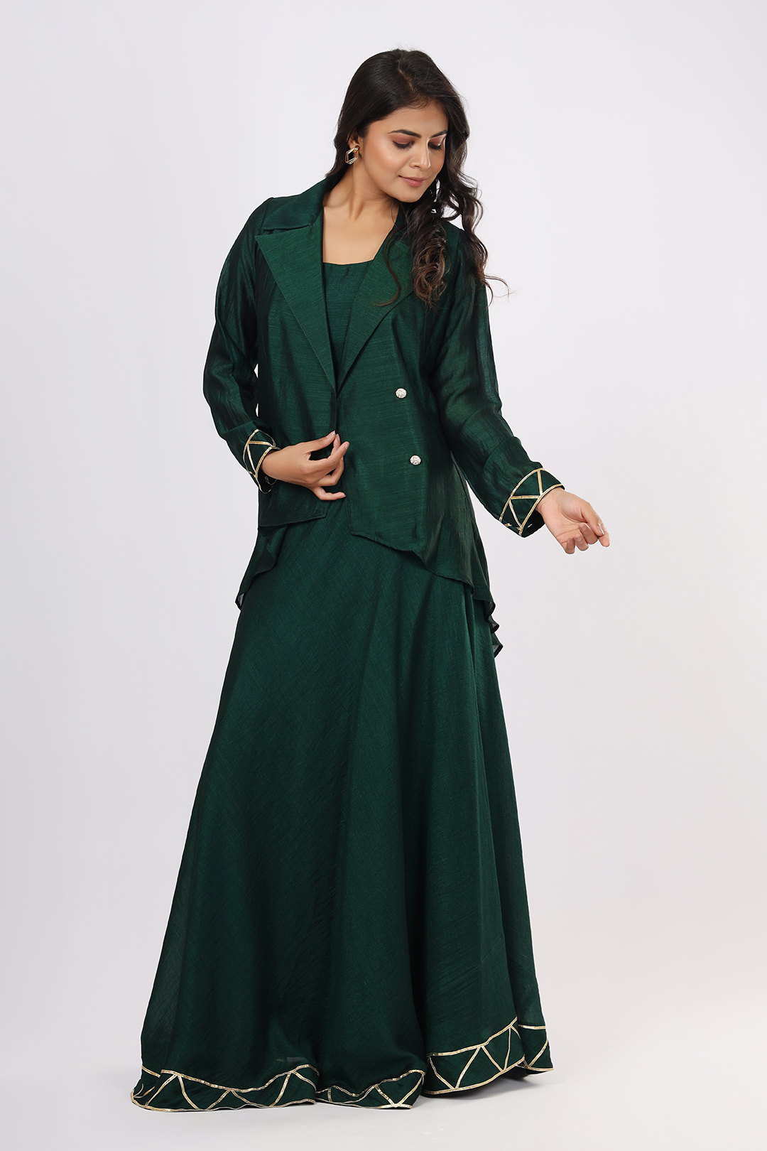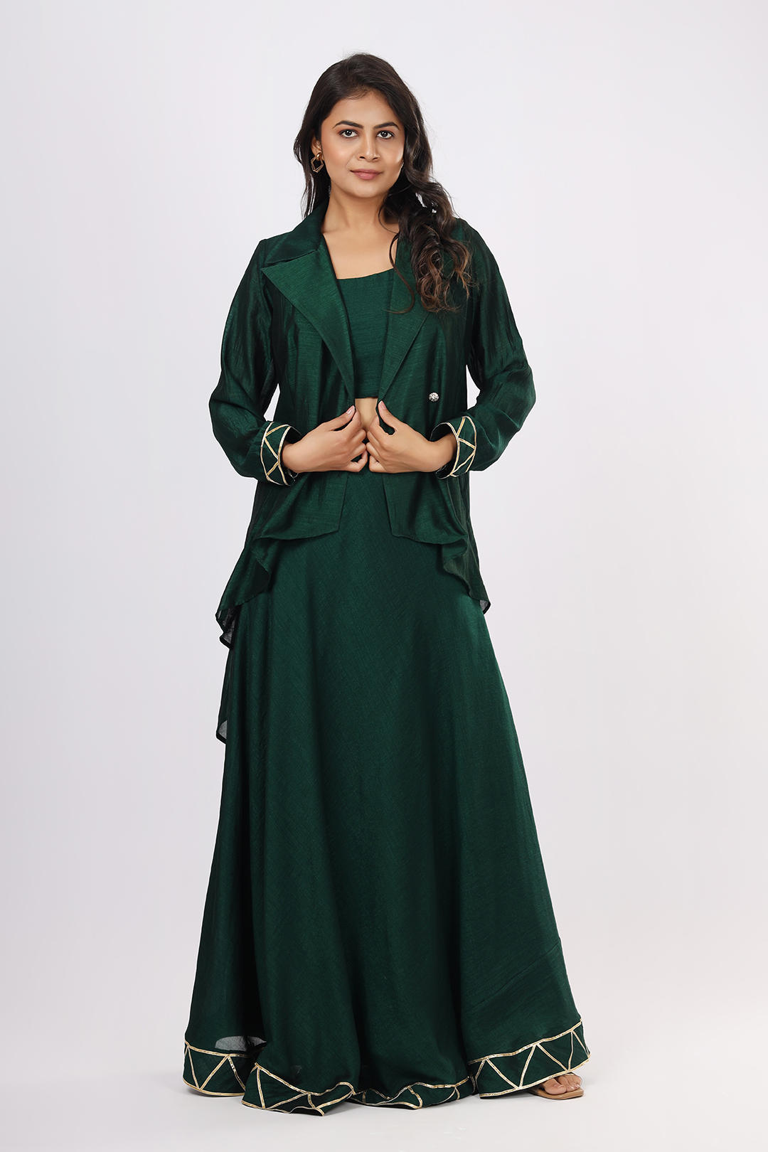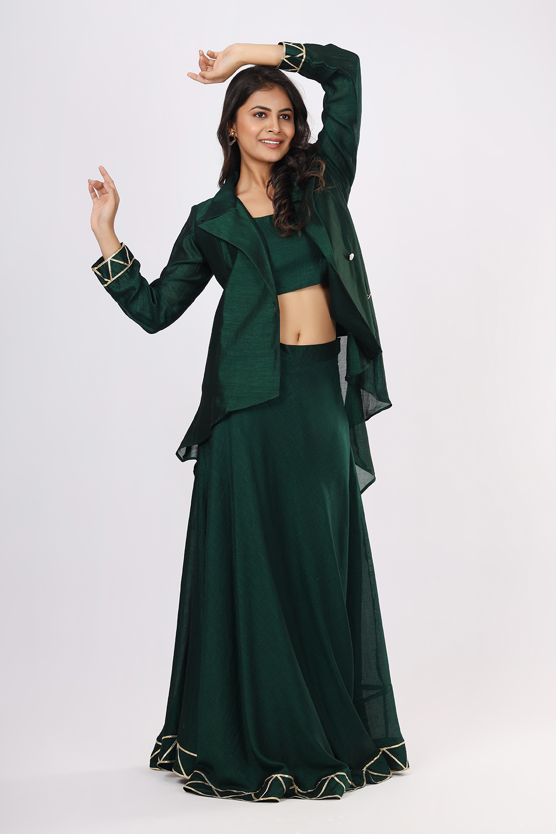 Designed in a deep Bottle Green shade, this ensemble includes a stylish tube top, a gracefully flared skirt, and a high-fashion overcoat style layer that adds structure and modern charm.