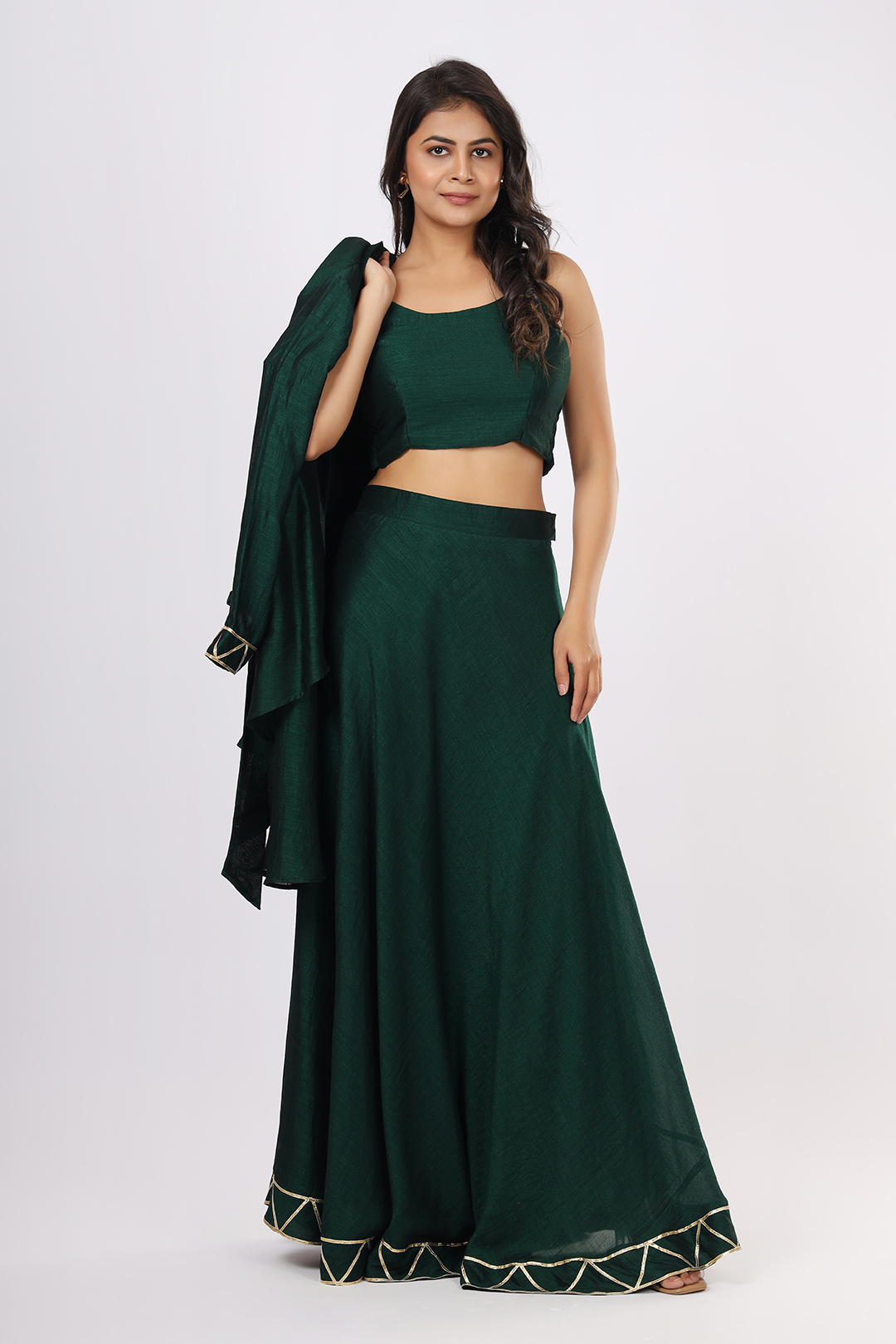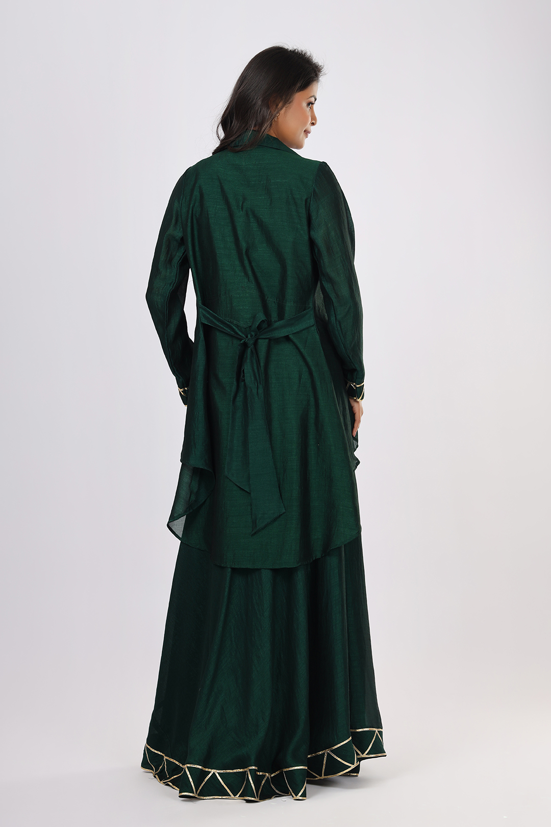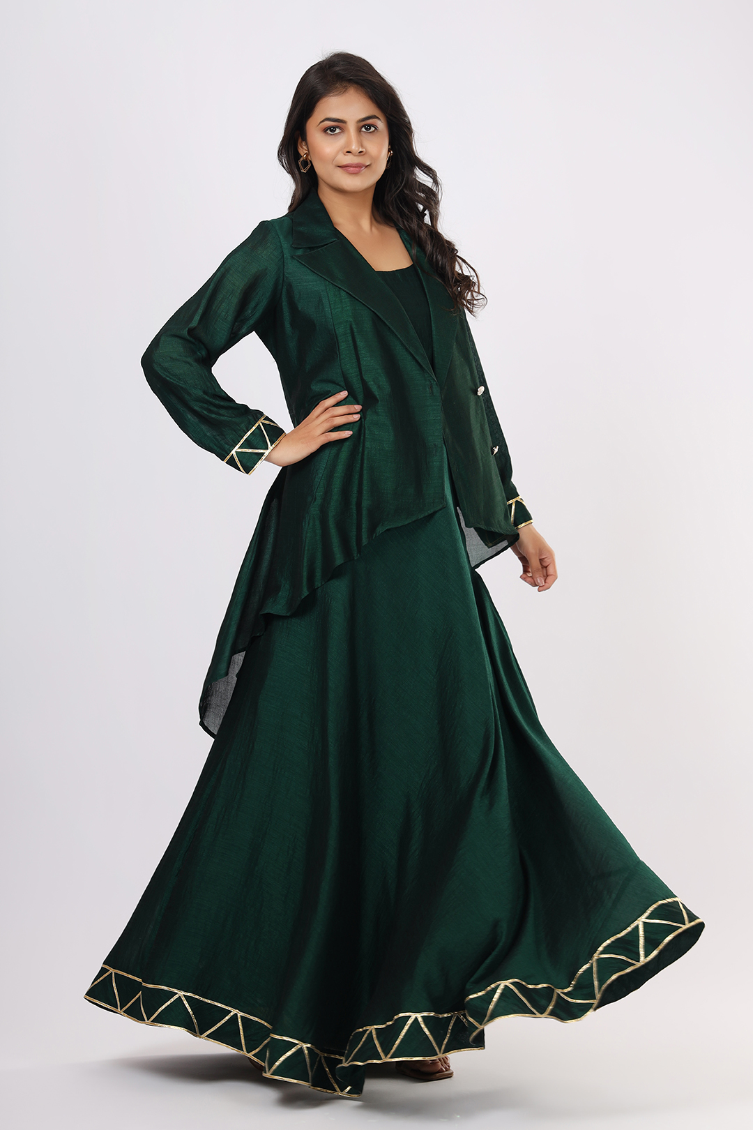 Designed in a deep Bottle Green shade, this ensemble includes a stylish tube top, a gracefully flared skirt, and a high-fashion overcoat style layer that adds structure and modern charm.