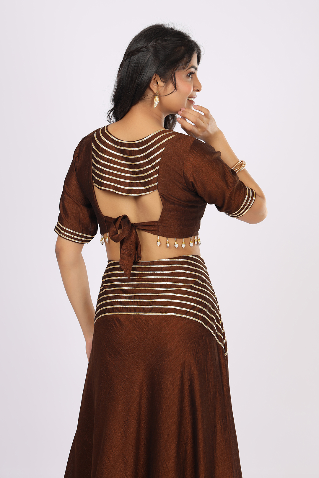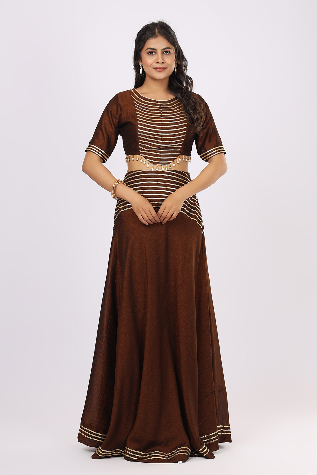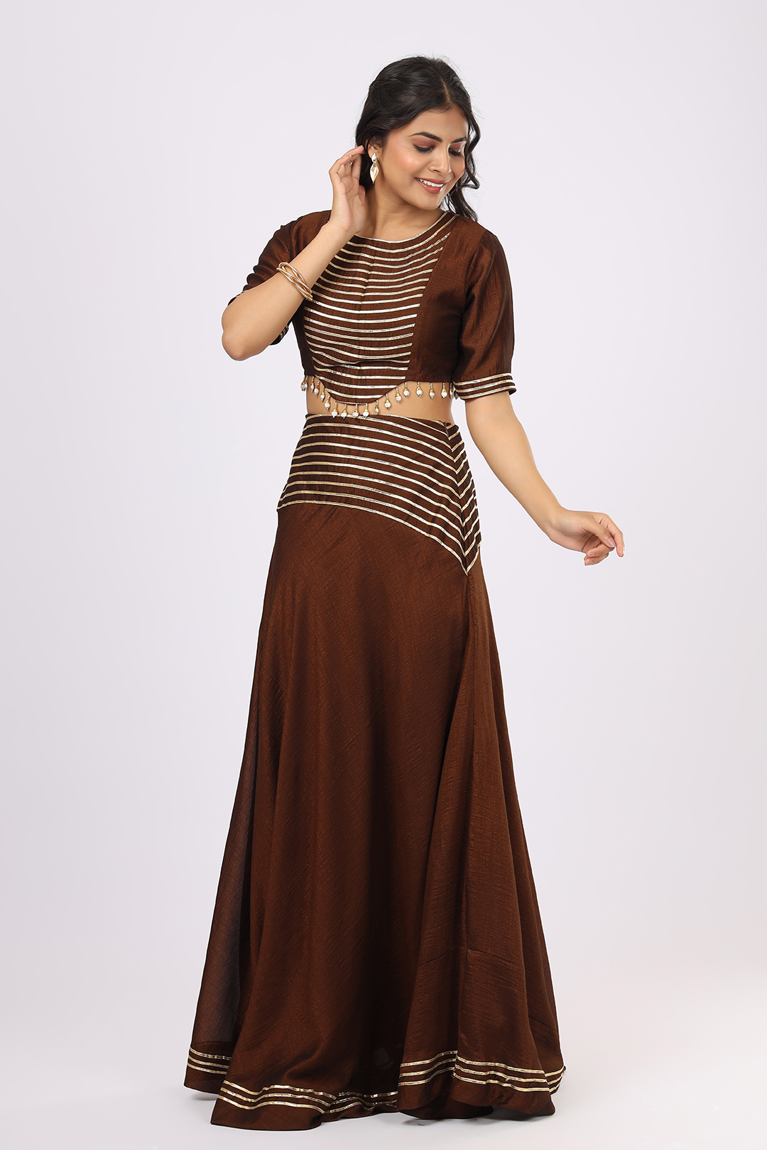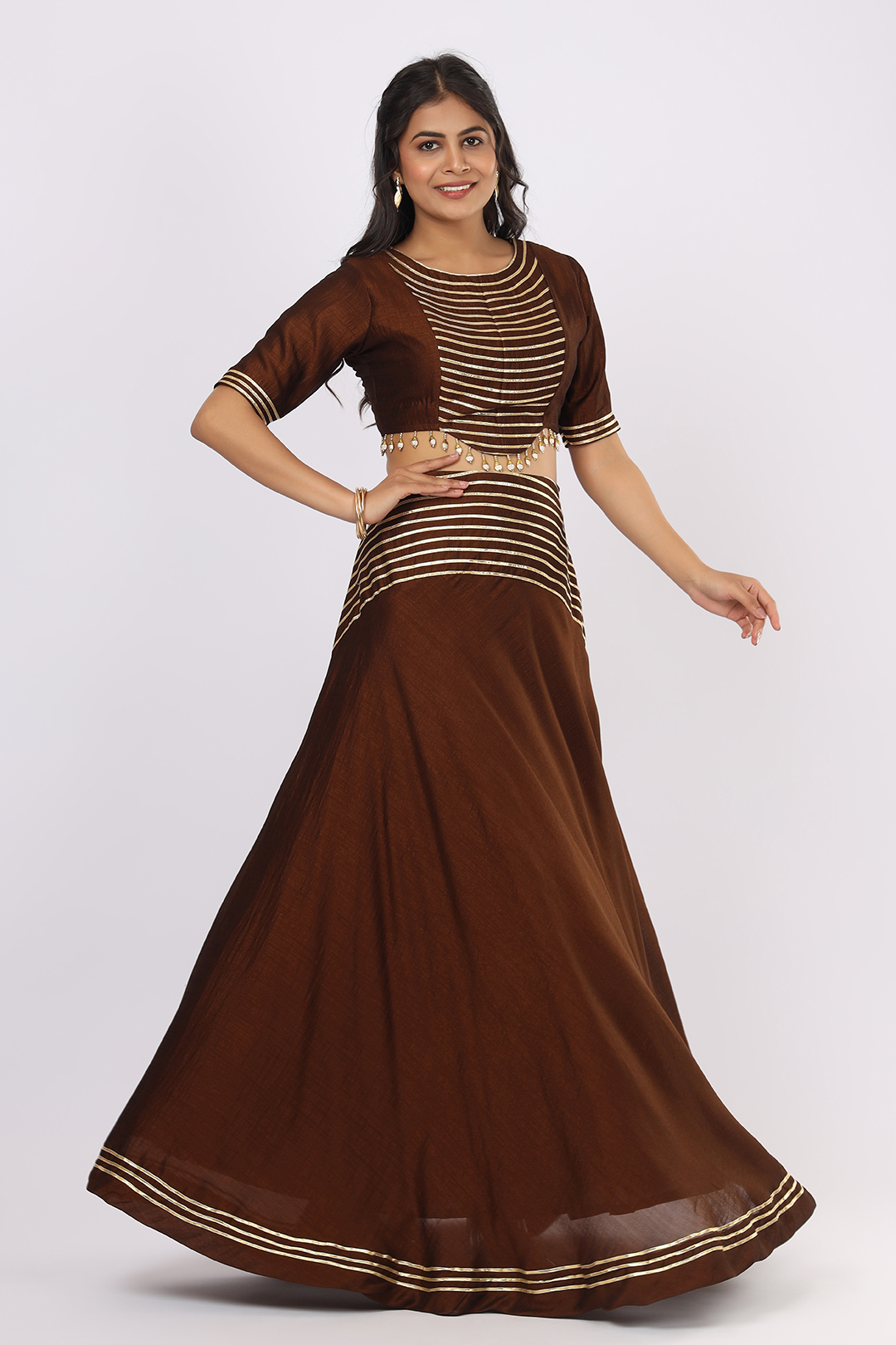 The warm Brown shade adds an earthy yet luxurious appeal, making it perfect for functions, celebrations, and premium ethnic styling.