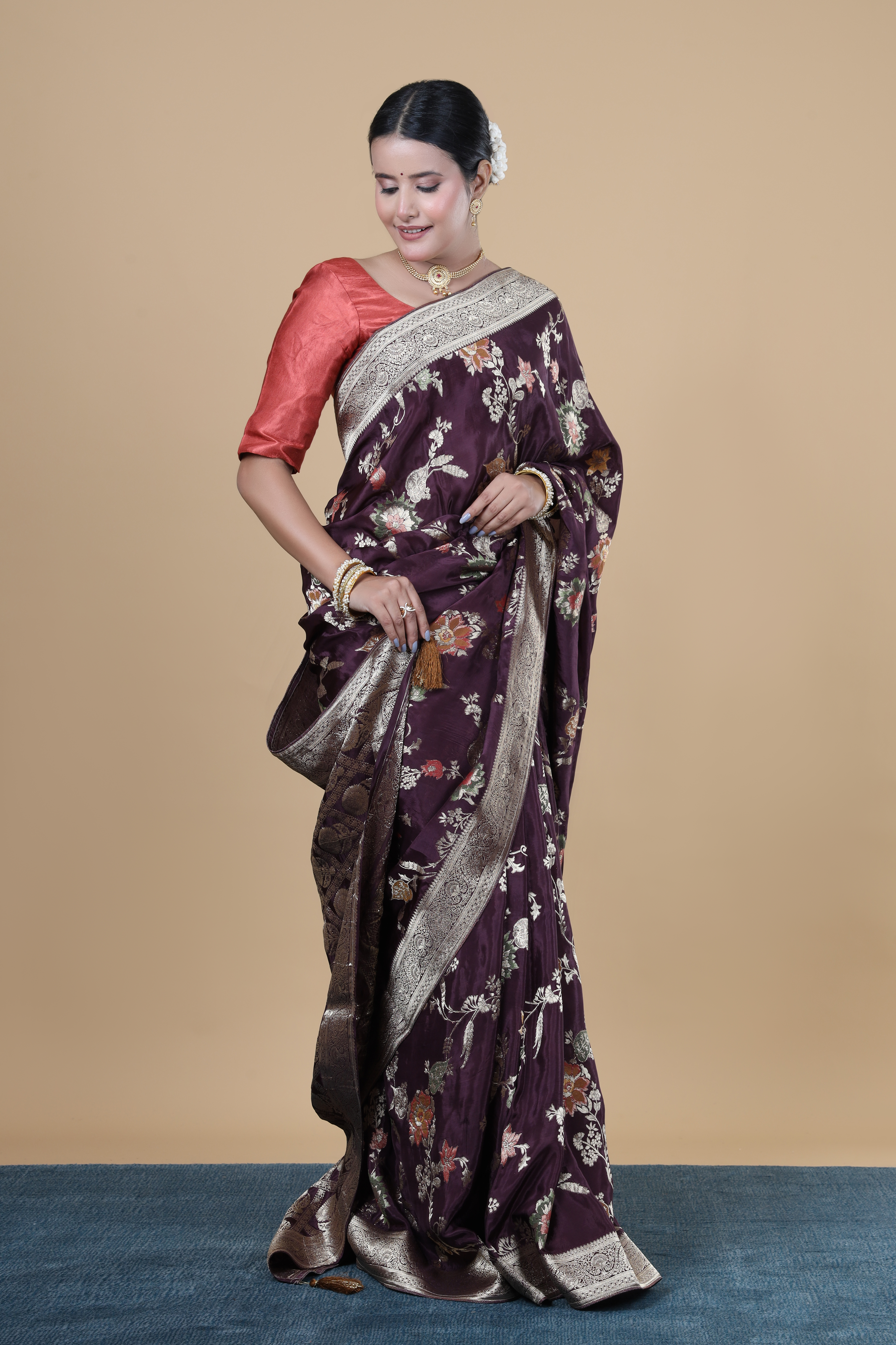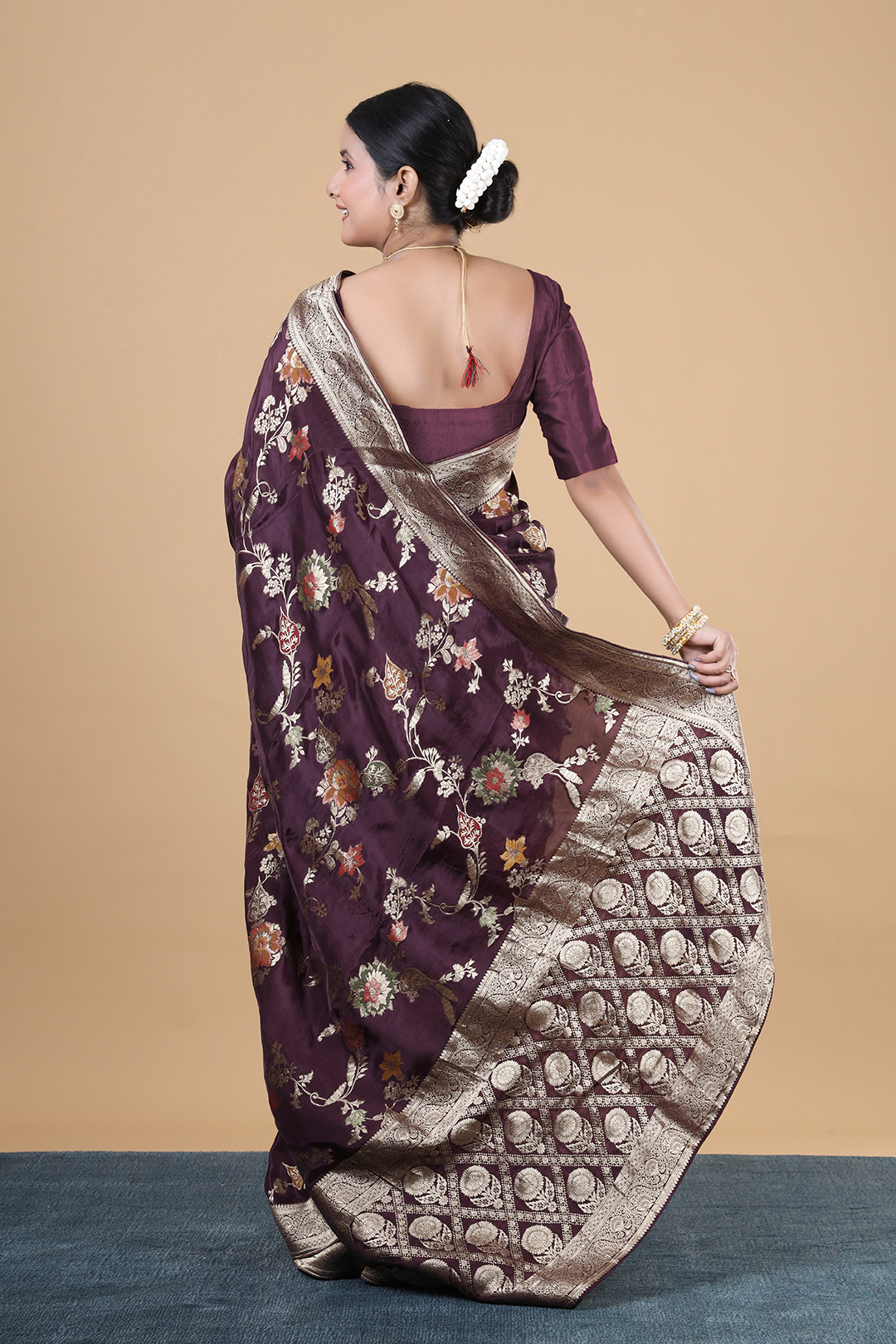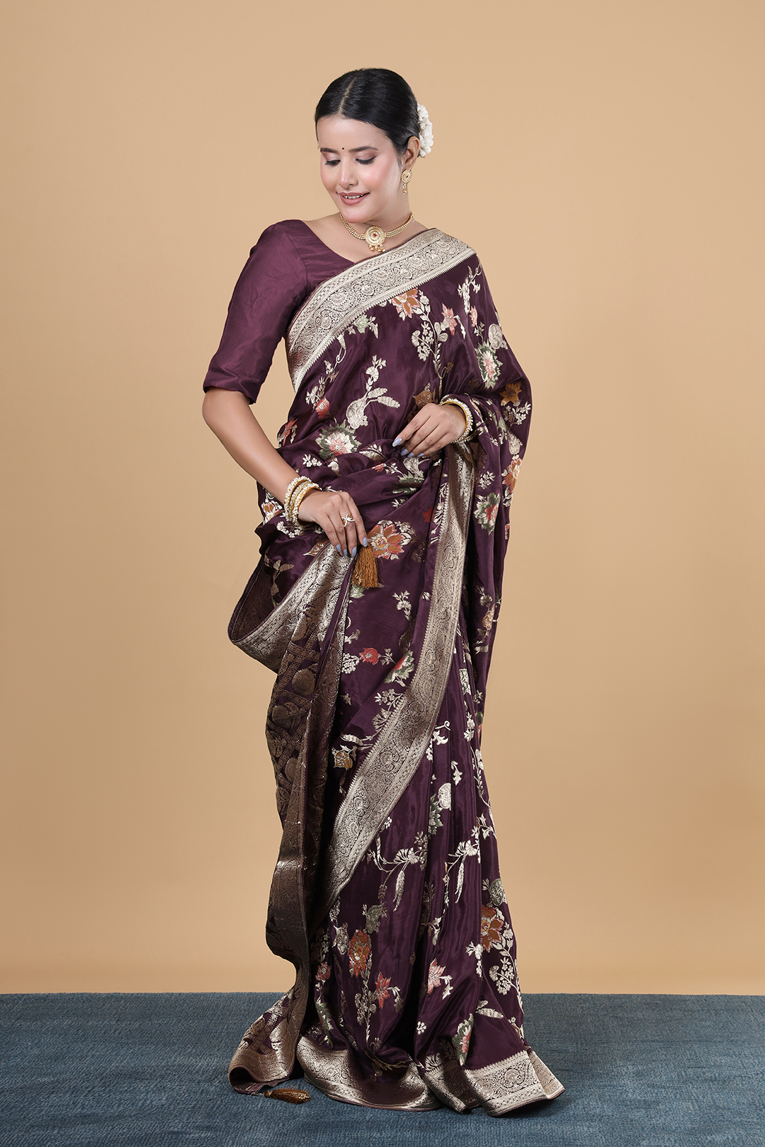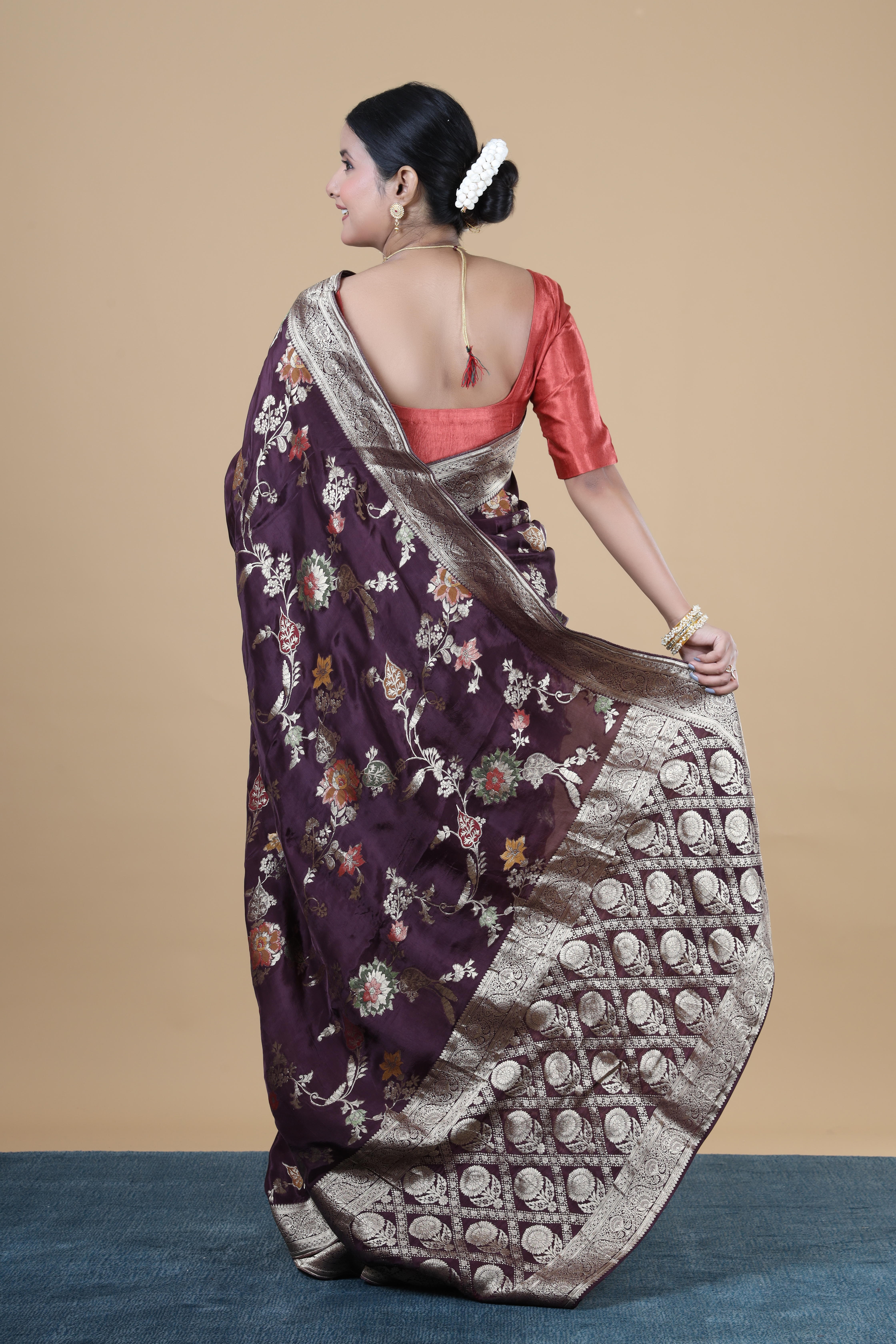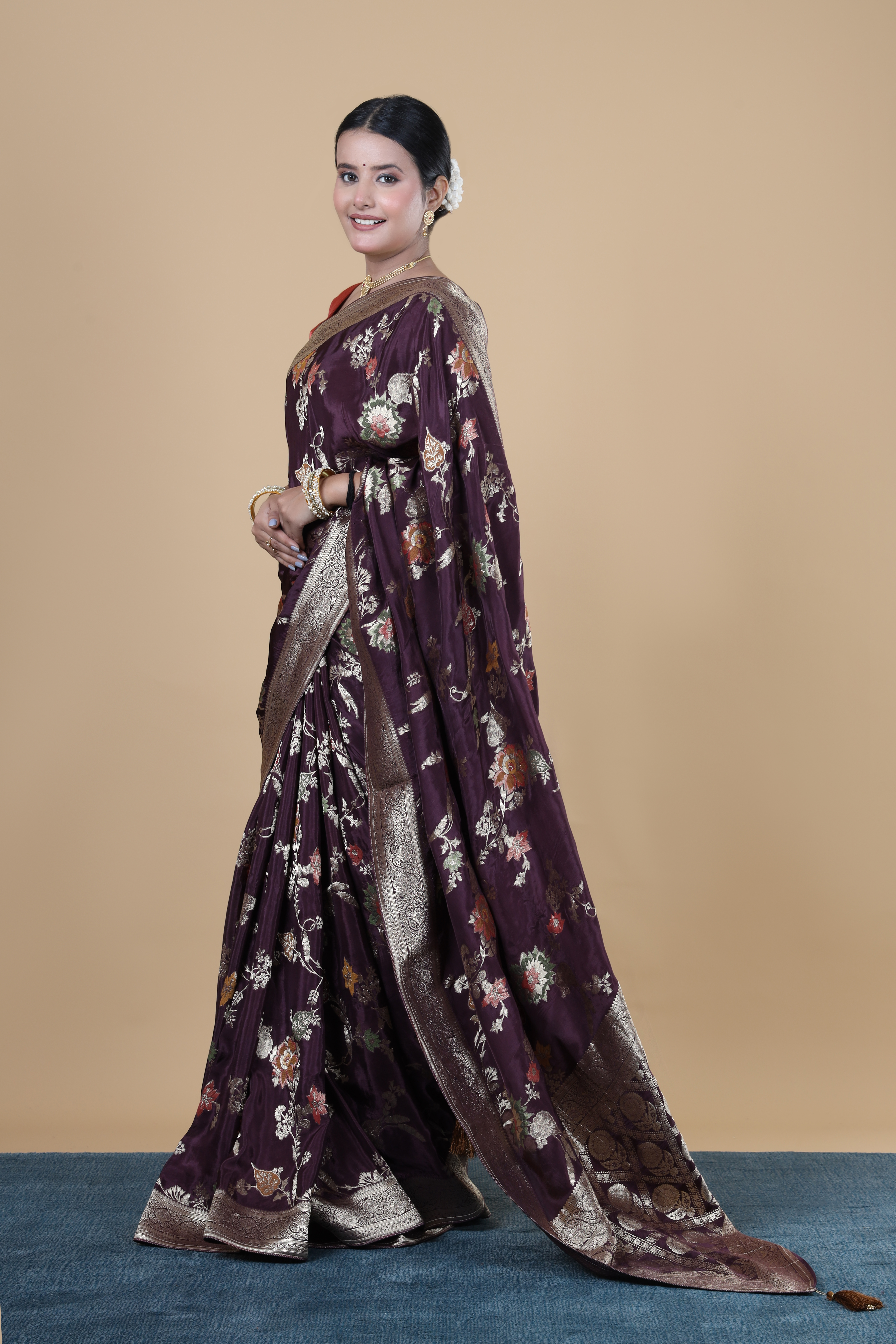 Bring a touch of elegance to your ethnic collection with this Wine H.O. Flower Jal Print Saree featuring a delicate zari border. The intricate floral jal print adds charm and sophistication, making it a standout choice for festive occasions, weddings, and special celebrations.